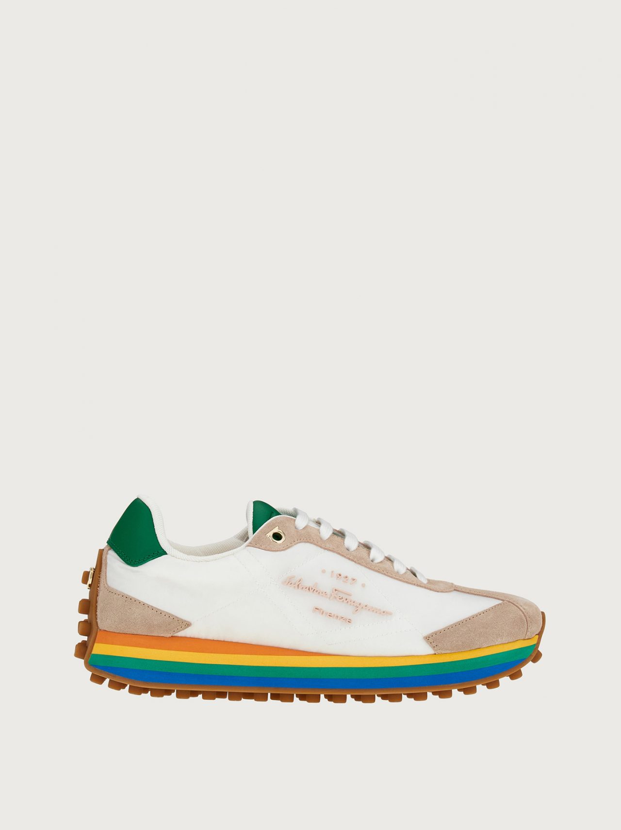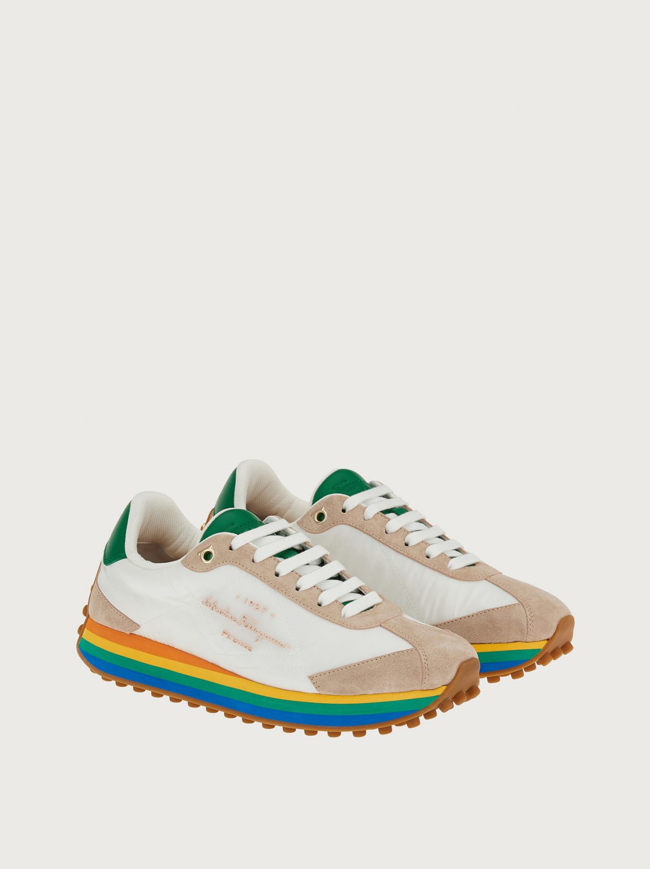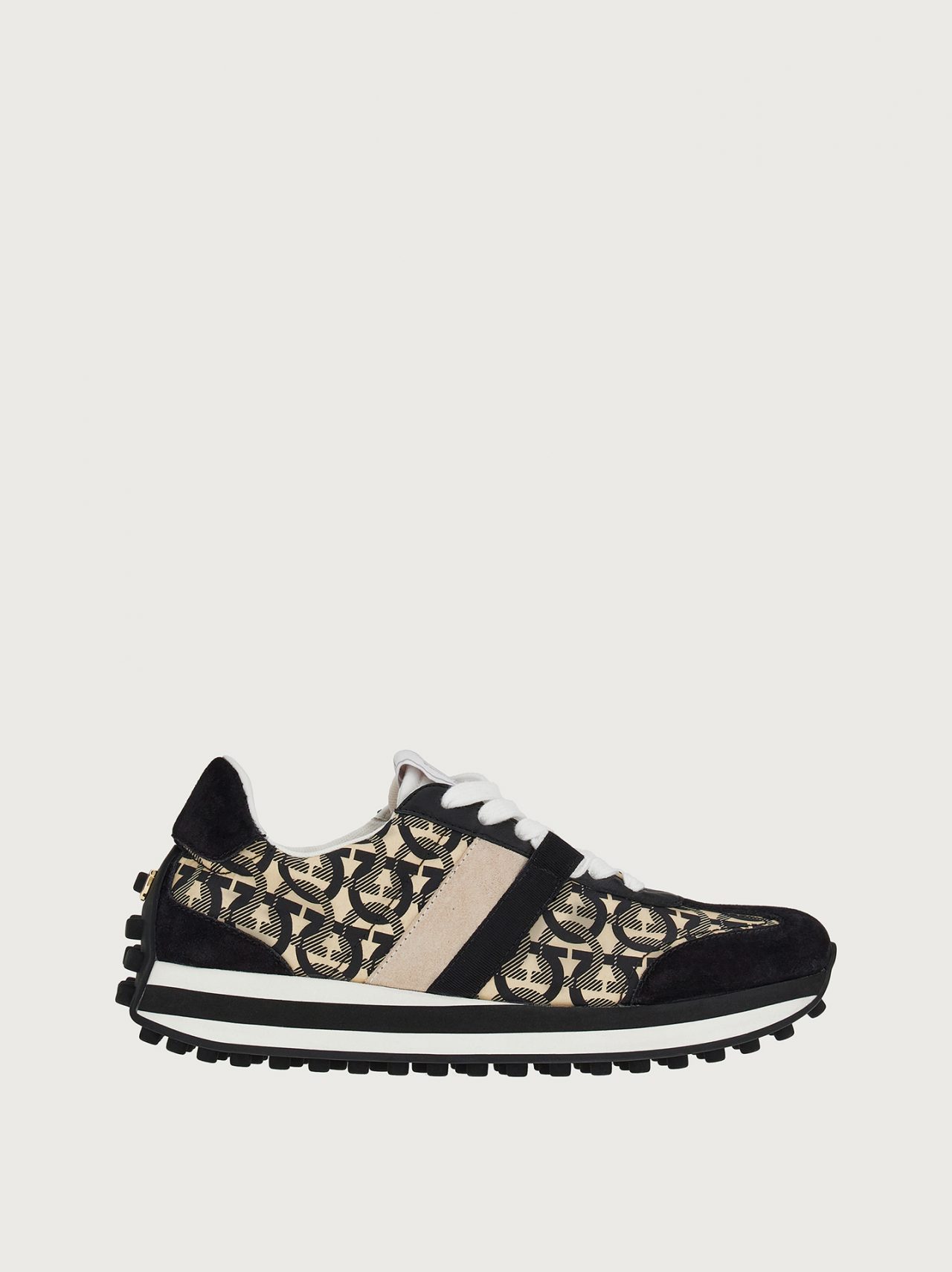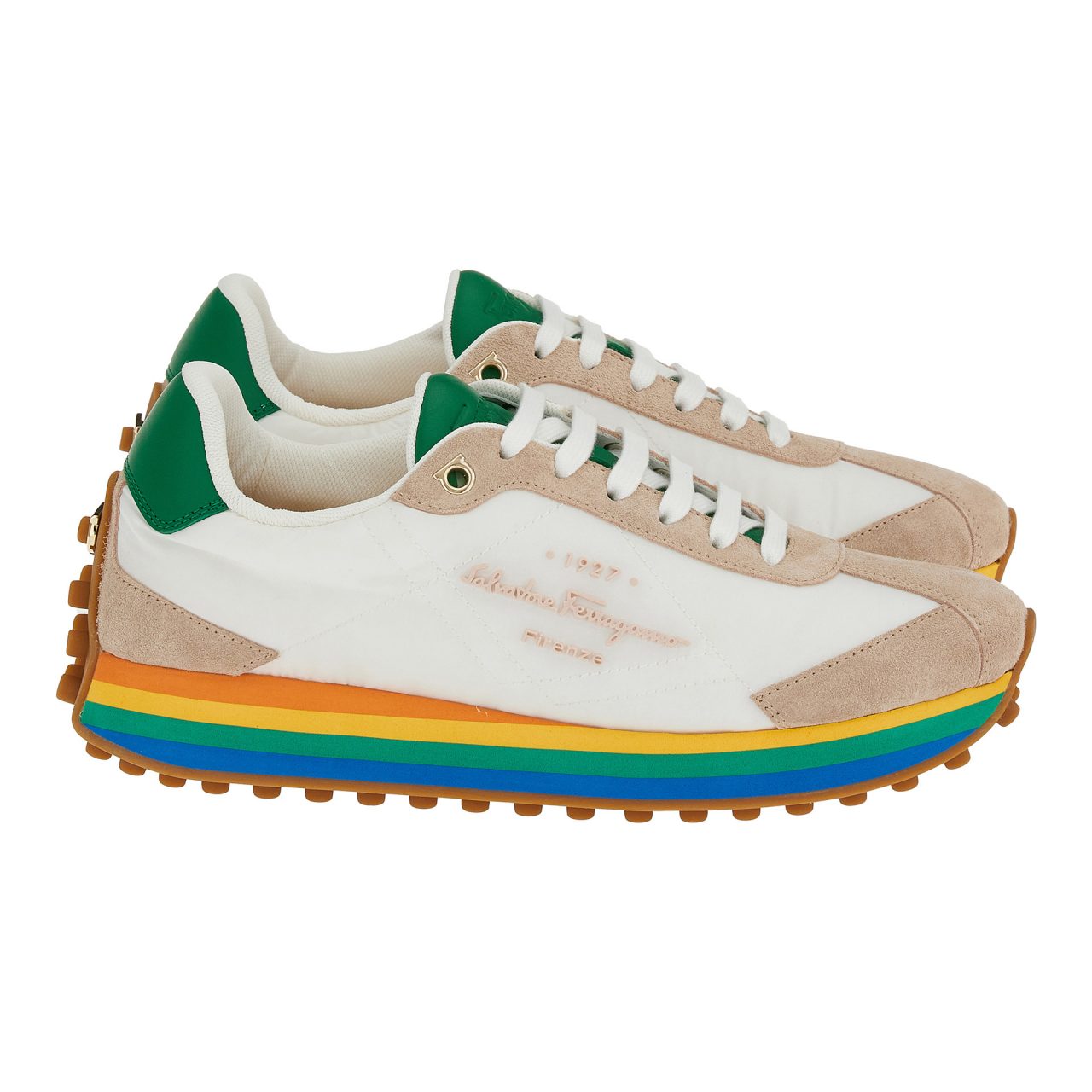 本コレクションでは、レインボーパレットを用いたソールが特徴的なモデル、ガンチーニ柄が全体的にあしらわれたモデルなど豊富なバリエーションが展開。ファブリックやスエード、レザーなど異素材の組み合わせ、ラバーのミッドソール、つま先からかかと深くまで配させたスパイク付きのソールなど特徴的な要素が、それぞれの魅力を引き立てている。洗練されたデザイン、そして軽やかで心地よい履き心地の両方を叶えたスニーカーは、Salvatore Ferragamo が誇るクラフツマンシップを感じられる渾身の一足だ。