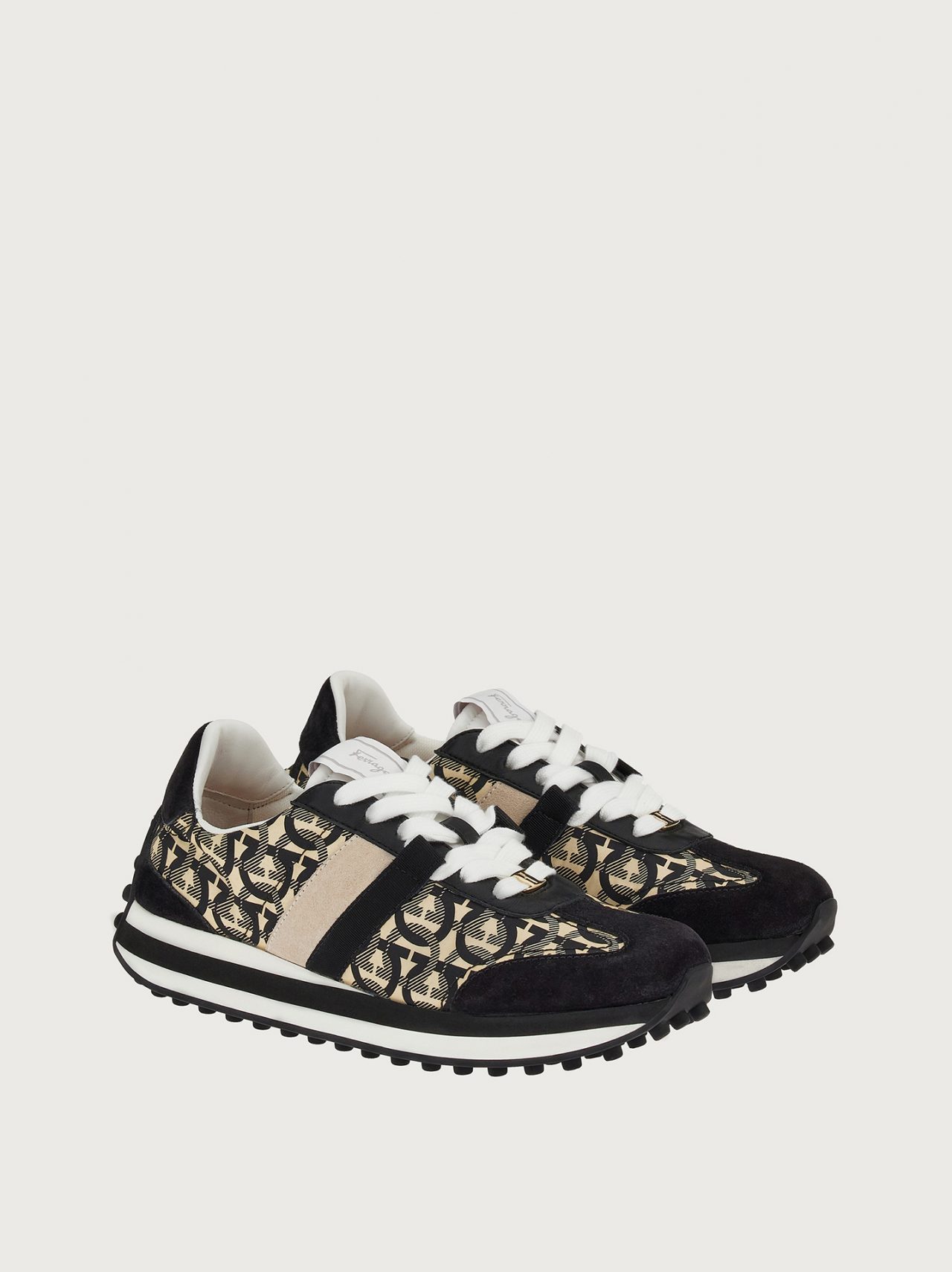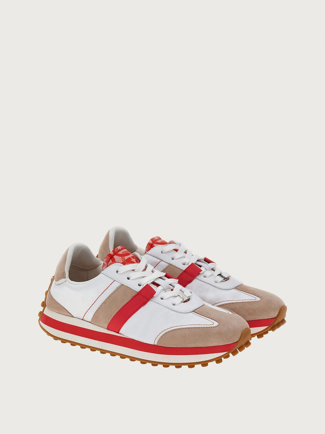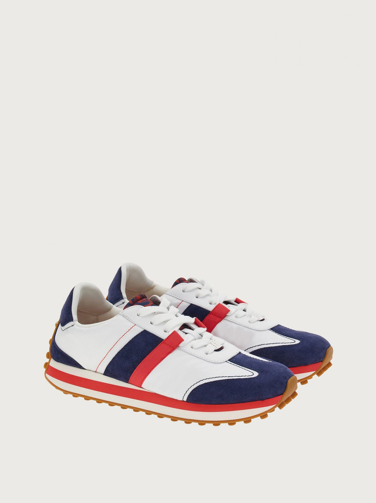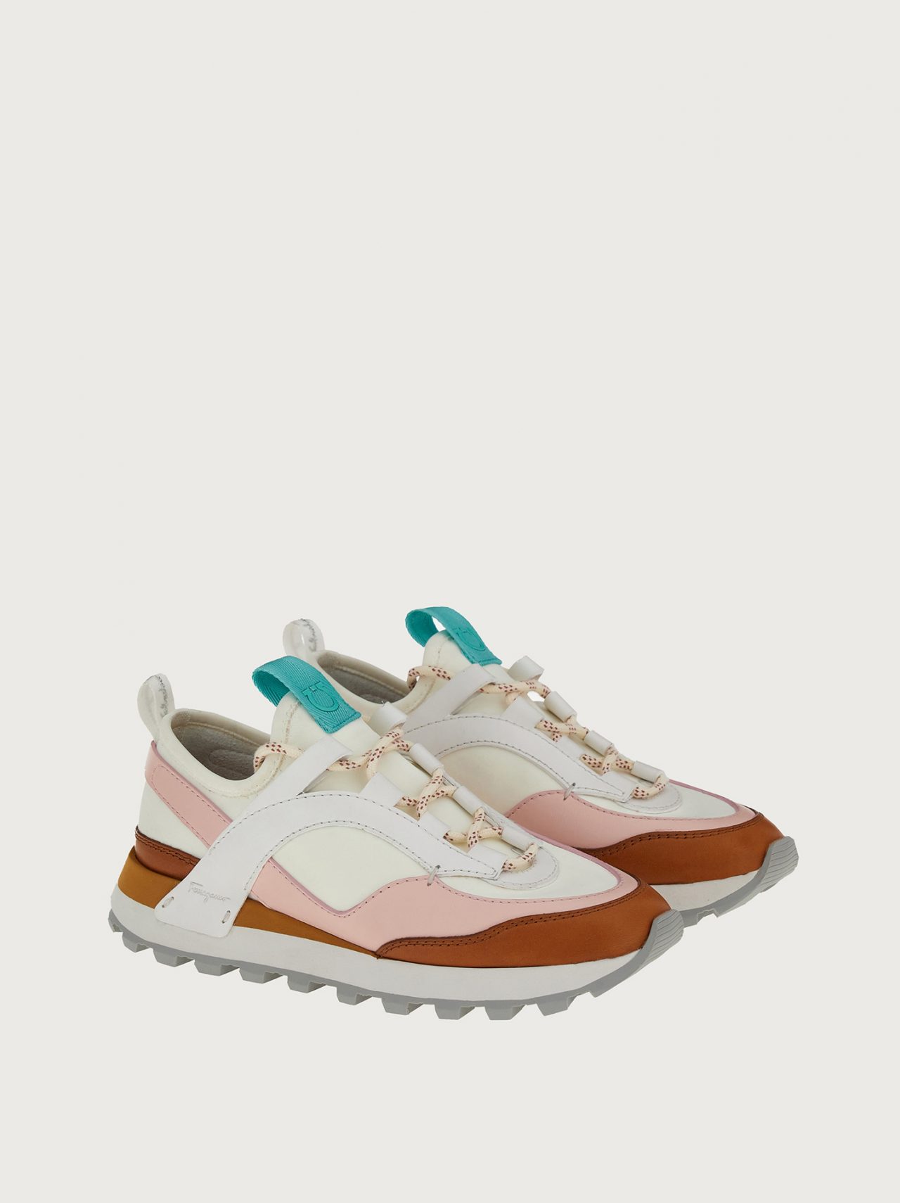 本コレクションでは、レインボーパレットを用いたソールが特徴的なモデル、ガンチーニ柄が全体的にあしらわれたモデルなど豊富なバリエーションが展開。ファブリックやスエード、レザーなど異素材の組み合わせ、ラバーのミッドソール、つま先からかかと深くまで配させたスパイク付きのソールなど特徴的な要素が、それぞれの魅力を引き立てている。洗練されたデザイン、そして軽やかで心地よい履き心地の両方を叶えたスニーカーは、Salvatore Ferragamo が誇るクラフツマンシップを感じられる渾身の一足だ。
