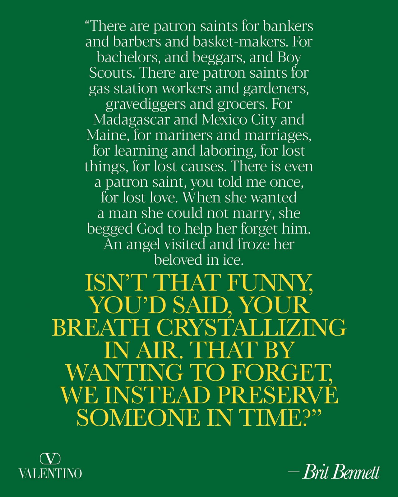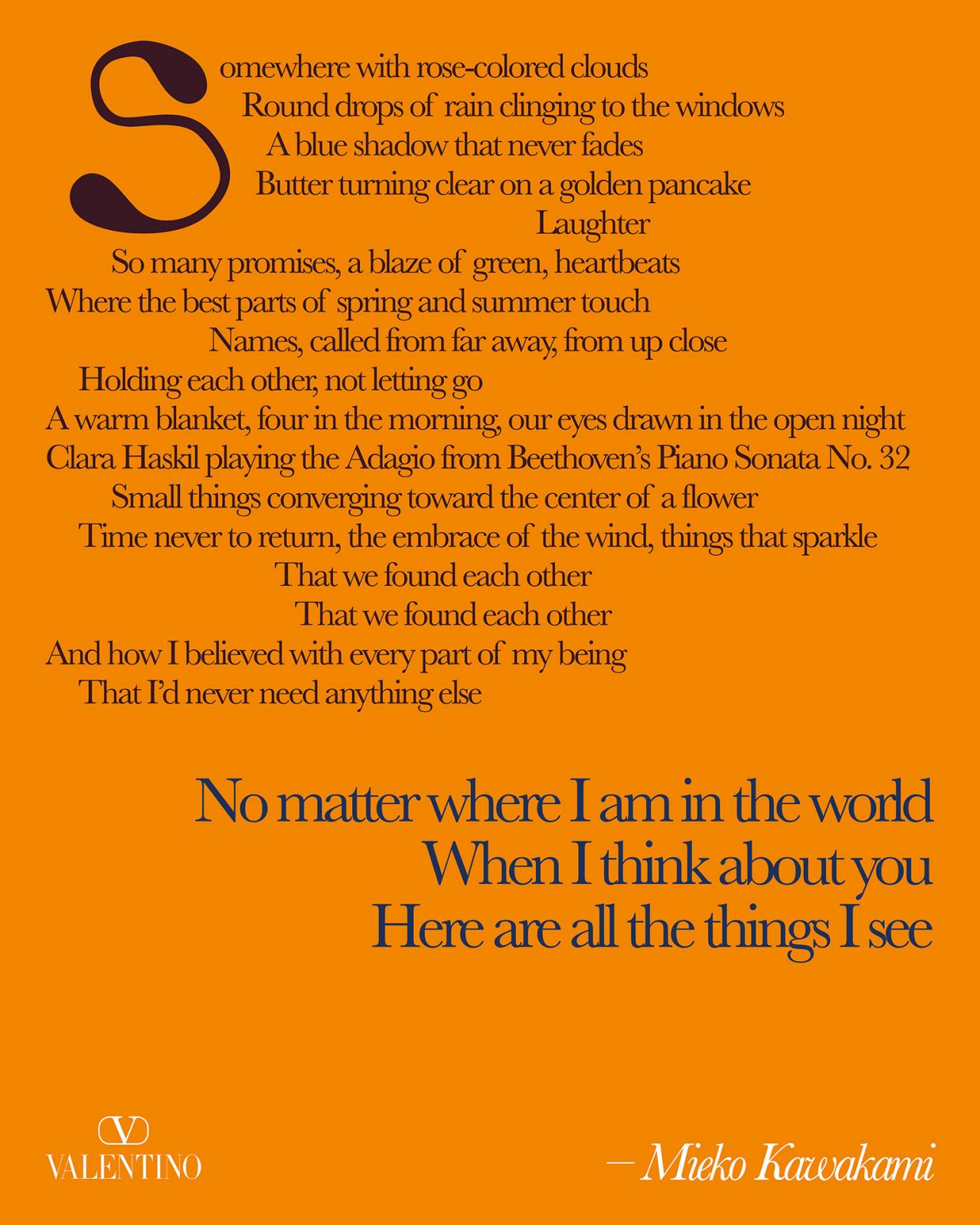 Valentino (ヴァレンティノ) が2021年よりスタートした文字のみを用いたキャンペーン「VALENTINO THE NARRATIVES (ヴァレンティノ ザ ナラティブ) 」。この実験的なキャンペーンの第二章「VALENTINO THE NARRATIVES Ⅱ」では、クリエイティブ・ディレクターの Pierpaolo Piccioli (ピエールパオロ・ピッチョーリ) が世界的に有名な作家たち17人を招き、Michael Cunningham (マイケル・カニンガム) や Emily Ratajkowski (エミリー・ラタコウスキー) 、日本からは芥川賞、谷崎賞、紫式部賞をはじめ数々の文学賞を受賞した作家の川上未映子が参加。作家や詩人たちが持ち寄ったあらゆる形態、あらゆる意味の「愛」が、本キャンペーンのために表現された。