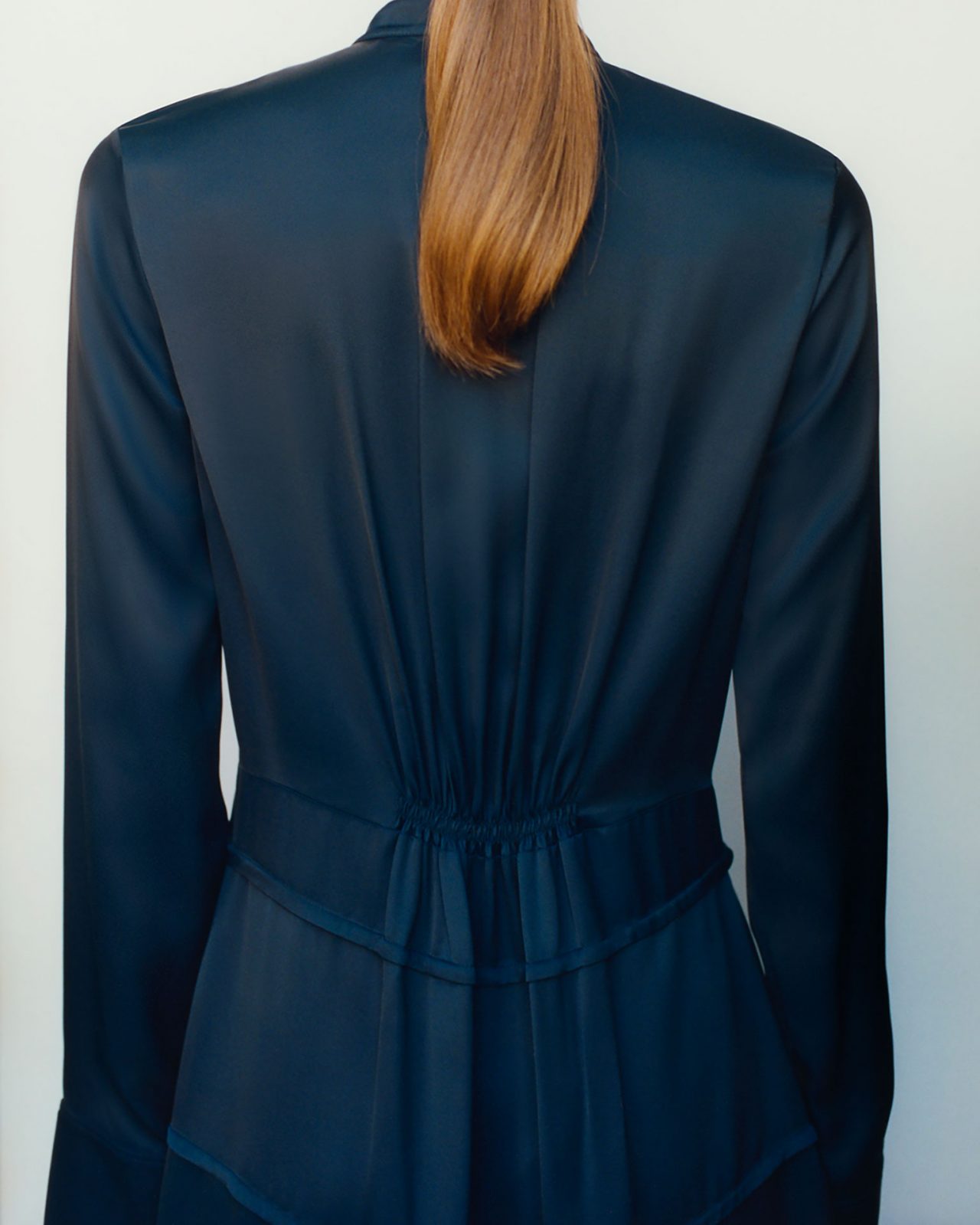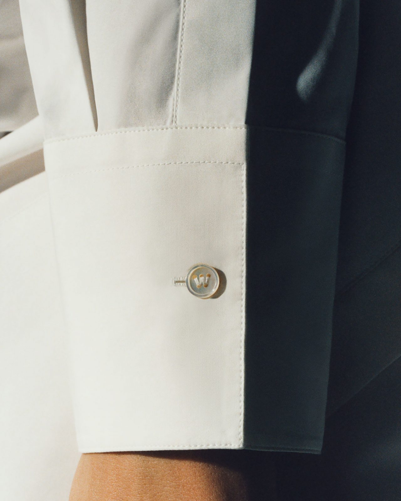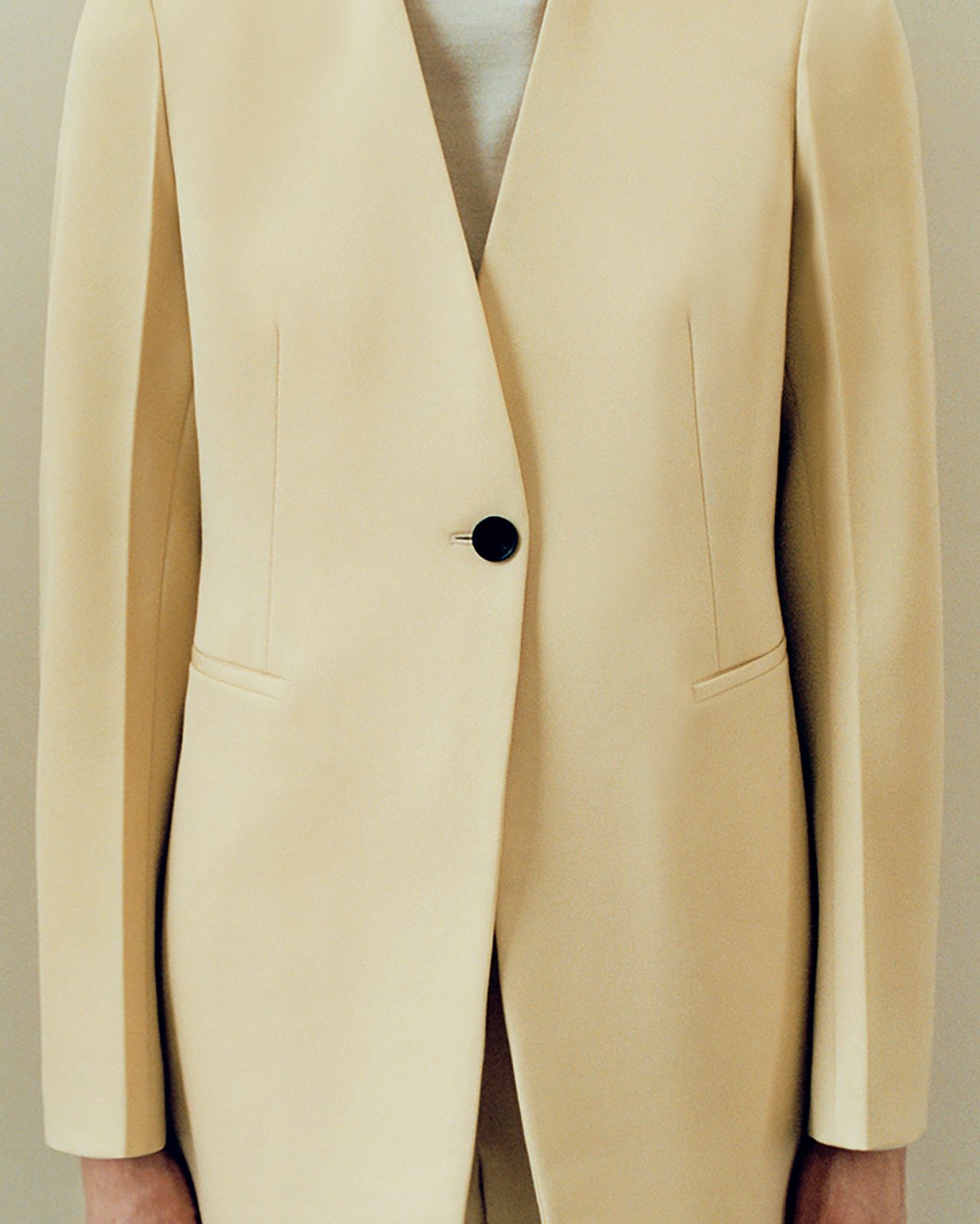 マクロからミクロまで、すべてが JIL SANDER の職人の手によって丁寧に生産され、精錬され、愛情を込めてつくられたもの。裏地には同色の糸で Wardrobe という文字が手刺繍され、すべての衣服には、Wの刻印、もしくはWとスティッチで描かれたシグネチャーボタンが付けられ、コレクションに希少性と親密なニュアンスを添えてくれる。