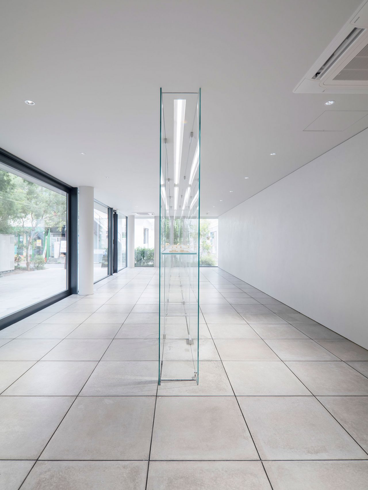 ブランドの世界観を反映した内装デザインは、Shihara の直営店すべての空間デザインを手がけてきた MOUNT FUJI ARCHITECTS STUDIO の原田真宏と原田麻魚。「小規模な都市計画」として、都市をそのまま空間内に引き込みジュエリーと直接関係させ、店舗という中間的な存在を消すというコンセプトのもとデザインされた店内は、中央に並列する高透過ガラスのディスプレイを主役に余計な装飾を排除した空間に。中庭から店舗スペース、オルタナティブスペースまで、コンクリートブロックが敷き詰められ、まさに内と外をさりげなく繋いでいる。