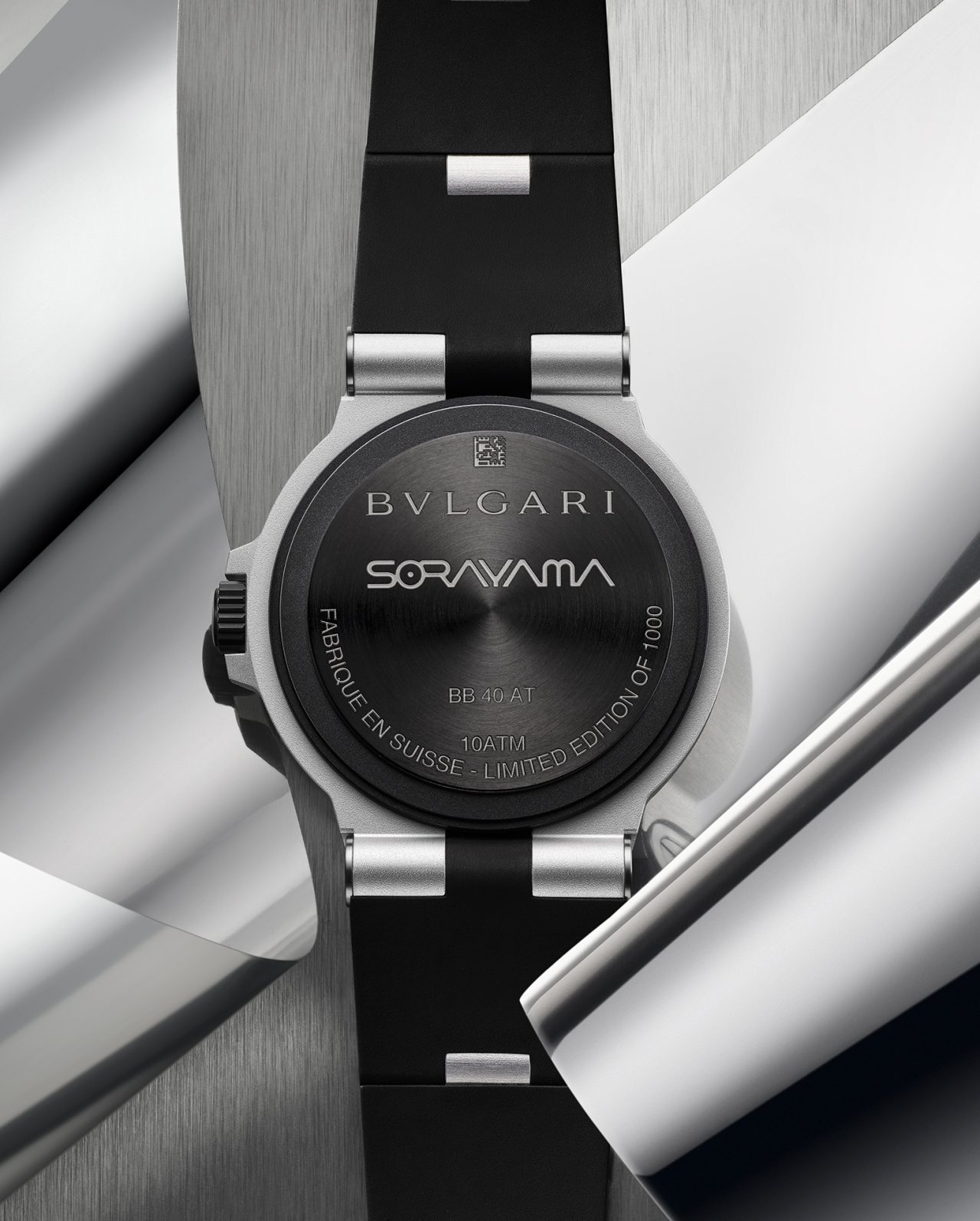 また、強化ブラックチタン素材のケースとリューズには「SORAYAMA」ロゴが。さらに、「ブルガリ アルミニウム」のアイコンの一つであるアルミニウム製のリンクとピンバックルを組み合わせたラバーストラップも付属される。