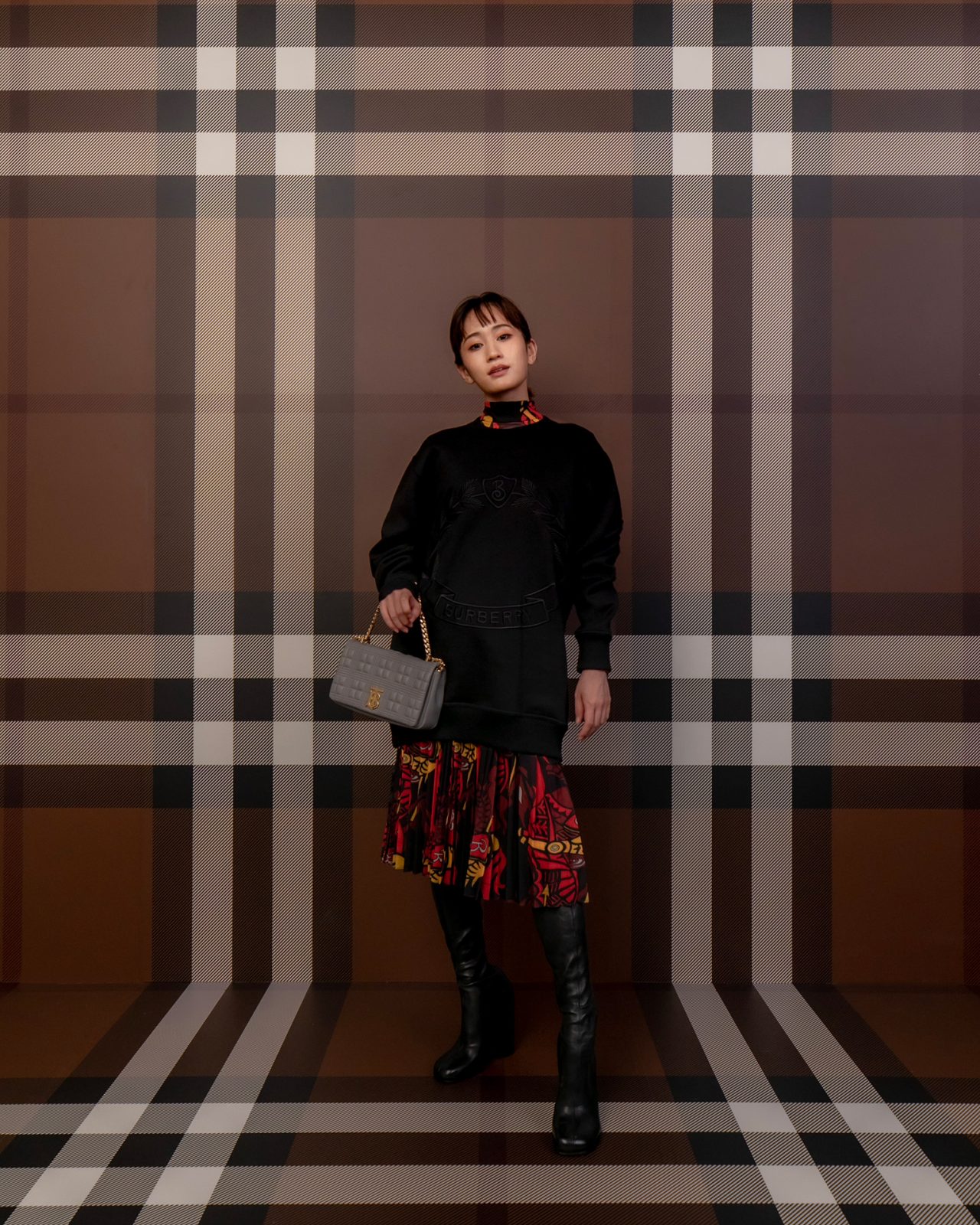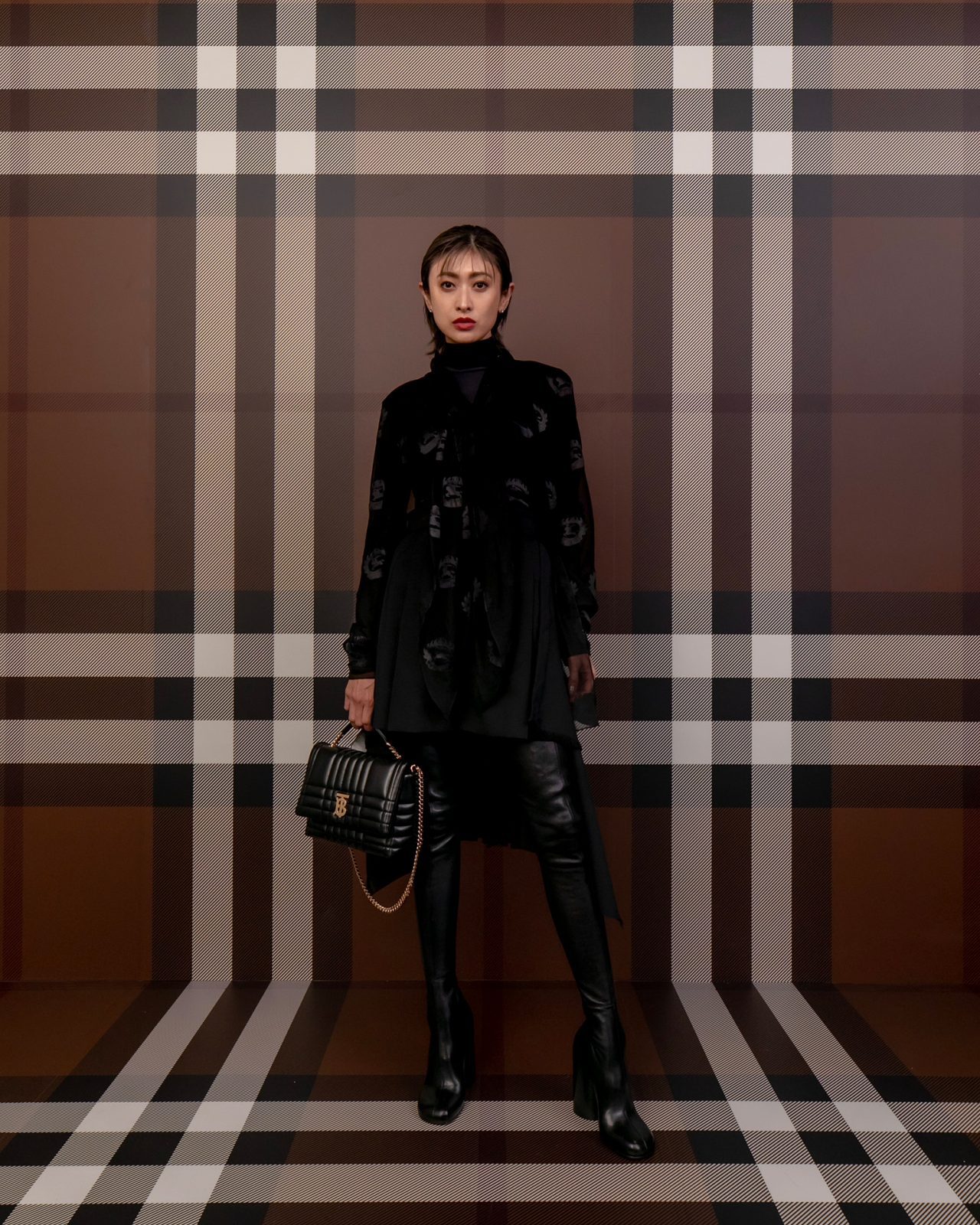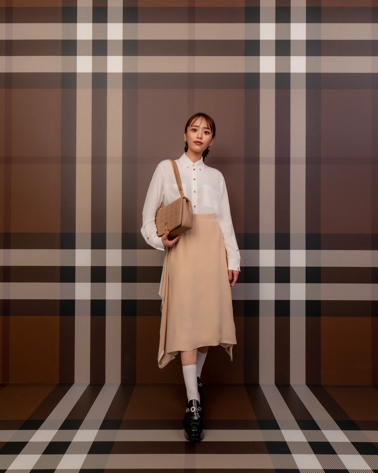 ブランドの創業者 Thomas Burberry (トーマス・バーバリ)を讃えた TB モノグラムが配された留め具が特徴の「ローラバッグ」。会場内は Burberry のシグネチャーカラーであるベージュとホワイトでライティングされ、壁面にはバーチブラウンチェック柄の装飾が施された。森星、山田優、佐田真由美、藤井夏恋、前田敦子、鈴木えみら豪華ゲスト陣も集結。
