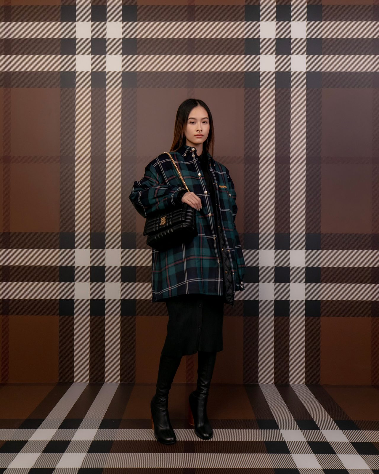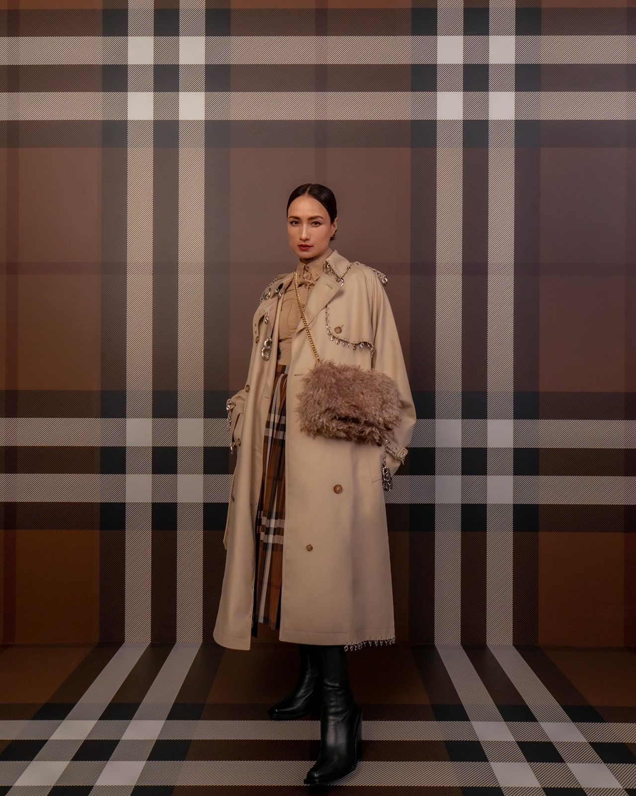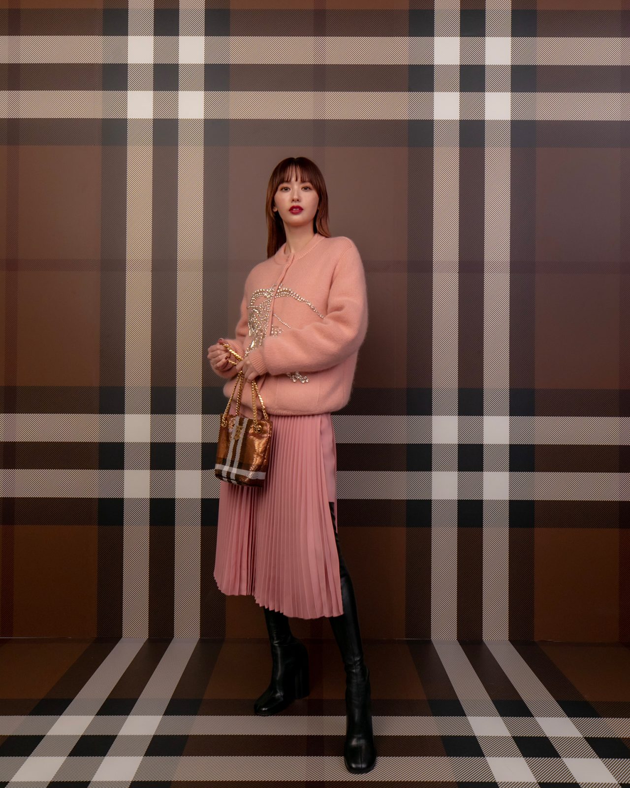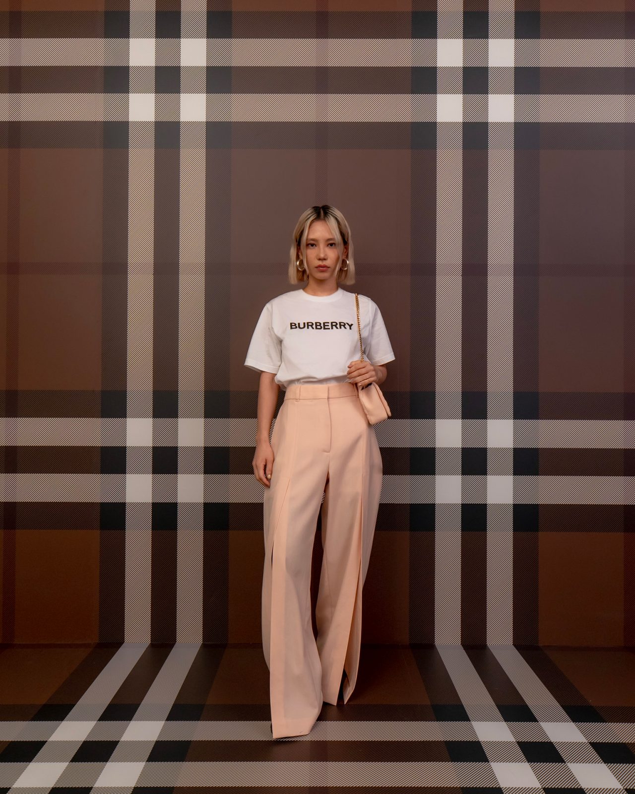 ブランドの創業者 Thomas Burberry (トーマス・バーバリ)を讃えた TB モノグラムが配された留め具が特徴の「ローラバッグ」。会場内は Burberry のシグネチャーカラーであるベージュとホワイトでライティングされ、壁面にはバーチブラウンチェック柄の装飾が施された。森星、山田優、佐田真由美、藤井夏恋、前田敦子、鈴木えみら豪華ゲスト陣も集結。