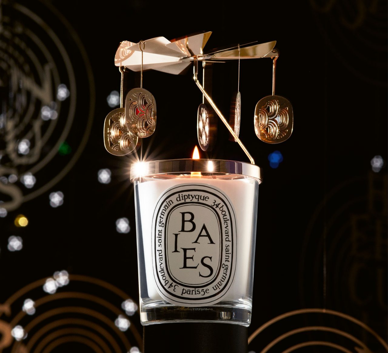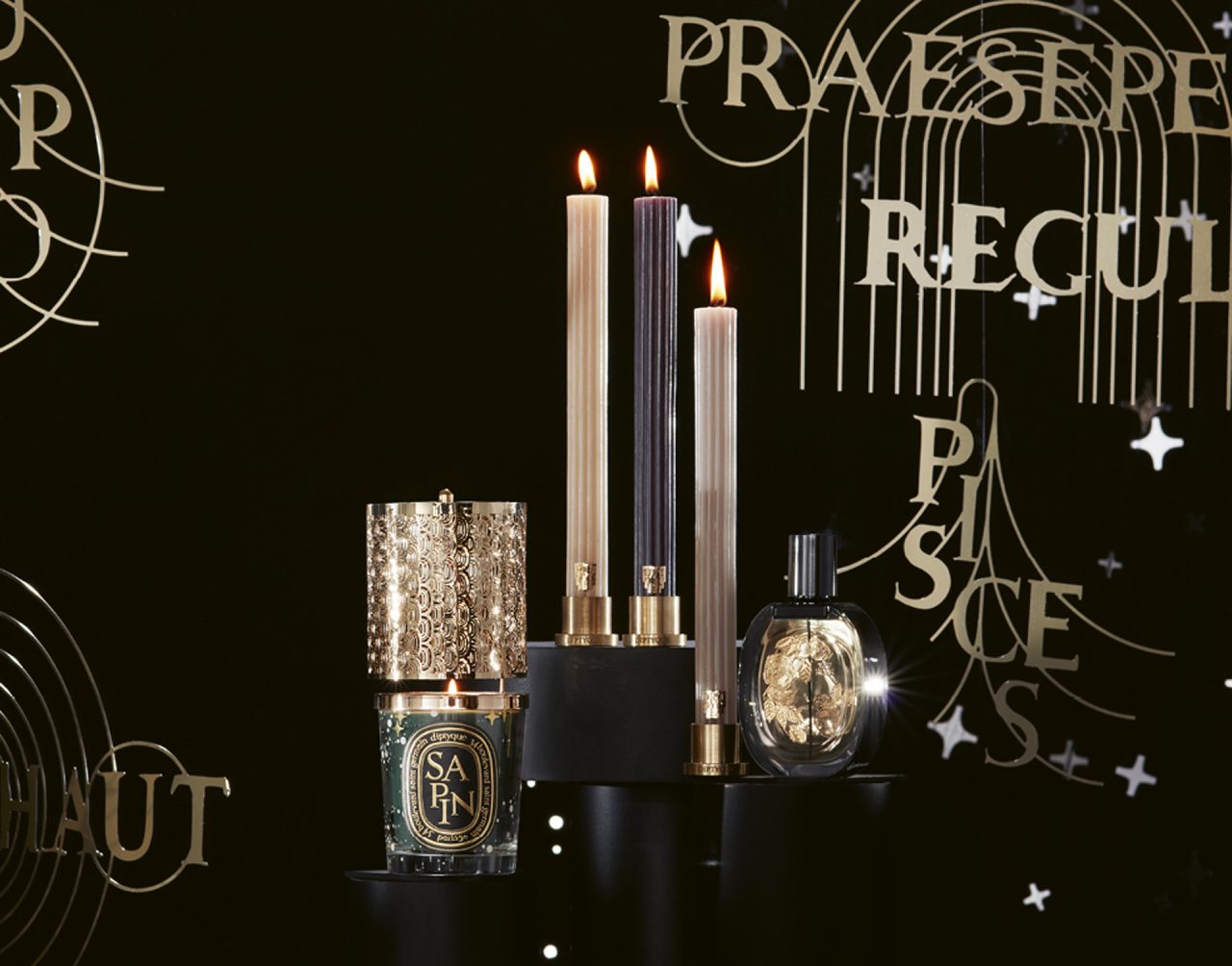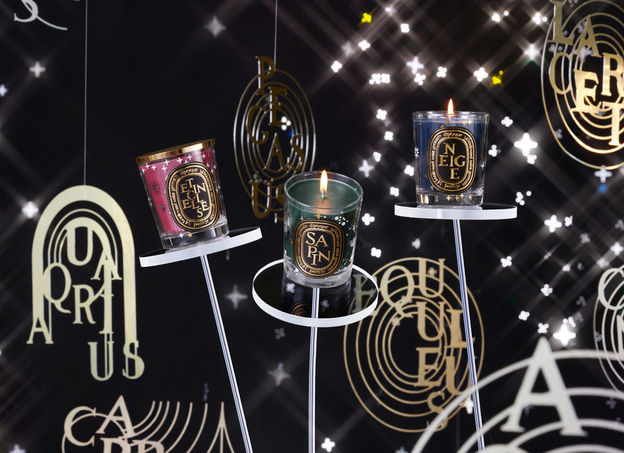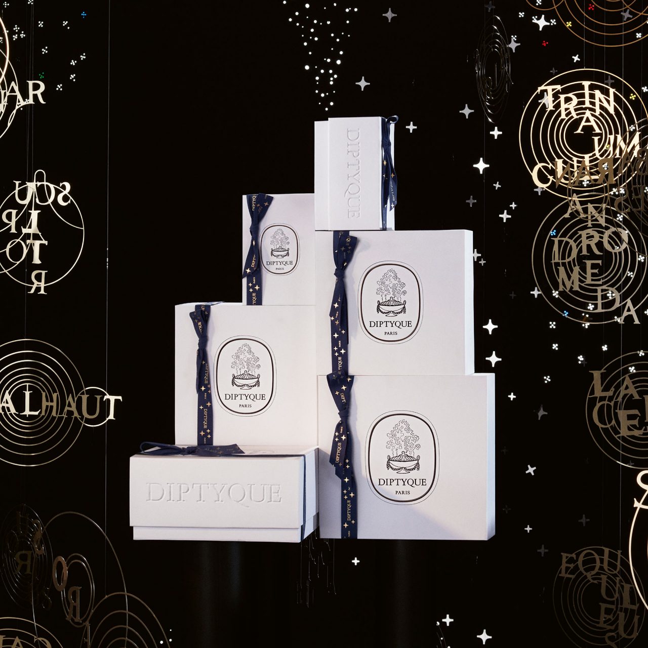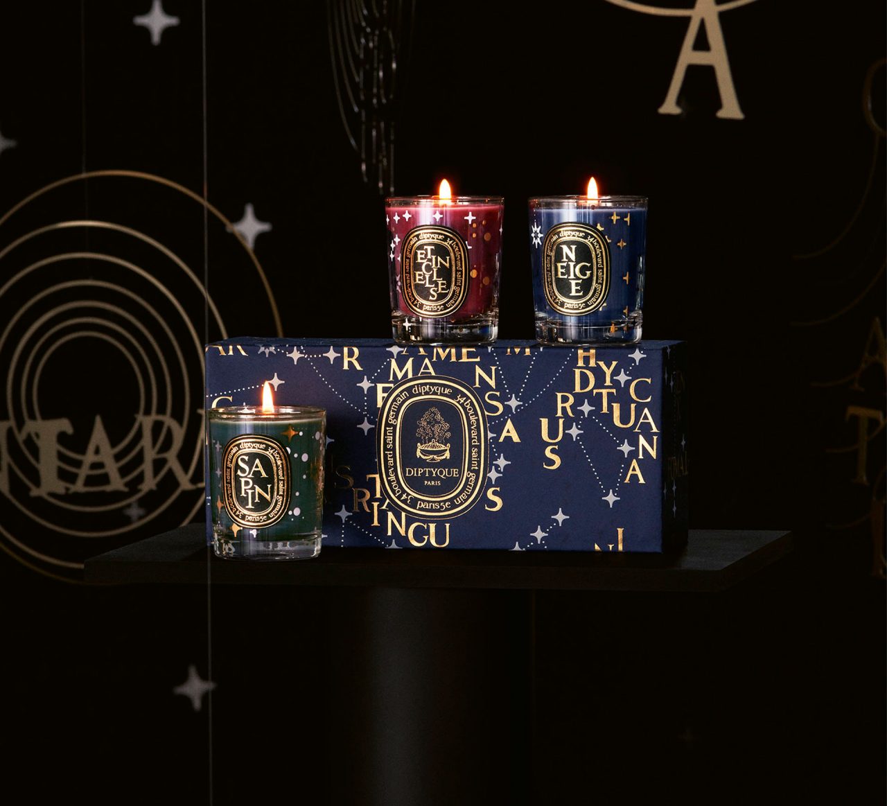 今回のホリデーコレクションのインスピレーションとなったのは「星空」。ゴールドやシルバーの燐光を放つ星や文字が輝く、限定のキャンドルやフレグランスを展開する。コレクション第1弾で特に注目したいのが、3種の香りがセットになった「限定版フレグランス キャンドル」。ダークグリーンのキャンドル「Sapin (サパン)」は、甘いミモザのアクセントにもみの木のウッディなノートを溶け込ませ、「Neige (ネージュ)」は、ヘリオトープの花とホワイトムスクをブレンド。温かみのあるダークレッドのキャンドル「Étincelles (エタンセル)」は、コーヒーやチョコレートの美味しそうなノートが心を和らげる。