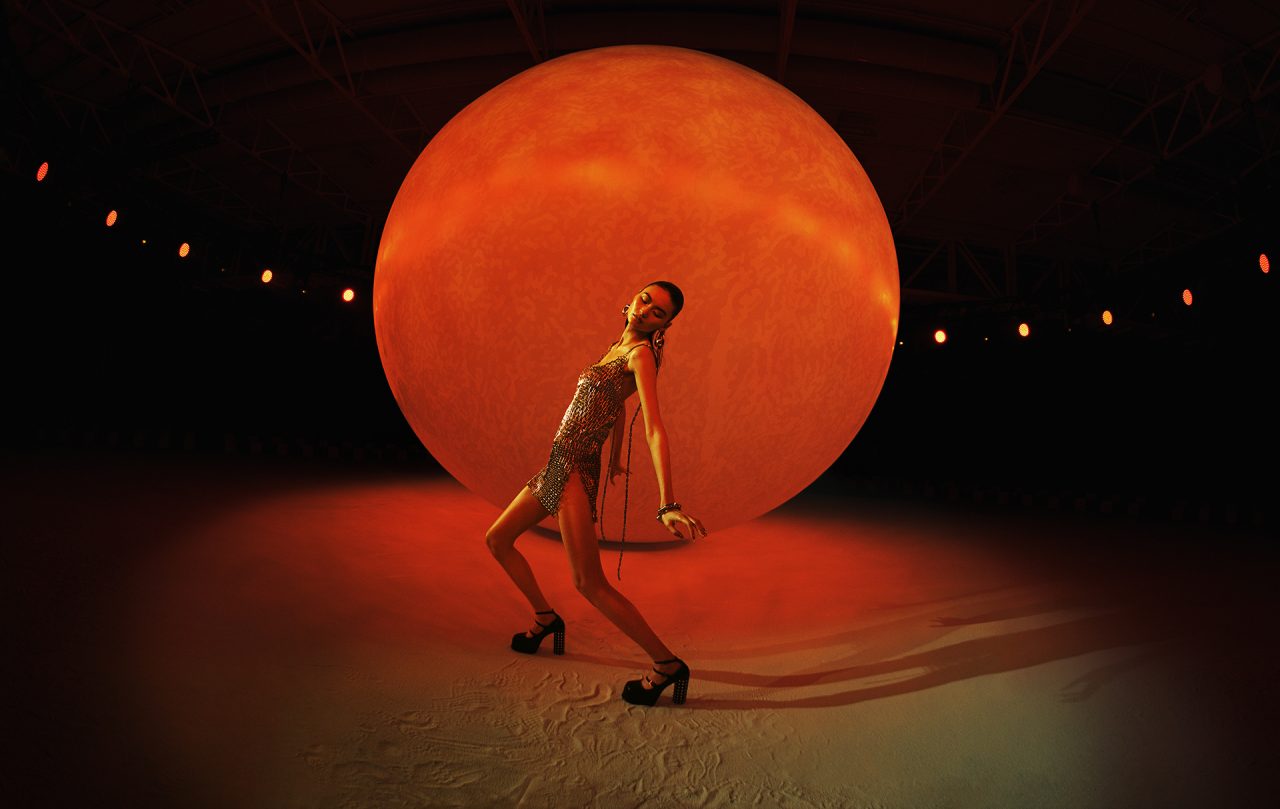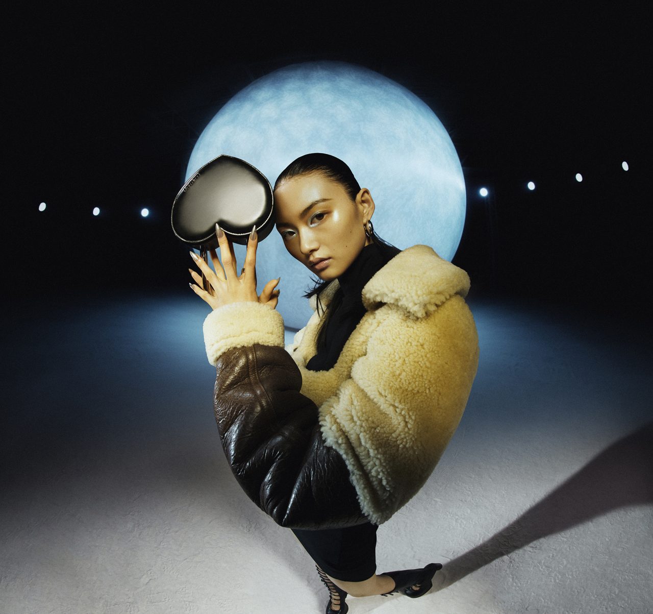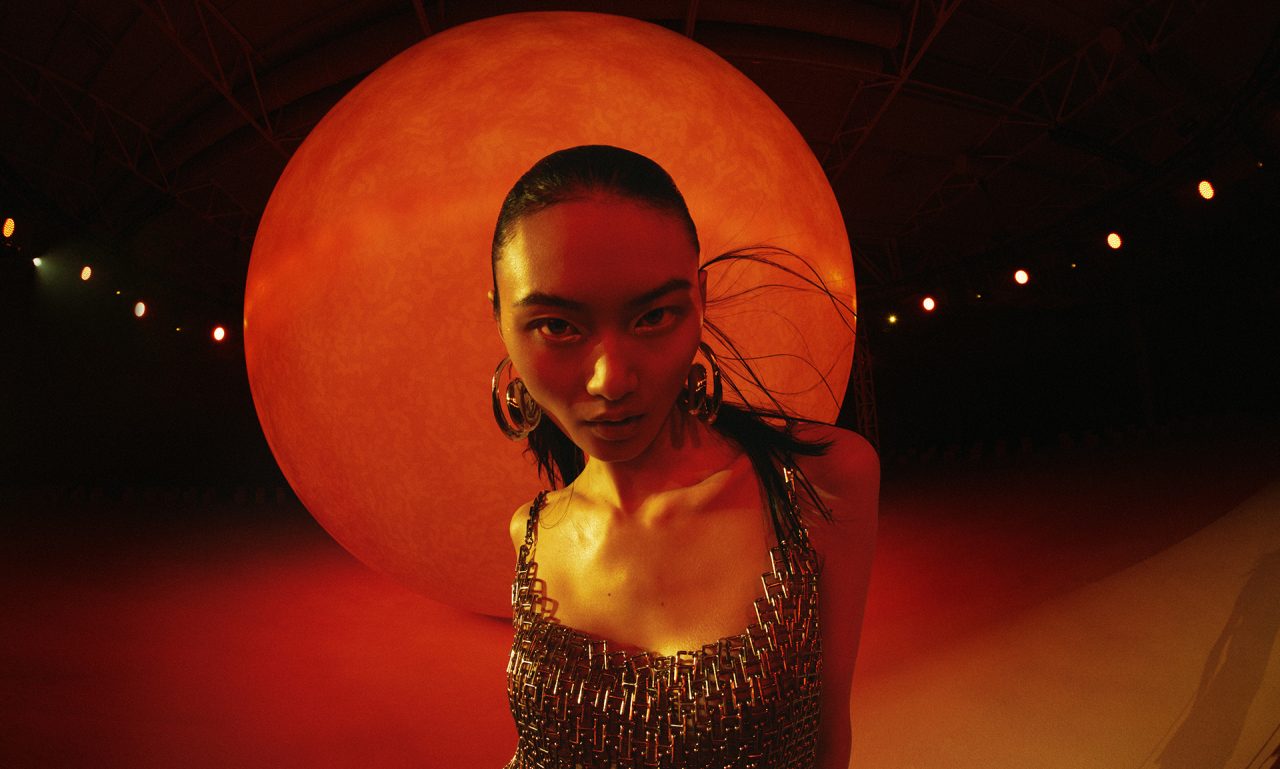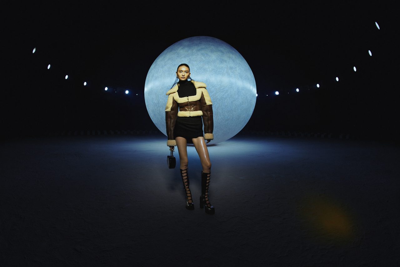 燃え盛るような真っ赤なオーブが反射するチェインメールの「ミニドレス」、まるで新たな銀河系へと繋がるトンネルの入り口のような「ツイストイヤリング」、革のセパレートと AMBUSH®️ ルックを象徴する重厚な「ブーツ」などをフィーチャー。また、モデルのメタリックなアイシャドウ、艶めく黒革の「ハートバッグ」、そして「クロップドシアリングジャケット」には静寂なアイスブルーが反射して映った。