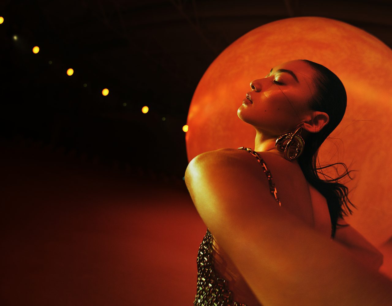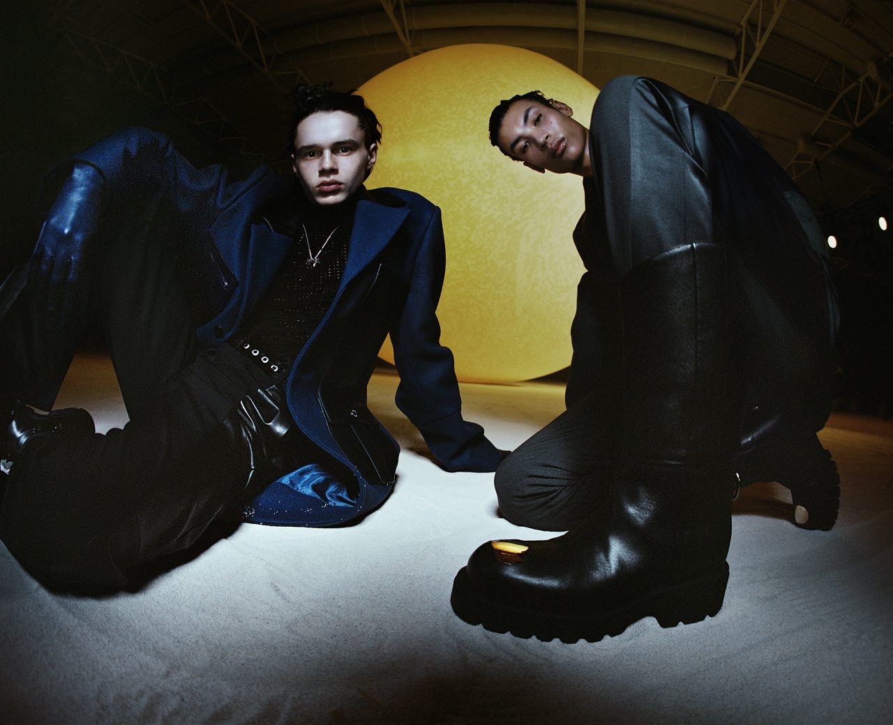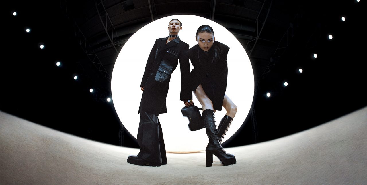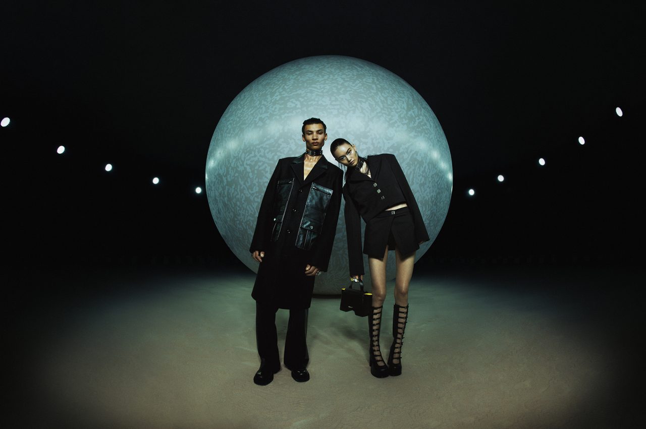 燃え盛るような真っ赤なオーブが反射するチェインメールの「ミニドレス」、まるで新たな銀河系へと繋がるトンネルの入り口のような「ツイストイヤリング」、革のセパレートと AMBUSH®️ ルックを象徴する重厚な「ブーツ」などをフィーチャー。また、モデルのメタリックなアイシャドウ、艶めく黒革の「ハートバッグ」、そして「クロップドシアリングジャケット」には静寂なアイスブルーが反射して映った。