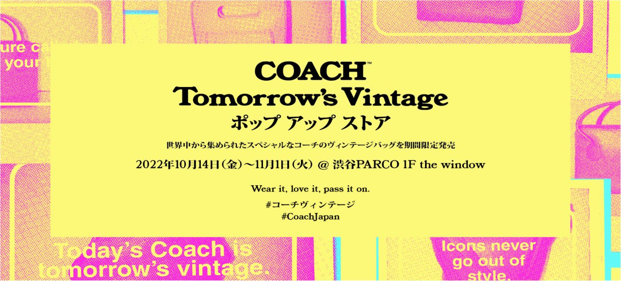 COACH (コーチ) が、渋谷 PARCO (パルコ) にて「Tomorrow’s Vintage」ポップアップストアをオープン。丁寧にリストアされたヴィンテージ商品が揃い、購入したアイテムを自分らしくカスタマイズできる「コーチ クリエイト」も実施される。会期は11月1日(火) まで。