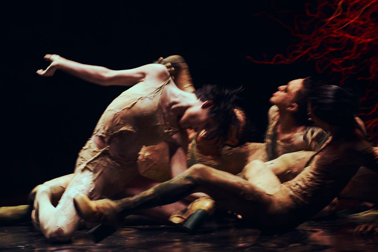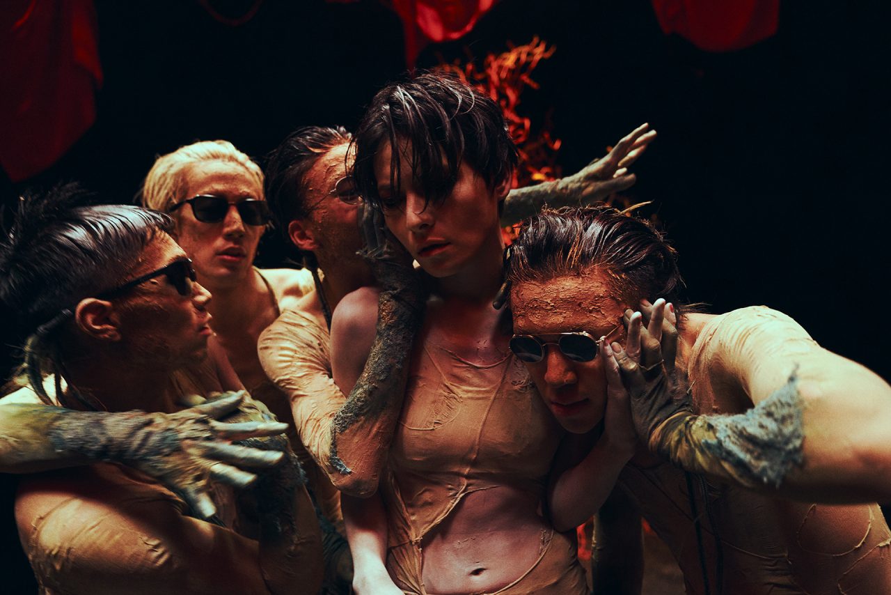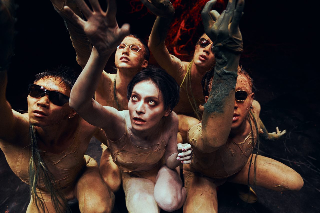 「人が初めてアイウェアを着た瞬間」がテーマのパフォーマンスのモチーフとなったのは、旧約聖書がモチーフだ。深紅に染まった舞台にて、人類の原点である存在が「EYEVAN 7285」、「10 eyevan」、「Eyevol」、「E5 eyevan」を纏った蛇たちにいざなわれ、EYEVAN のサングラスを手にし、装うことで、魅せること、見ることに出会う様が表現された。限られた100人のゲストがオールブラックを身に纏って集い、その空間は観客や厳粛なムードを含めて芸術的な作品と化した。