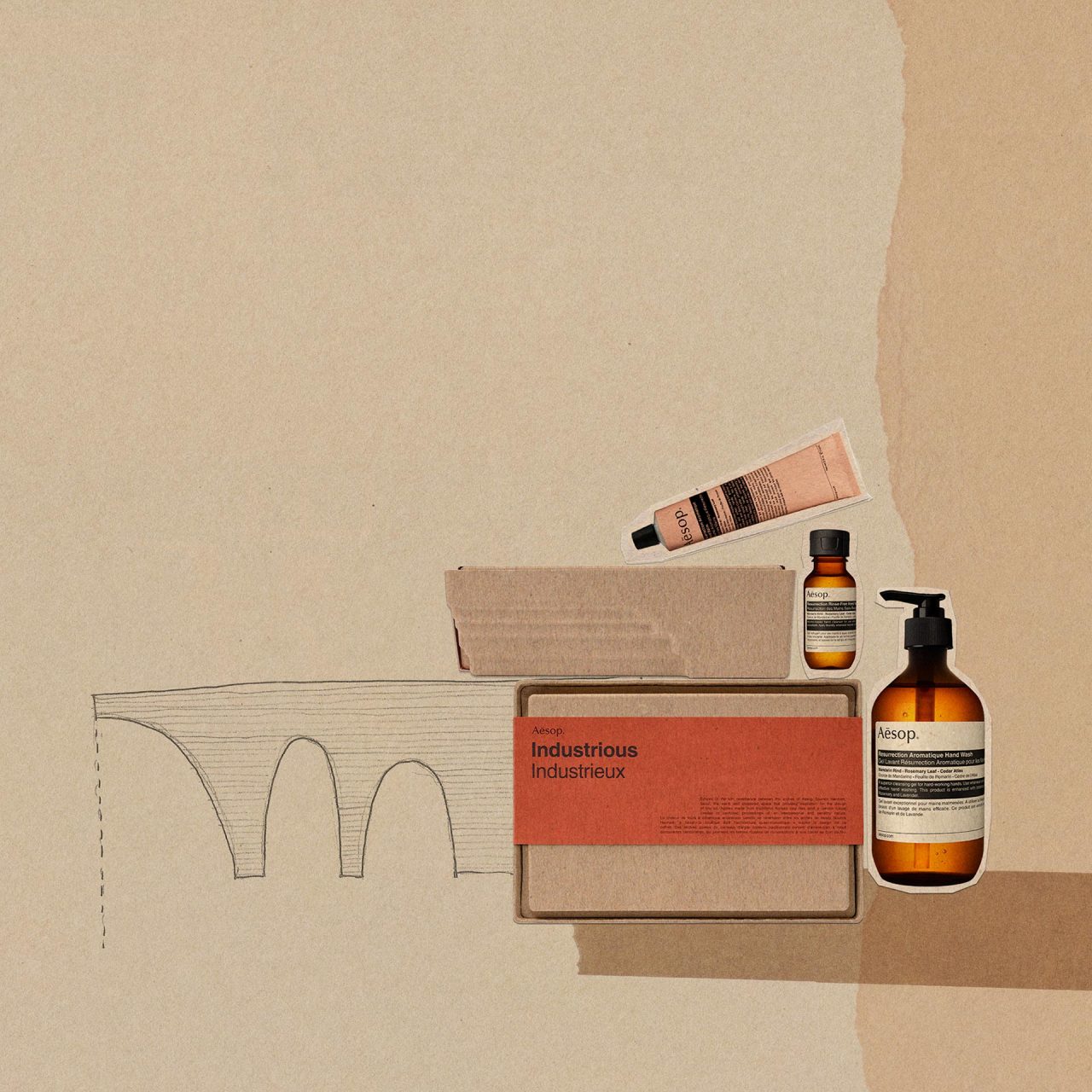 ハンドケアアイテム3つがセットになった「インダストリアス」。ソウルにある、イソップ サウンズ ハンナム店の温かみのある隠れ家のような雰囲気に着想を得たパッケージデザインになっている。