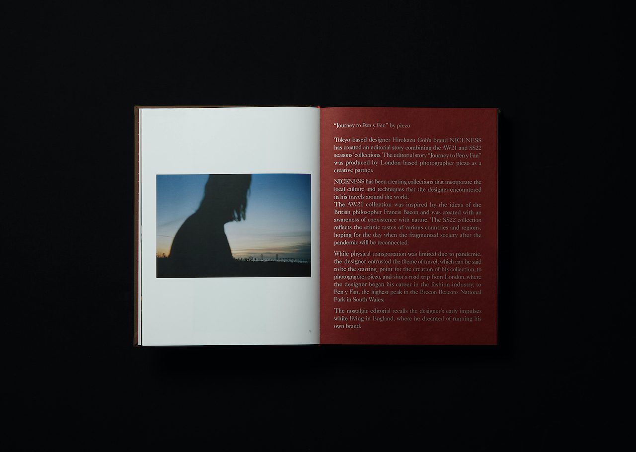 10シーズン目というブランドにとって大きな節目を迎えて、コレクションやクリエイティブの記録を目的としたアーカイブブックを制作。ブランドのオリジナル生地で装丁したハードカバー仕様の本書では、2022年春夏コレクションと2022年秋冬コレクションのキャンペーンビジュアル、ルックブック、プロダクトイメージを収録。コレクションの背景に加え、デザイナーのインスピレーション源である旅をコンセプトにしたファッションストーリーが PICZO によって撮り下ろされている。150部限定で、特製サコッシュが付属。NICENESS 取扱店にて発売されている。