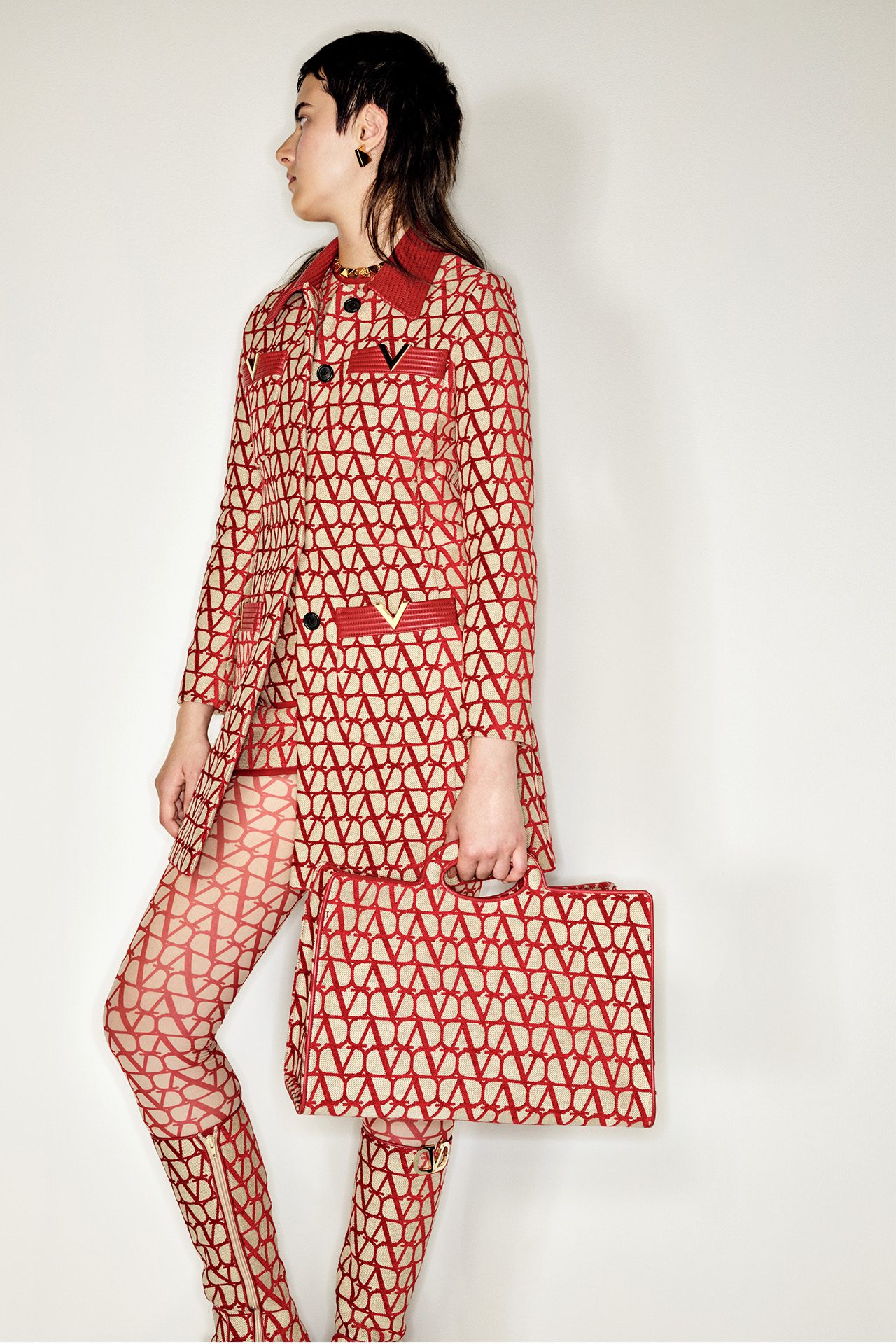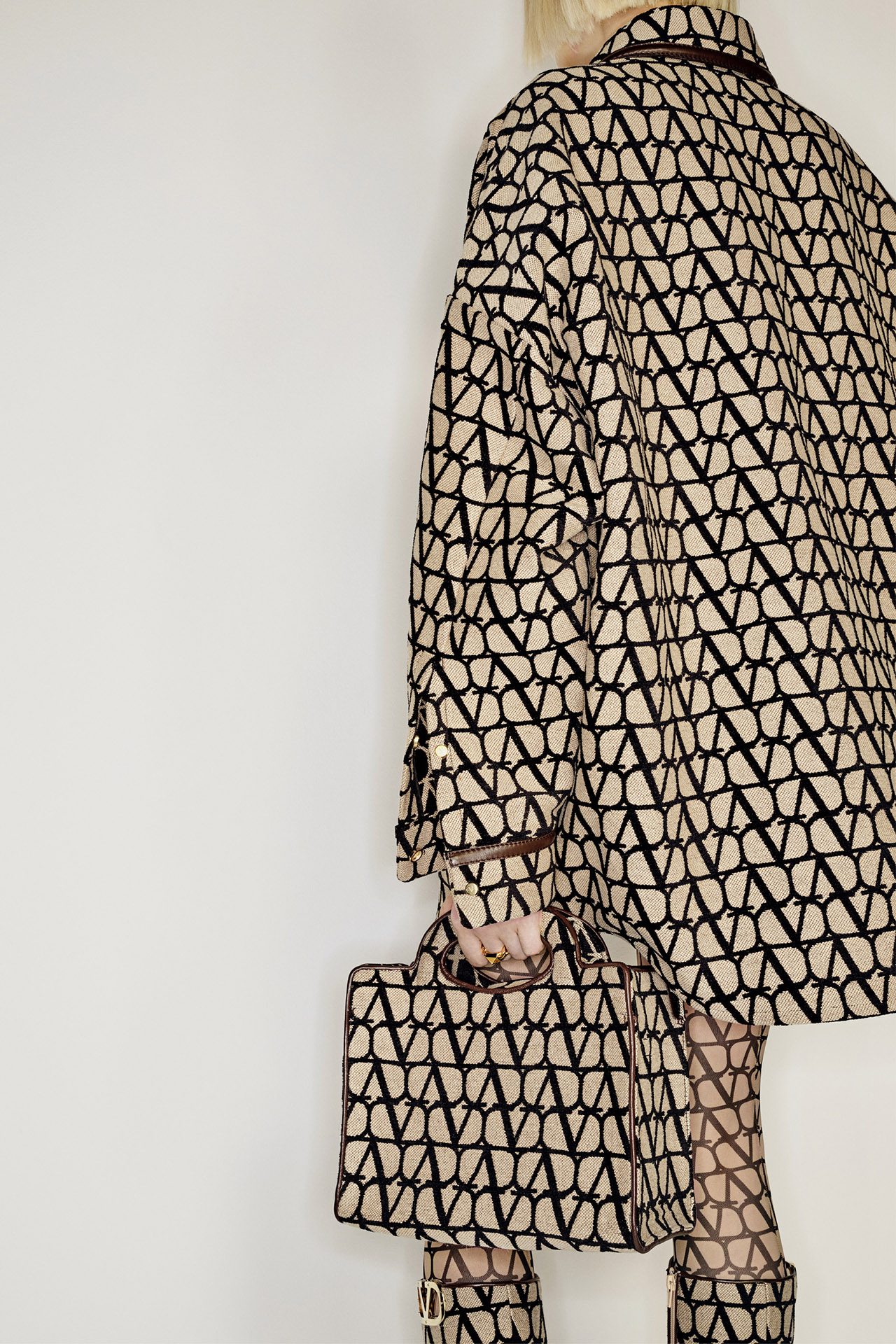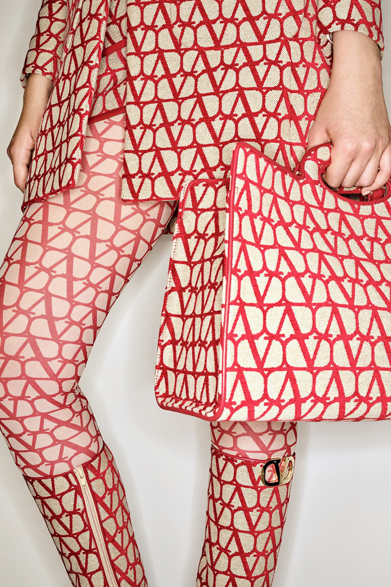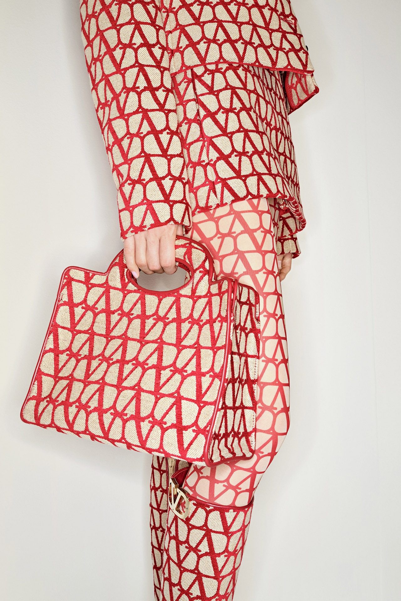 1960年代のブルジョワテイストと、都会的な美をミックスした本コレクションは、「V ロゴ」が全身を覆う新たなパターンの「トワル イコノグラフ」をフィーチャー。主に、アイコニックなコート、70年代テイストのレザーワークに用いられた。レッドとフォンダンキャンバスのバイカラーのトータルルックで表現され、VALENTINO GARAVANI (ヴァレンティノ ガラヴァーニ) アクセサリーにも施されている。Pierpaolo Piccioli が2016年から継続しているメゾンのコードを再定義するデザインプロセスの一環として、ロゴが新たに解釈されデザインされた。
