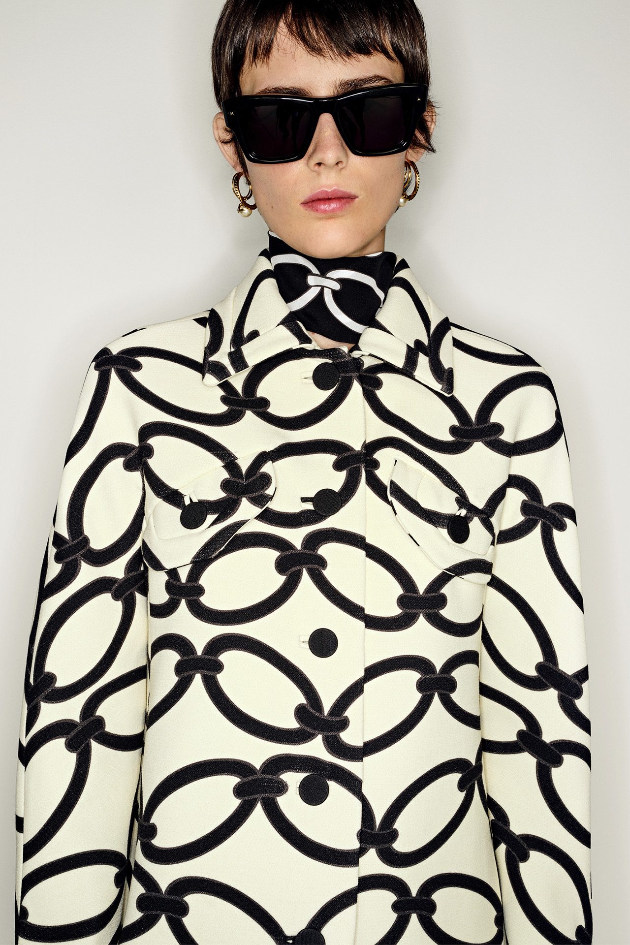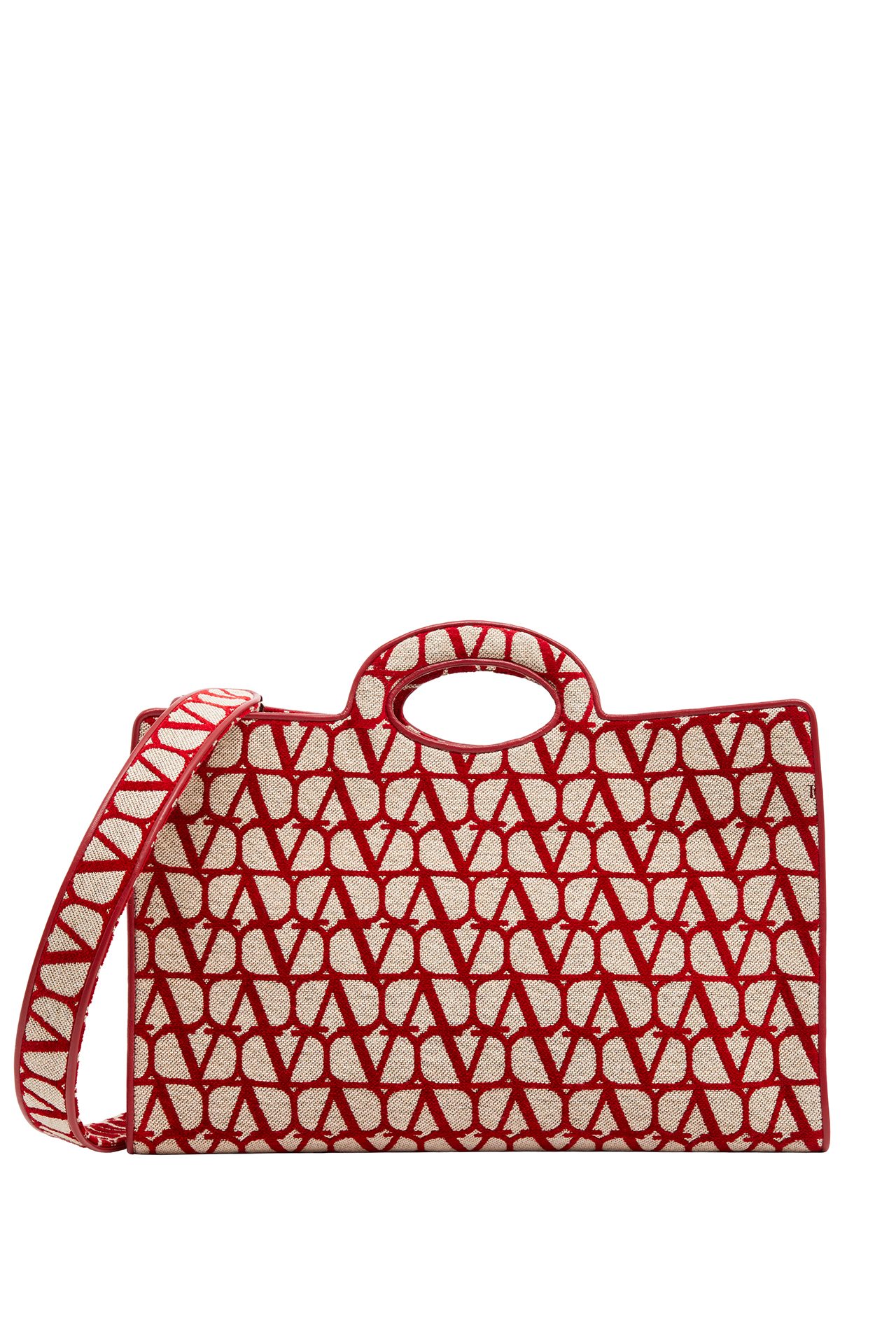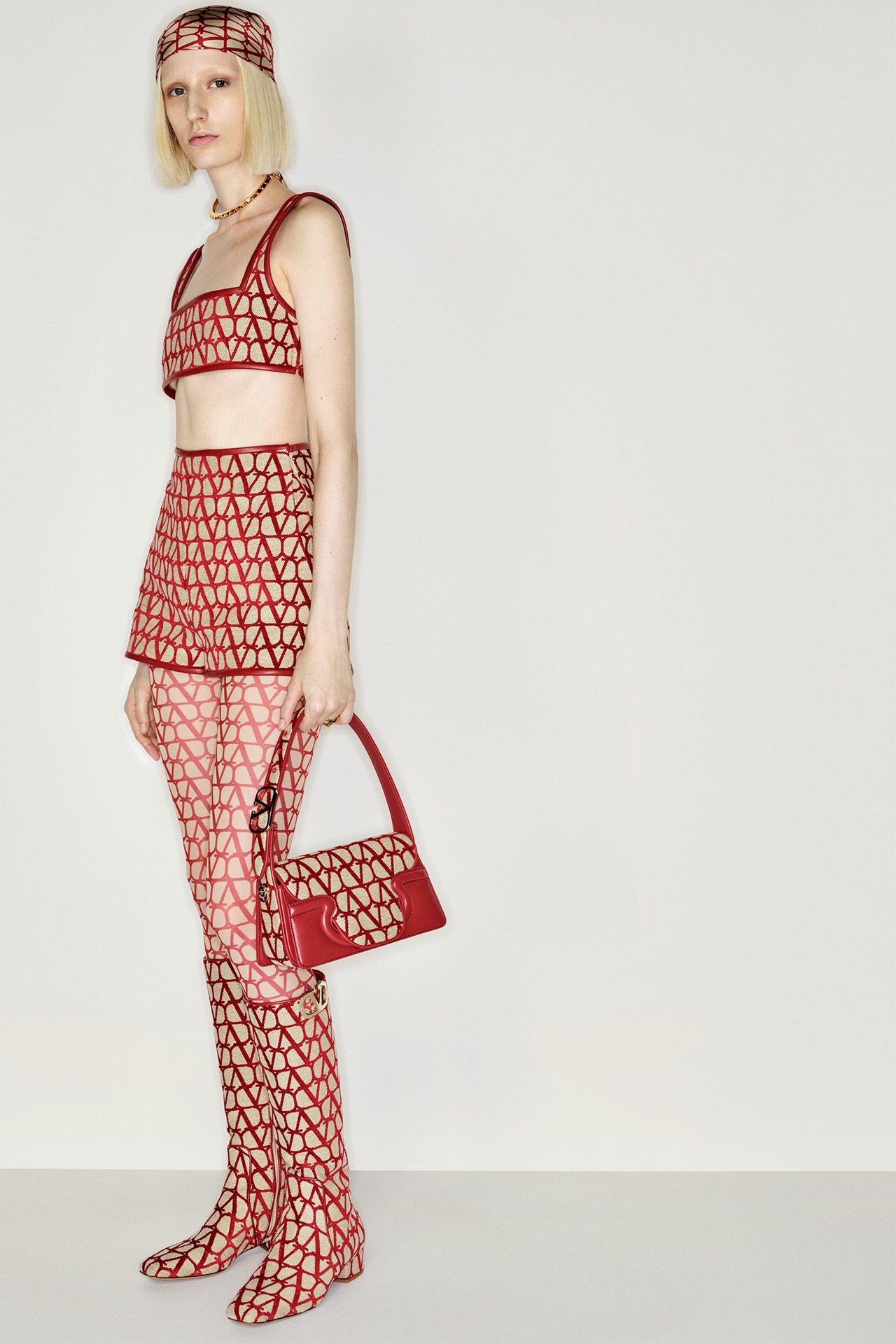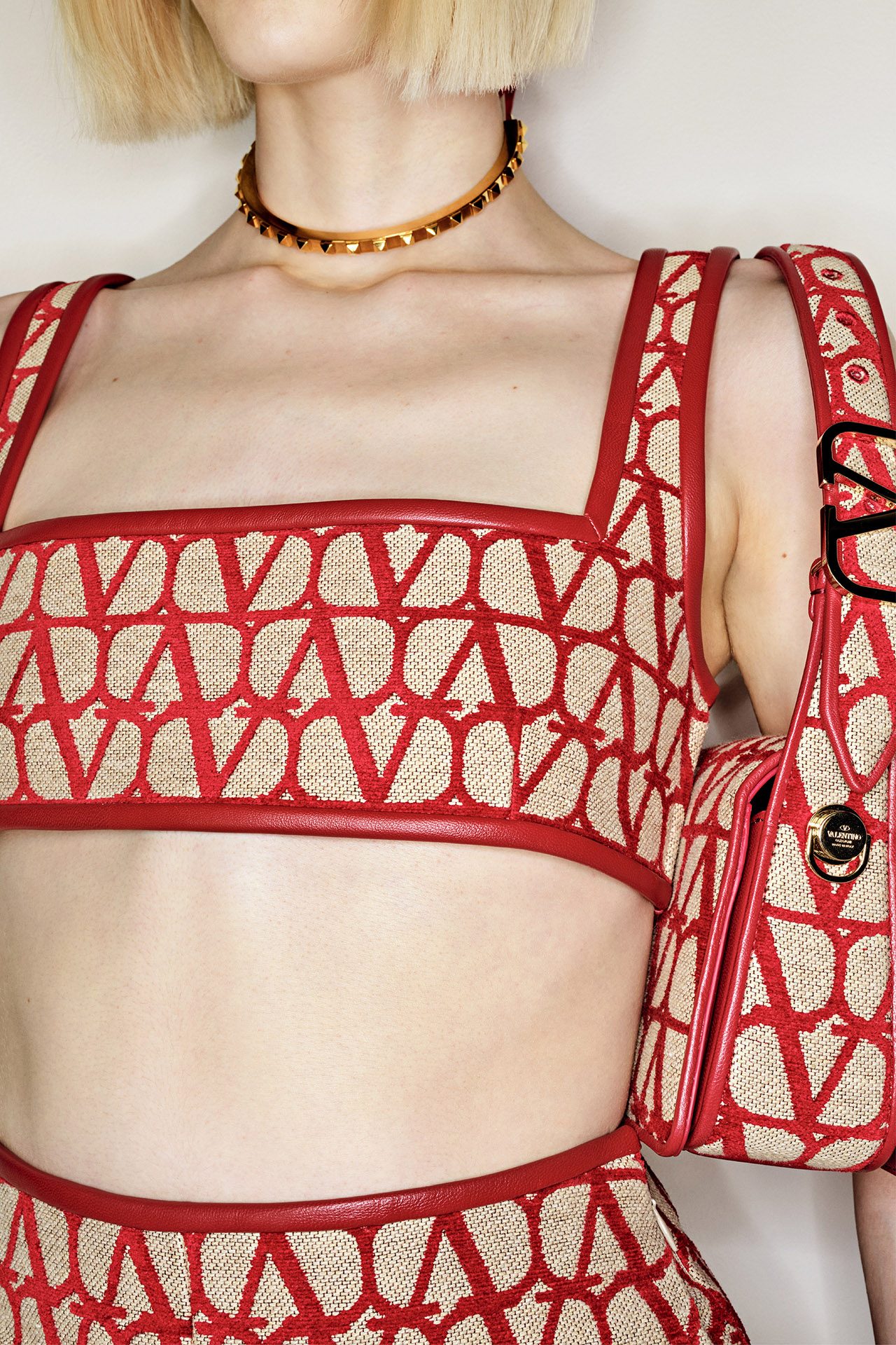 1960年代のブルジョワテイストと、都会的な美をミックスした本コレクションは、「V ロゴ」が全身を覆う新たなパターンの「トワル イコノグラフ」をフィーチャー。主に、アイコニックなコート、70年代テイストのレザーワークに用いられた。レッドとフォンダンキャンバスのバイカラーのトータルルックで表現され、VALENTINO GARAVANI (ヴァレンティノ ガラヴァーニ) アクセサリーにも施されている。Pierpaolo Piccioli が2016年から継続しているメゾンのコードを再定義するデザインプロセスの一環として、ロゴが新たに解釈されデザインされた。