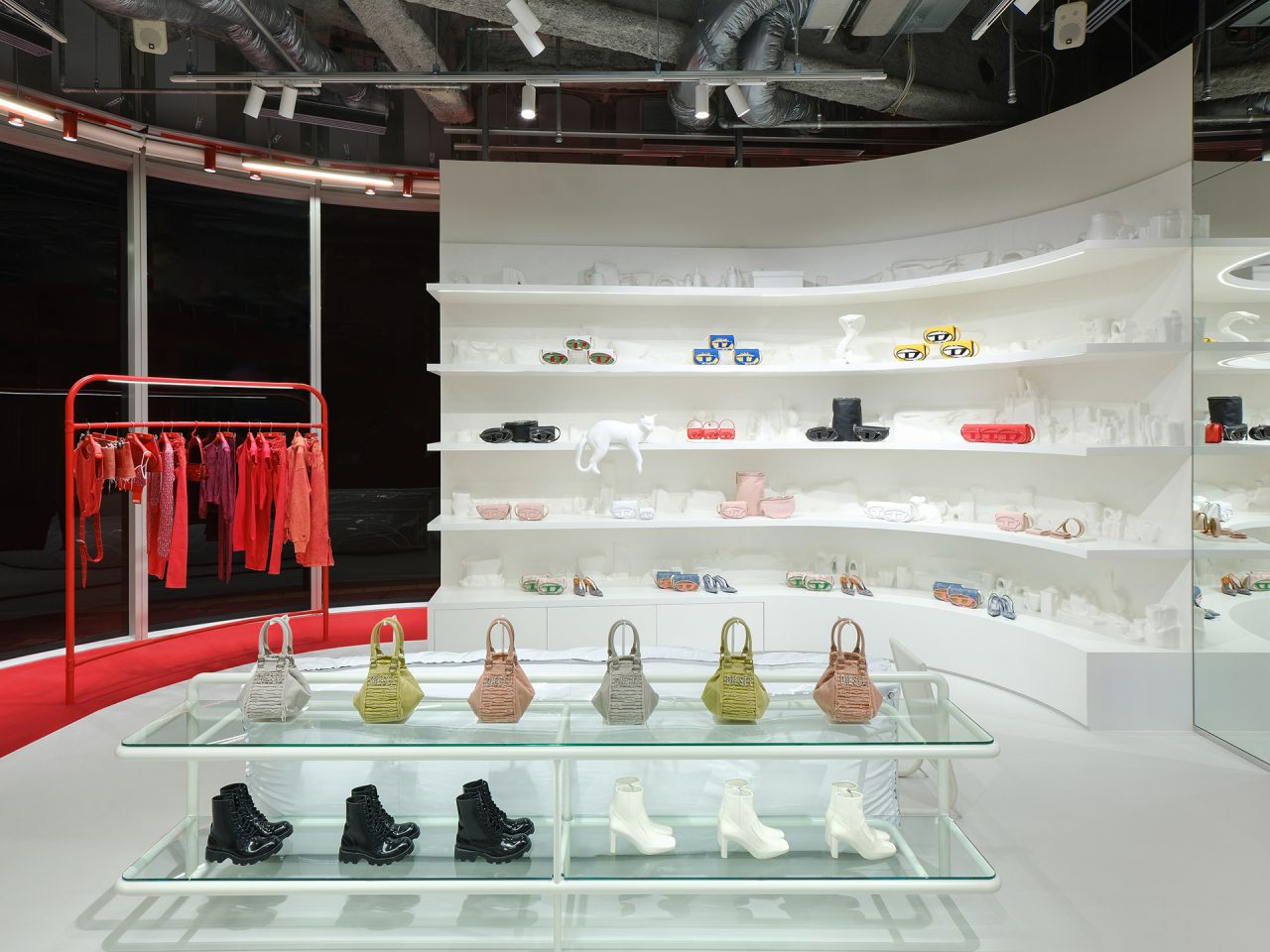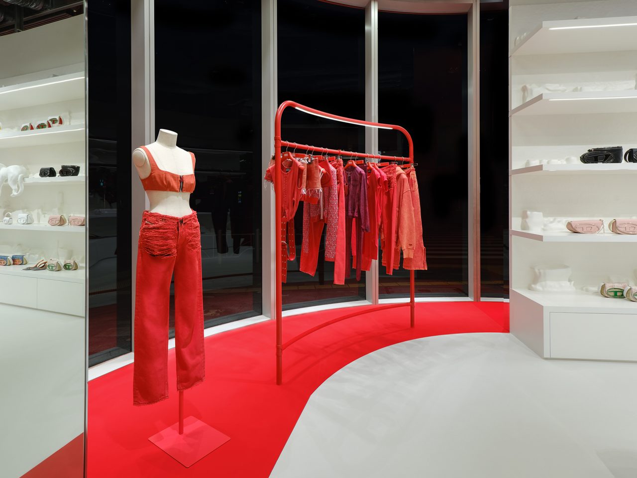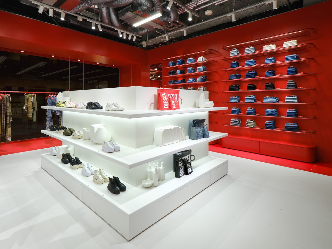 1階と地下1階の全2フロアからなる店内は、DIESEL のスローガン「For Successful Living®」を表現した世界観が広がっており、そのインテリアには刷新、破壊、変革の要素が盛り込まれている。1階では、アイコニックなブランドロゴを思わせる赤と白の壁に加え、メタルラックが店内を囲むように並べられた、明るい空間が広がる。そして地下1階では、赤と白の対照的な壁とディスプレイが、ユニークなコントラストを作り出し、機能的で革新的なデザインのディテールが随所に取り入れられている。