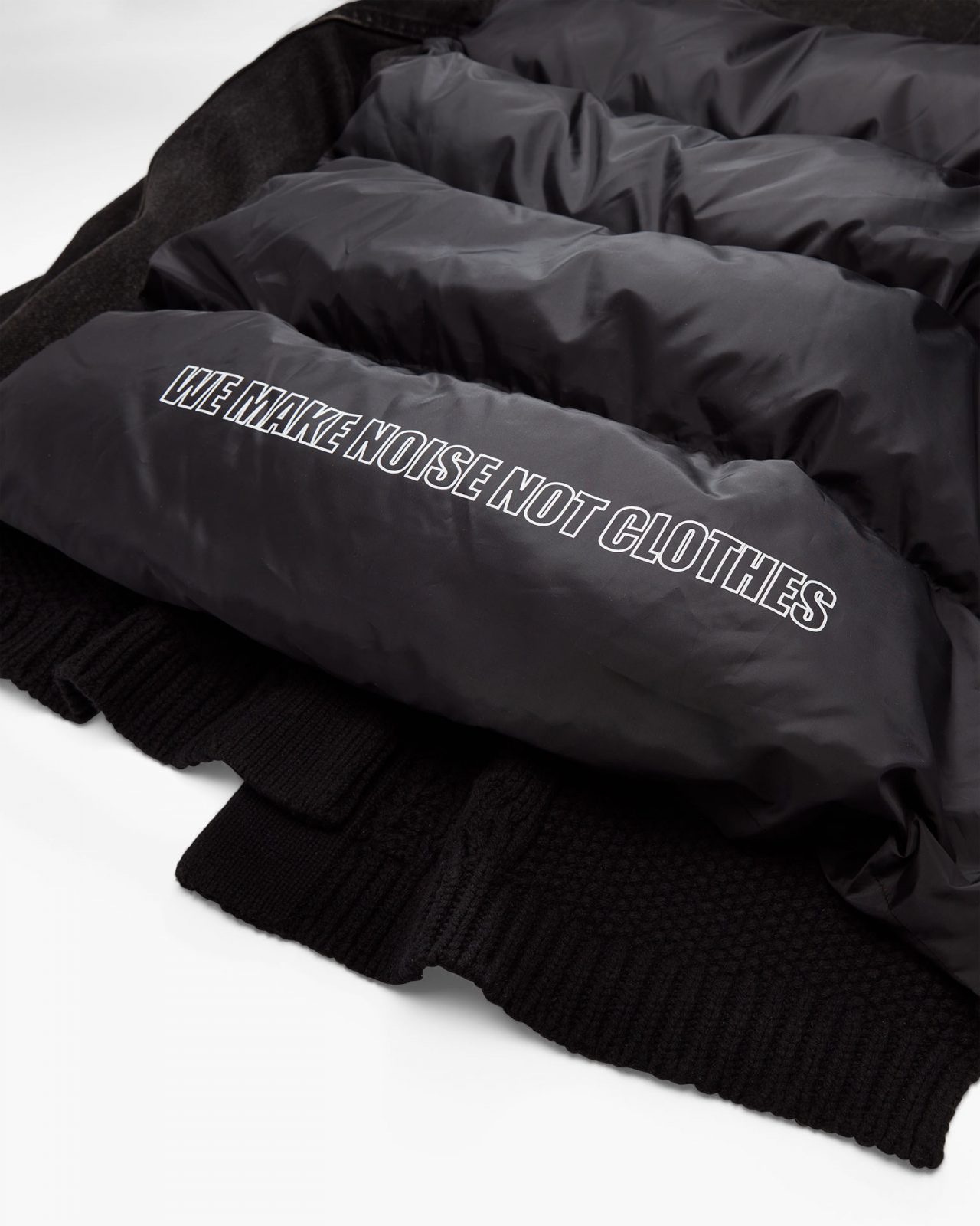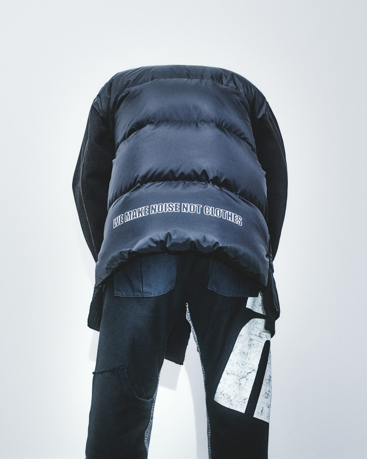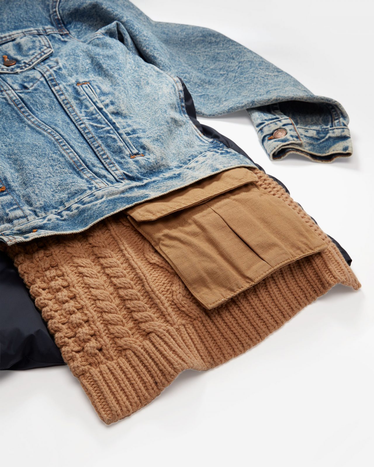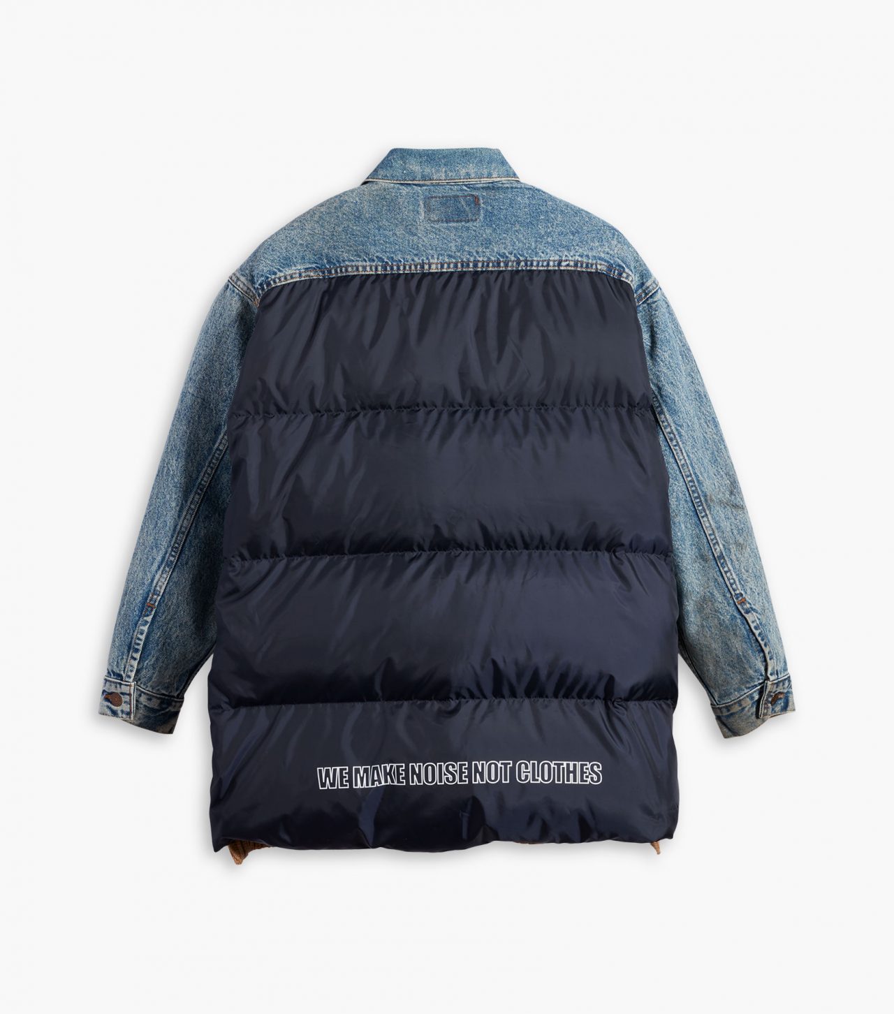 ヴィンテージの Levi’s® トラッカーを再構築したダウンジャケットは、ダウンのバックパネルとケーブル編みのボトムパネル、フロントにはリップストップのカーゴポケットを備えている。カラーは、インディゴウォッシュにカーキのケーブルニットのフロントパネルとネイビーのダウンバックパネル、またはブラックウォッシュにネイビーのケーブルニットのフロントパネルとネイビーのダウンバックパネルの2種類。どちらのジャケットも、ダウンのバックパネル下部に UNDERCOVER のブランドスローガンである「We Make Noise Not Clothes」が刺繍されているのが特徴だ。