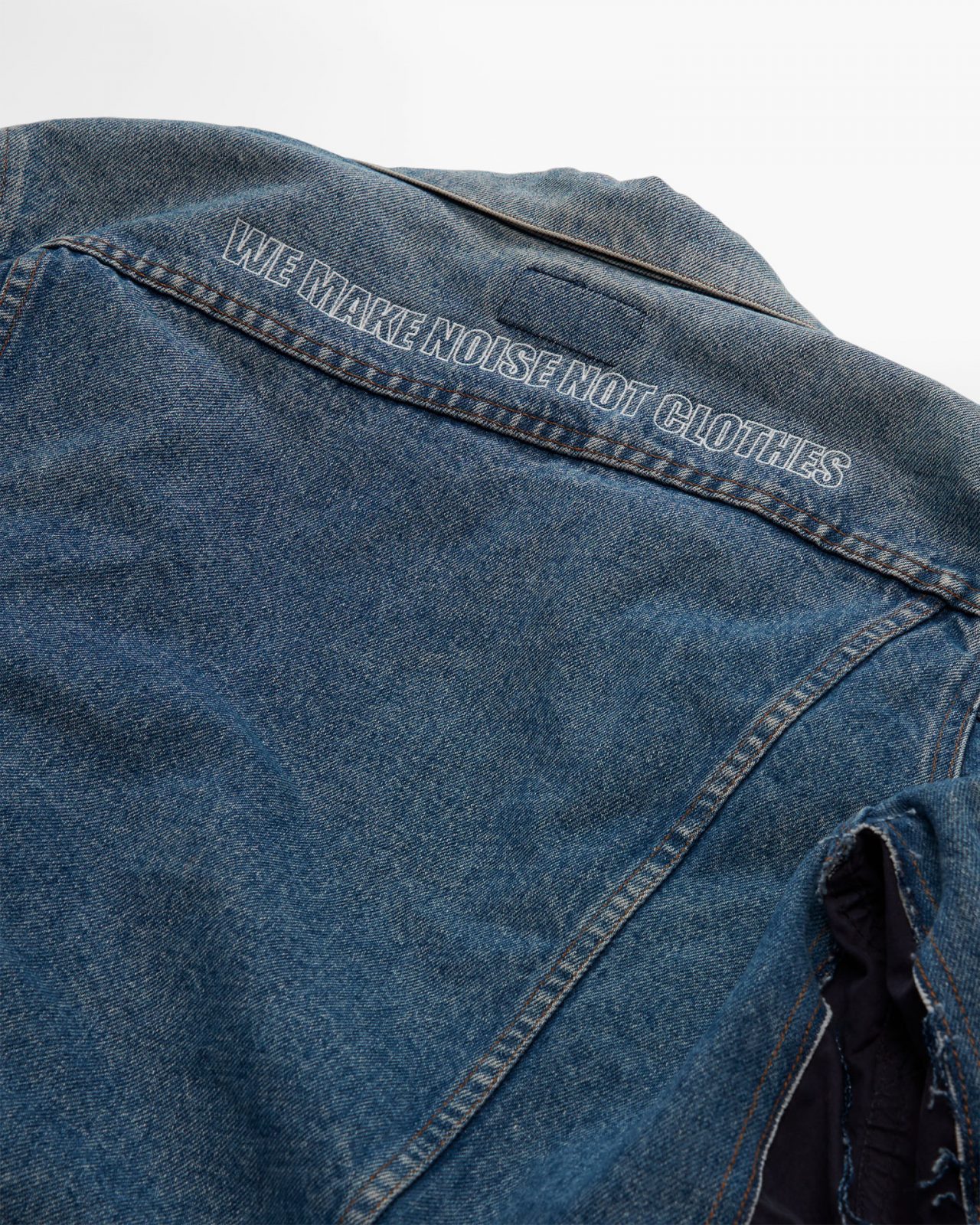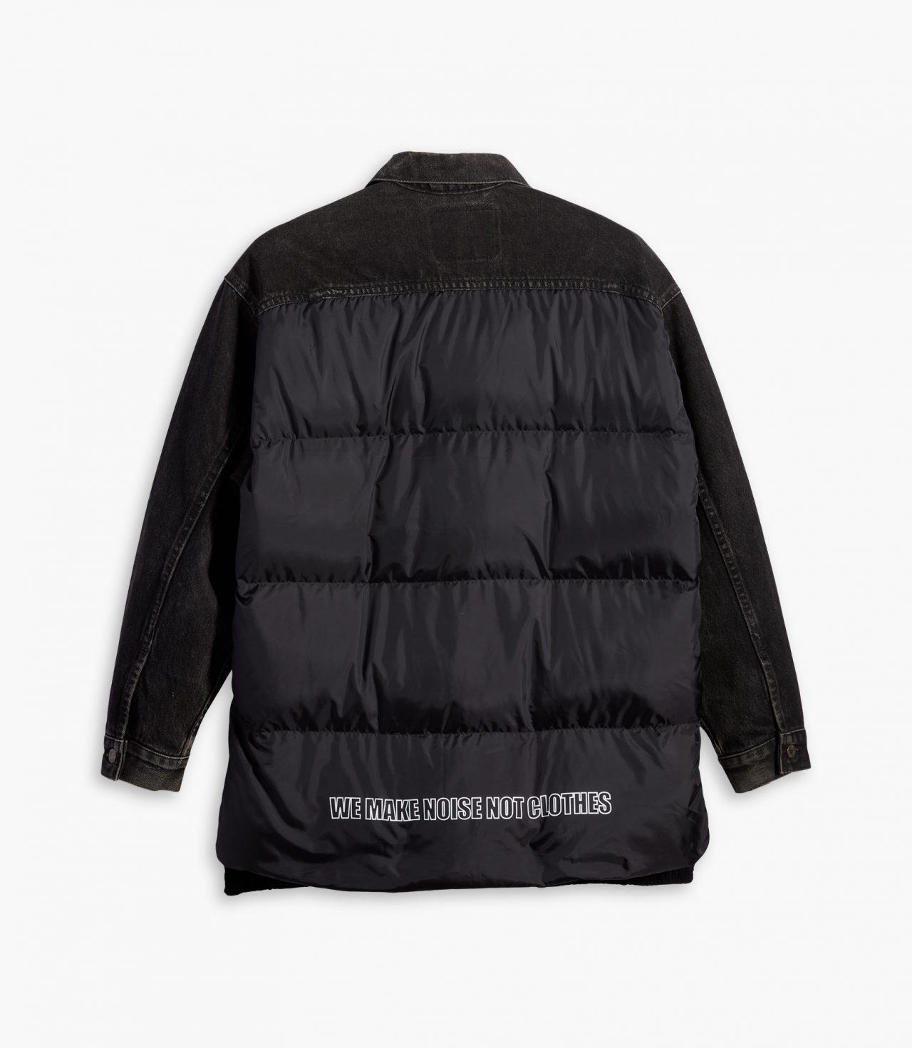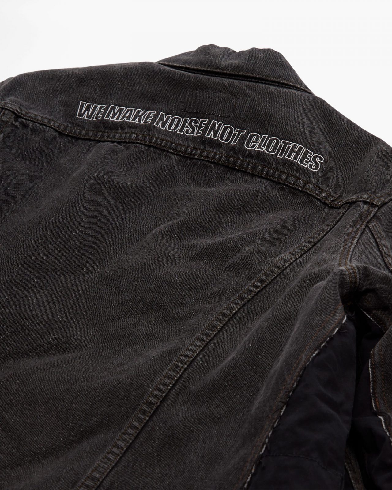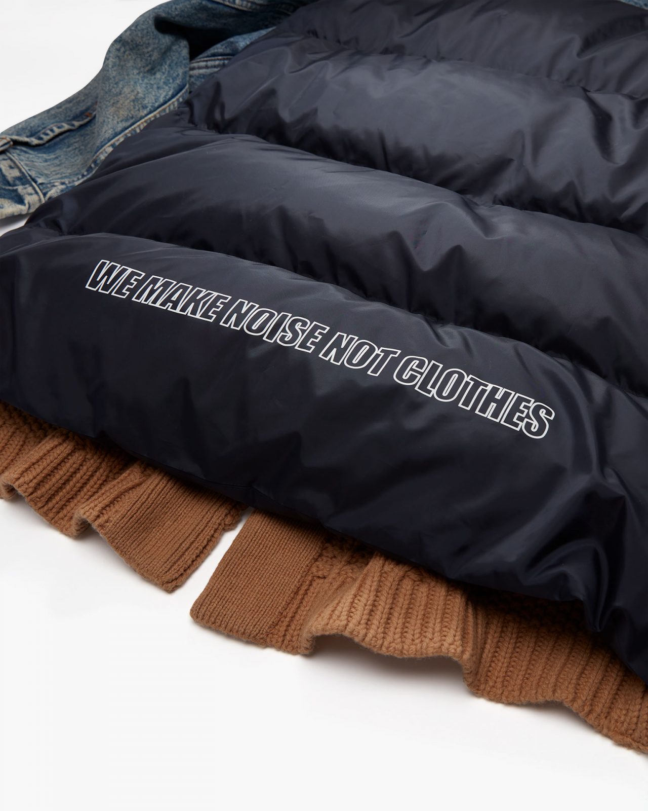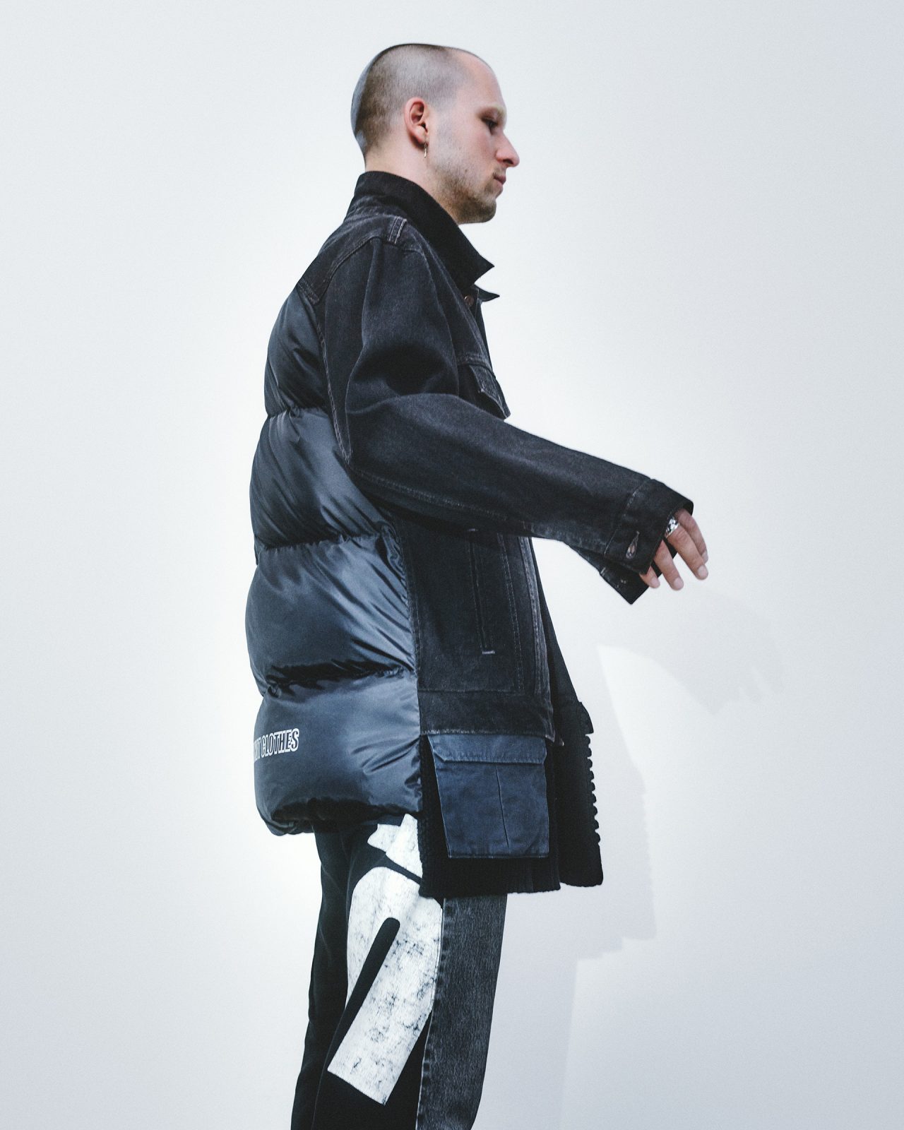 ヴィンテージの Levi’s® トラッカーを再構築したダウンジャケットは、ダウンのバックパネルとケーブル編みのボトムパネル、フロントにはリップストップのカーゴポケットを備えている。カラーは、インディゴウォッシュにカーキのケーブルニットのフロントパネルとネイビーのダウンバックパネル、またはブラックウォッシュにネイビーのケーブルニットのフロントパネルとネイビーのダウンバックパネルの2種類。どちらのジャケットも、ダウンのバックパネル下部に UNDERCOVER のブランドスローガンである「We Make Noise Not Clothes」が刺繍されているのが特徴だ。