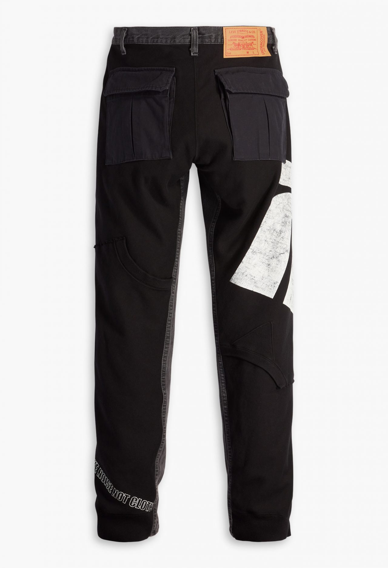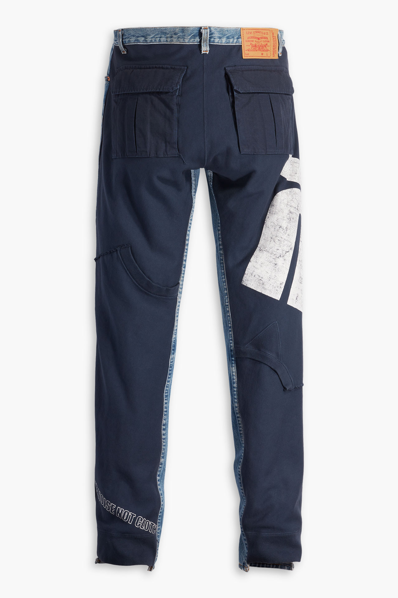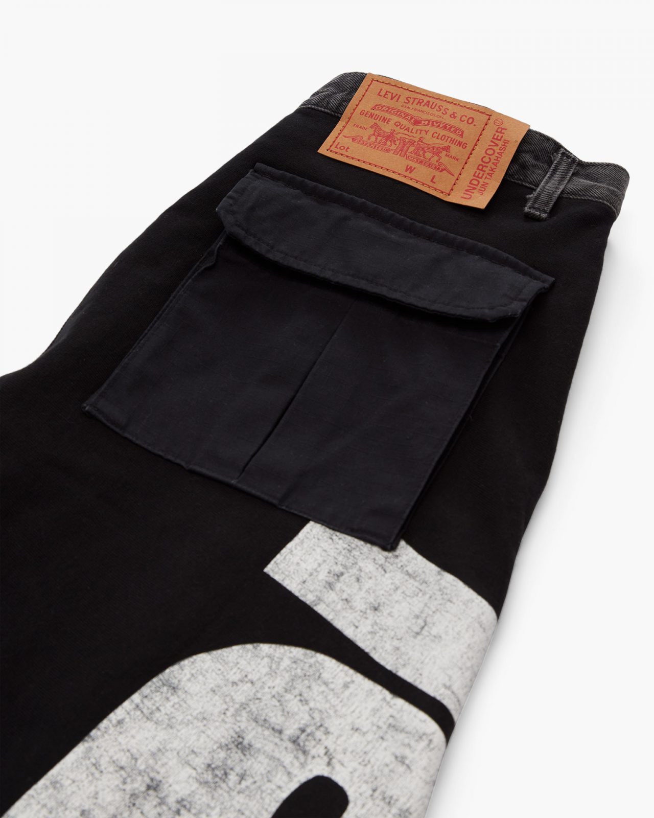 パンツには、フロントハーフに Levi’s® のヴィンテージジーンズ、バックハーフにフレンチテリー生地とコットンリップストップのカーゴポケットを組み合わせたスウェットパンツが登場。フロント側には、UNDERCOVER のフレーズ「REBELGODS」のプリントを施し、背面のフレンチテリー生地には、クルーネックのスウェットのディテール、ディストレストプリントの UNDERCOVER ロゴ、リップストップのバックポケットには Levi’s® の Red Tab を配している。それぞれのアイテムは、インディゴウォッシュとブラックウォッシュの2種類を展開する。さらに、6アイテムに全てに、Levi’s® を象徴するツーホースプルと UNDERCOVER のロゴを組み合わせた特別仕様のバックパッチや、両ブランドのハングタグが採用されている。