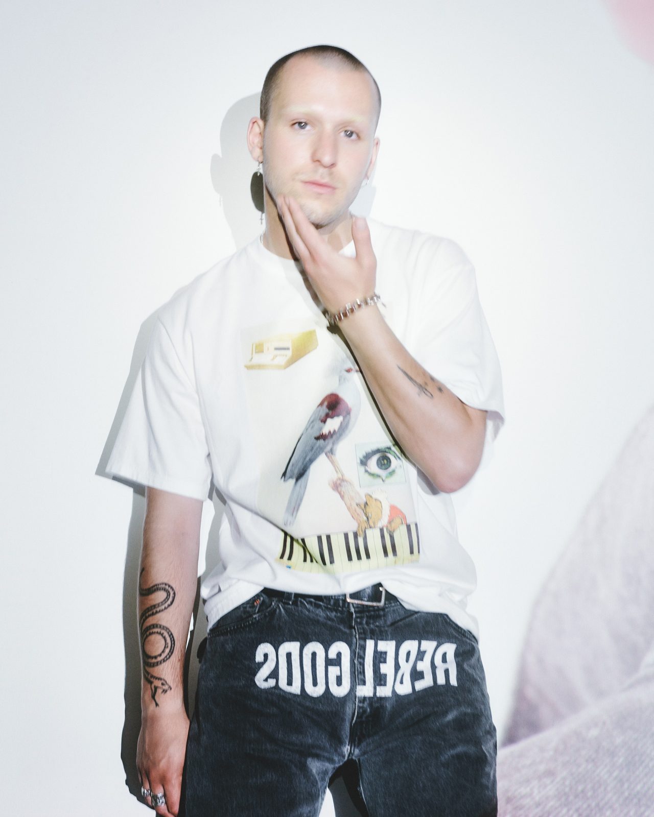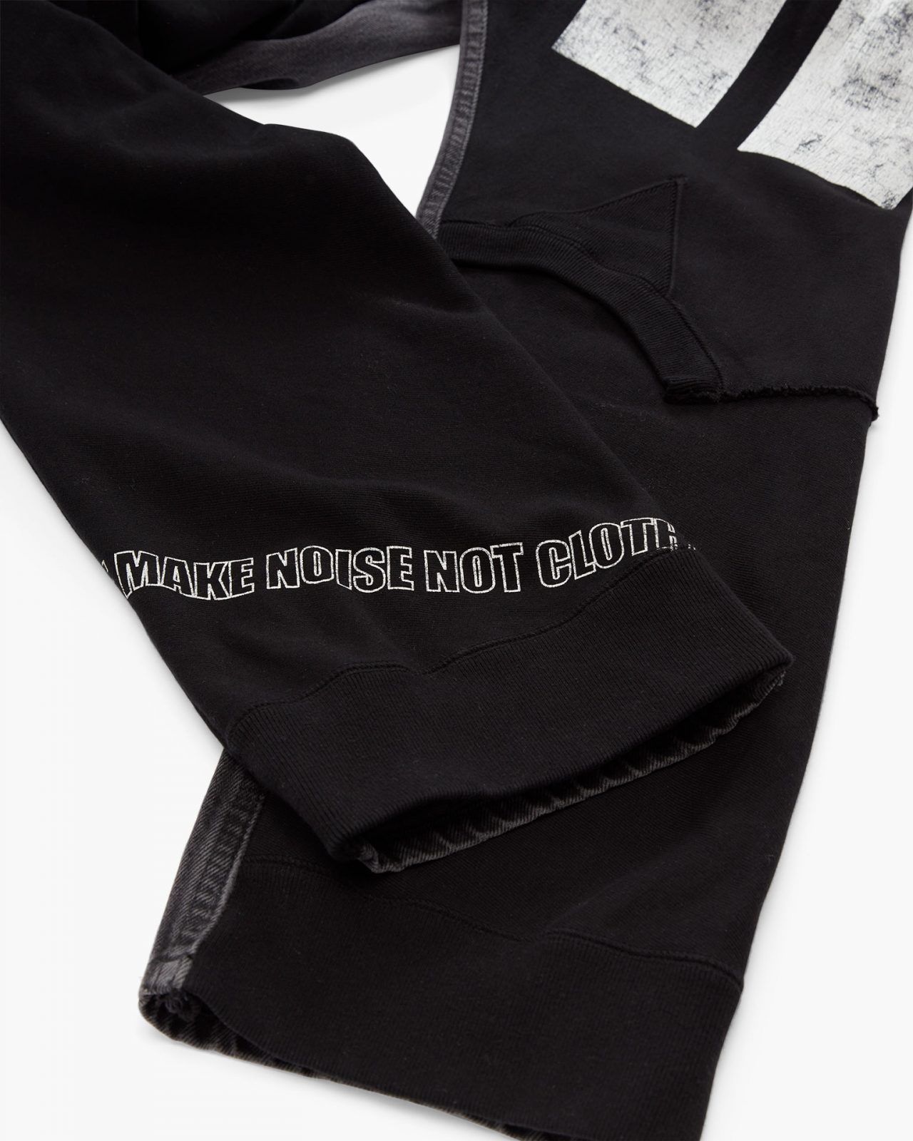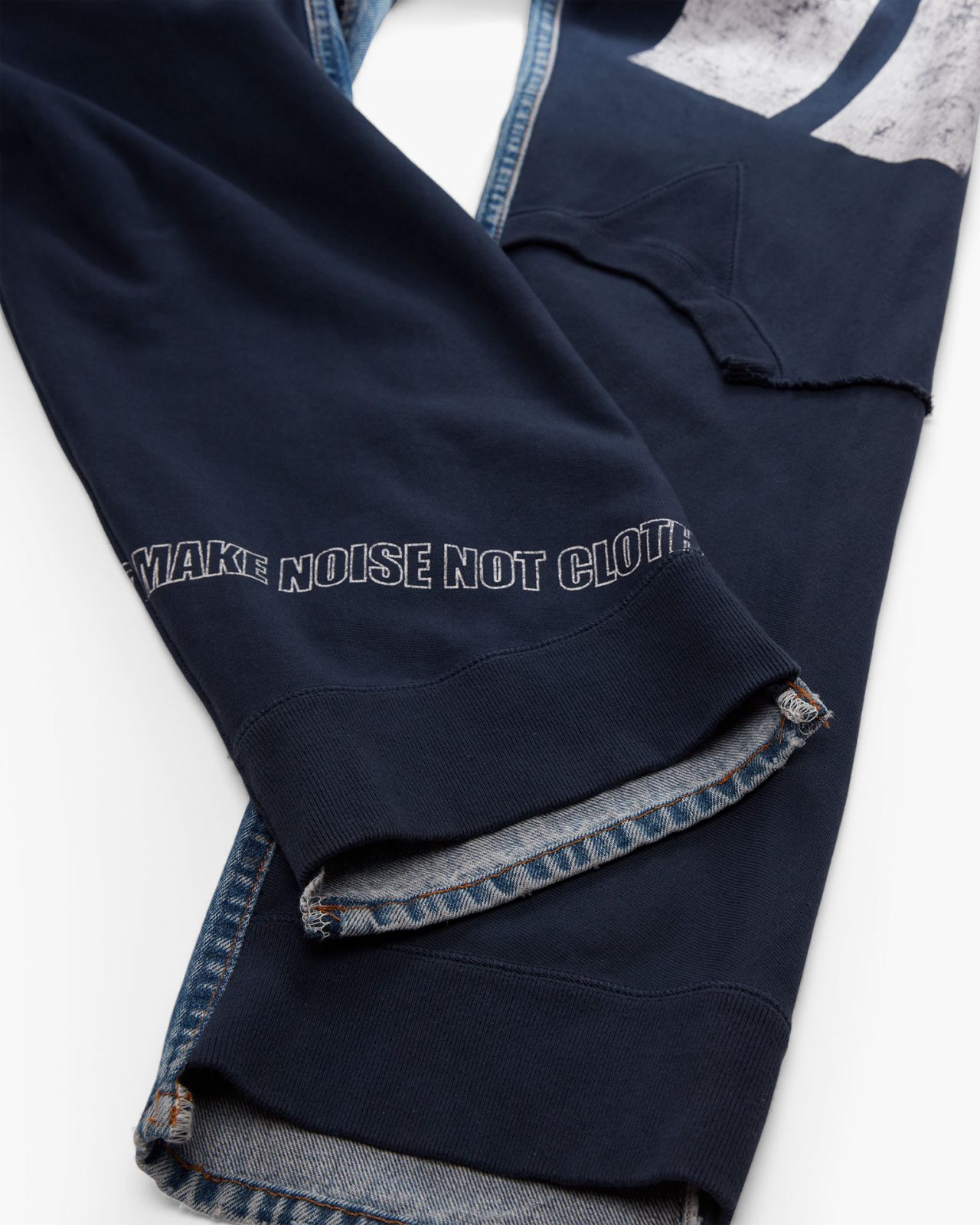 パンツには、フロントハーフに Levi’s® のヴィンテージジーンズ、バックハーフにフレンチテリー生地とコットンリップストップのカーゴポケットを組み合わせたスウェットパンツが登場。フロント側には、UNDERCOVER のフレーズ「REBELGODS」のプリントを施し、背面のフレンチテリー生地には、クルーネックのスウェットのディテール、ディストレストプリントの UNDERCOVER ロゴ、リップストップのバックポケットには Levi’s® の Red Tab を配している。それぞれのアイテムは、インディゴウォッシュとブラックウォッシュの2種類を展開する。さらに、6アイテムに全てに、Levi’s® を象徴するツーホースプルと UNDERCOVER のロゴを組み合わせた特別仕様のバックパッチや、両ブランドのハングタグが採用されている。