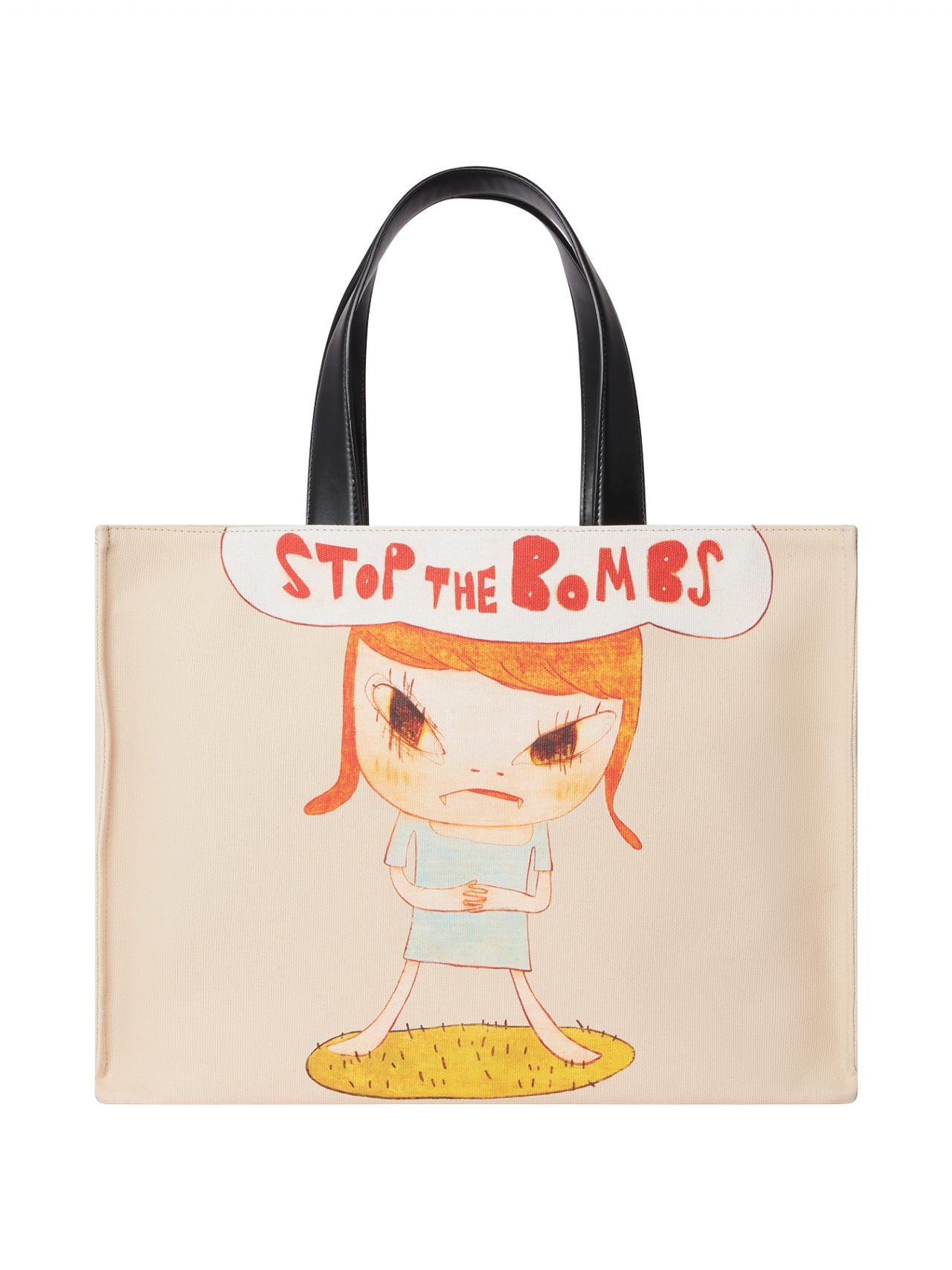 プラントベースのポプリンシャツ、クラシックウォッシュのワイドデニム、ヴィーガンレザーと「Alter Mat (オルター マット)」製のスリーブをあしらったダブルフェイスボンバージャケットなどがお目見え。ニットウェアには、いたずらっぽい表情を浮かべる動物たちが描かれたクルーネックジャンパーやカーディガンが揃う。さらに、フットウェアには、アイコニックな「Elyse(エリス)」プラットフォームシューズ、リサイクル可能な「Loop(ループ)」スニーカー、「Gaia(ガイア)」エスパドリーユサンダル、「Fur-Free Fur(ファーフリーファー)」プールスライドなどがラインナップ。また、奈良美智の作品「Misson (ミッション)」を配した日本限定デザインのバッグも要チェックだ。