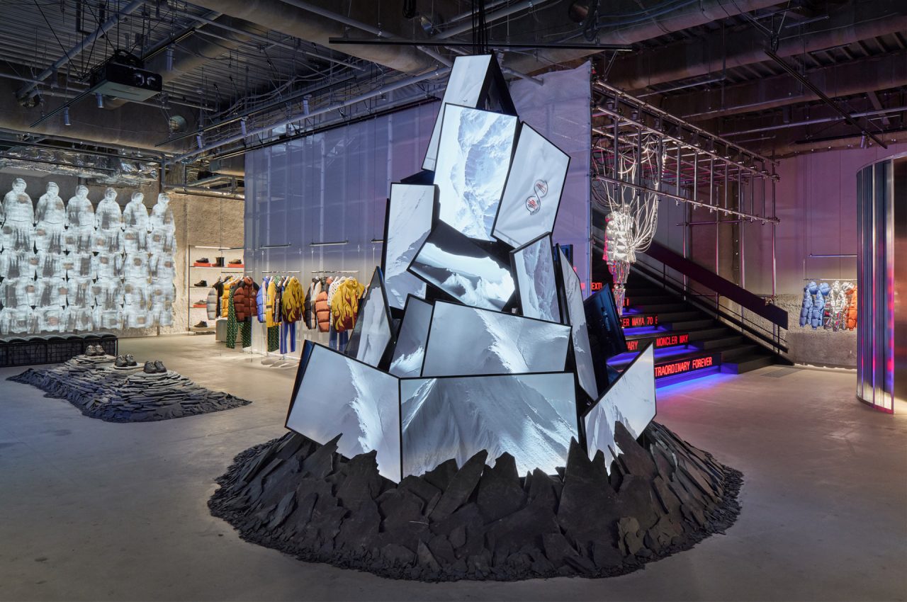 入り口で出迎えてくれるのは、山に着想を得たインスタレーション。本物の石の破片とデジタル画面が積み重なり、スクリーンには感動的な映像が映し出される。その隣のライトボックスの中には、360度回転するカメラを搭載。実際に Moncler のジャケットを試着し、自分だけの写真を作ることができる。