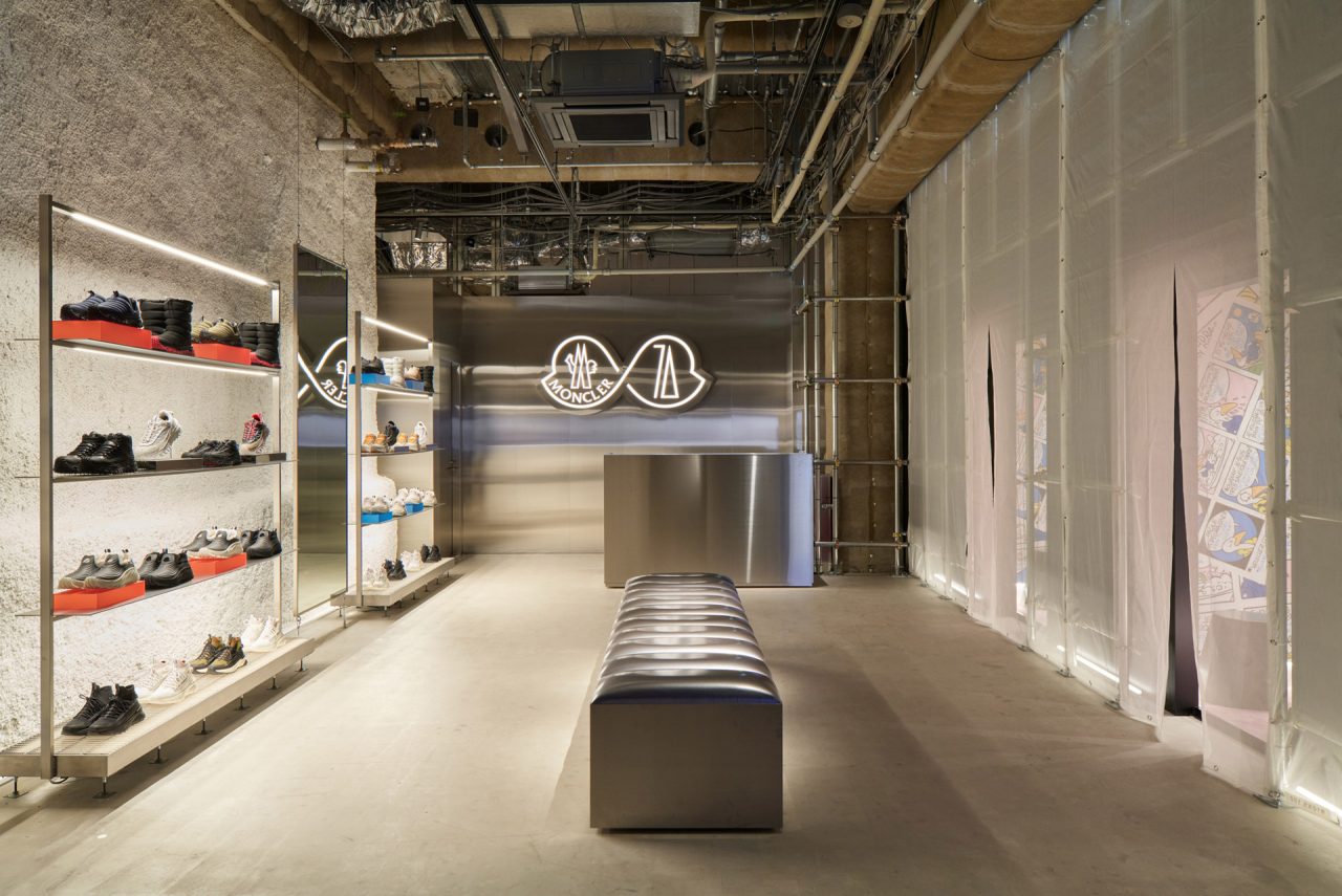 店舗を進むと「Moncler Maya 70 Jacket (モンクレール マヤ 70 ジャケット)」から作られた、プロジェクションウォールが登場。この白いジャケットは、創業70周年を記念してデザインされたもの。先月11月にミラノで行われたアニバーサリーパフォーマンスでは、創業年にちなんで1,952名すべての出演者が揃って着用し、観客を圧巻した。