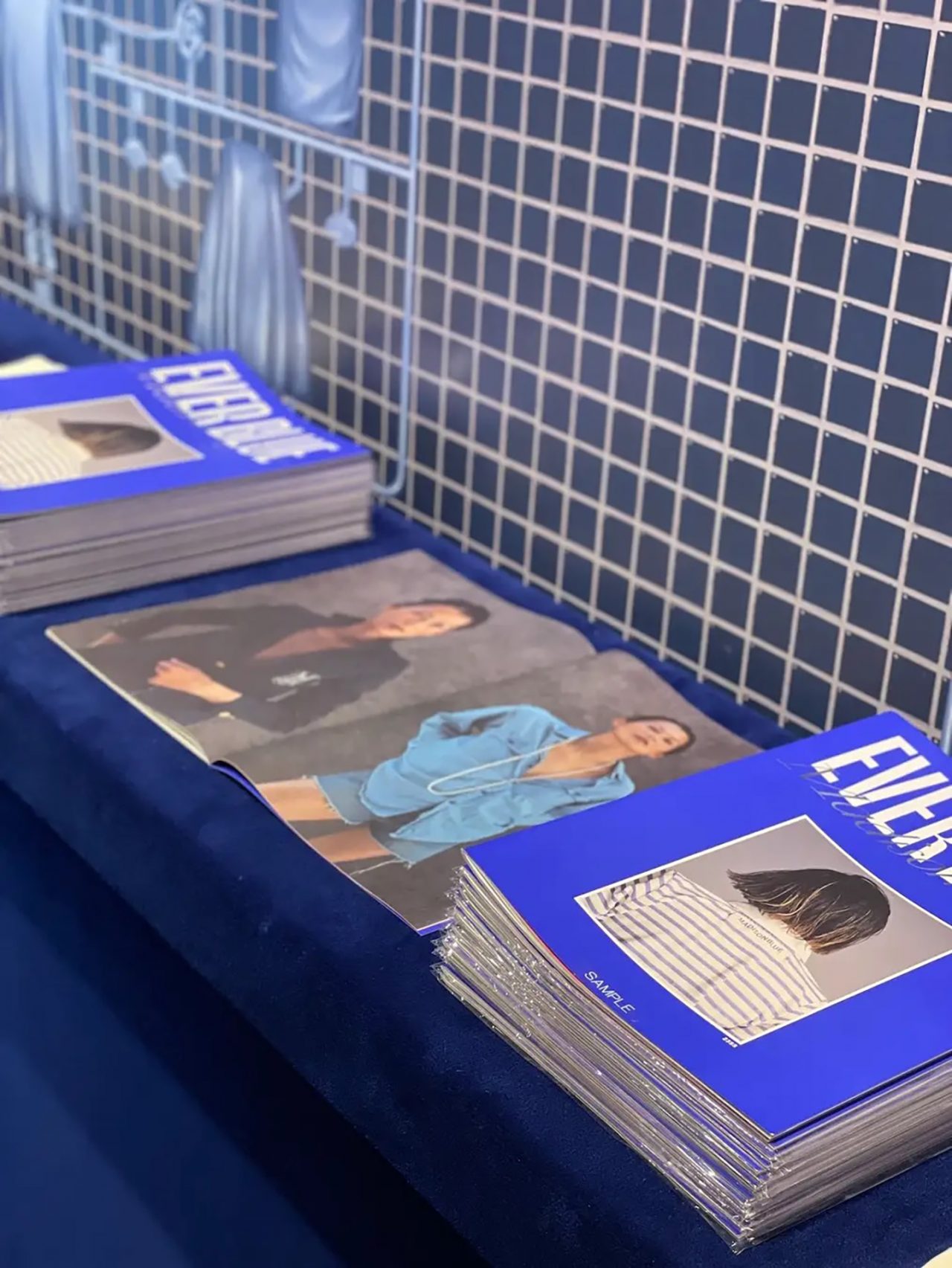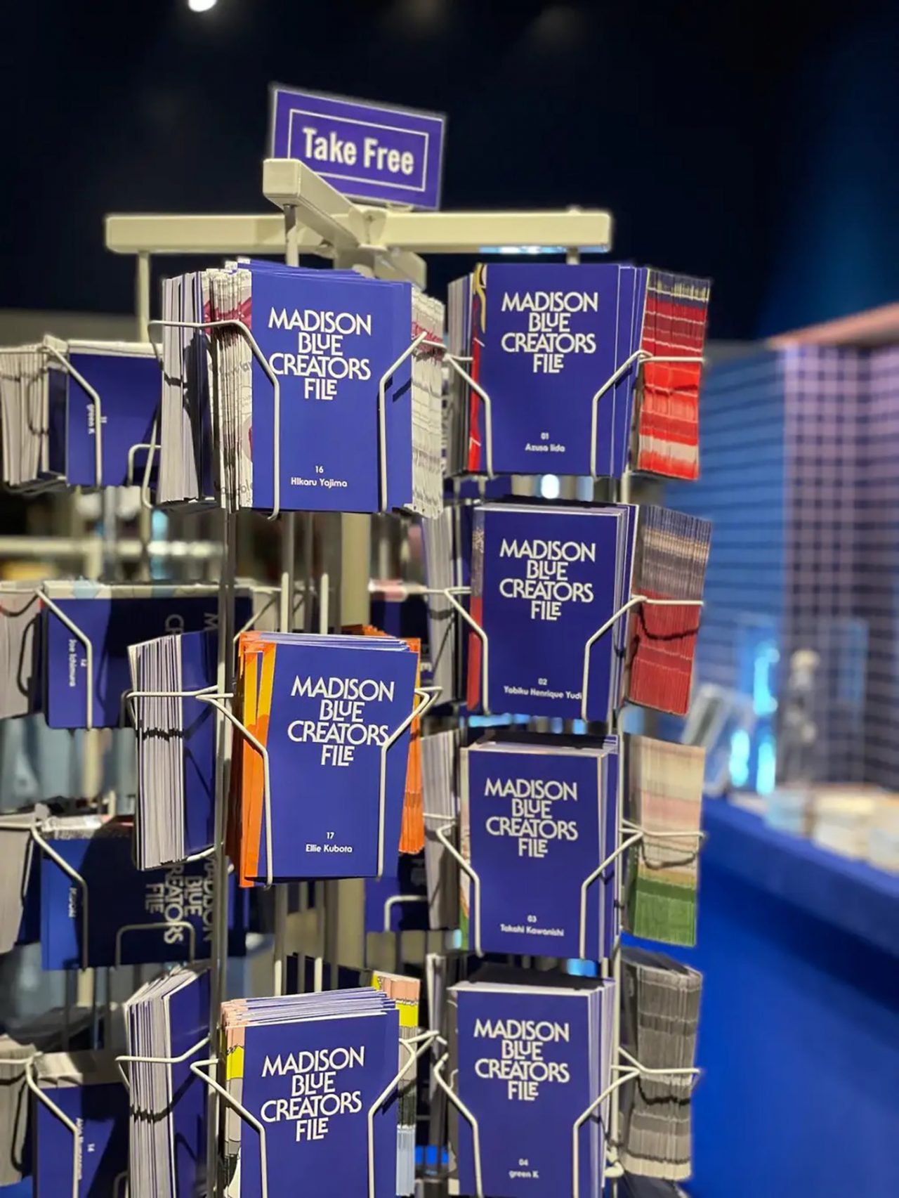 ブルーで彩られた会場では、バッグナンバーの販売と同時に、ブランドを代表するシャツやシューズ、ペーパーバッグなどの洋服の一部を販売。さらに、クリエイター全20名の ZINE とスペシャルインタビュー2冊、スペシャルエディション2冊を含む、計24冊の「CREATORS FILE (クリエーターズファイル)」も用意 (TAKE FREE)。MADISONBLU の世界観を堪能できる空間で、最新号を手に取ってみて。