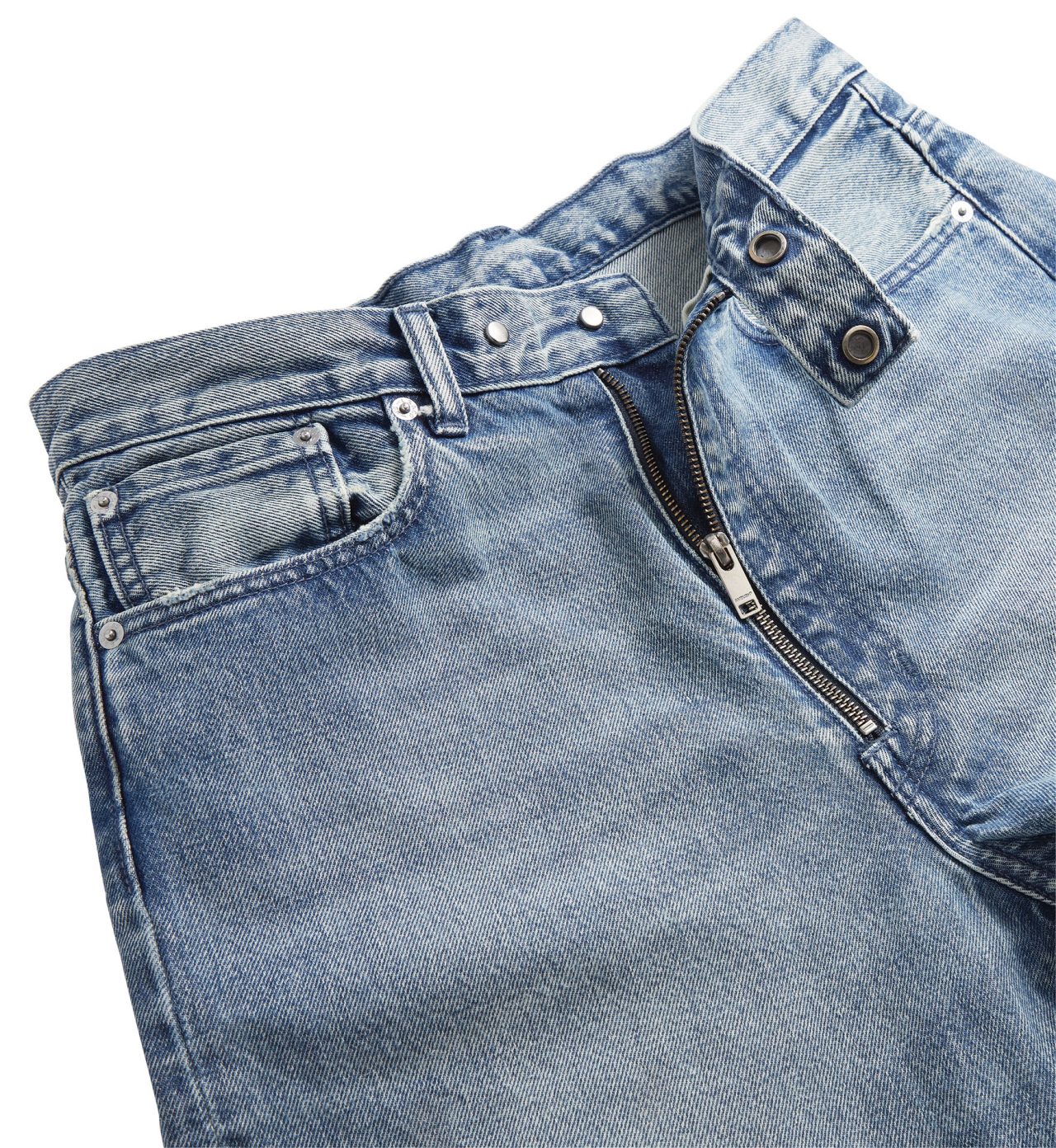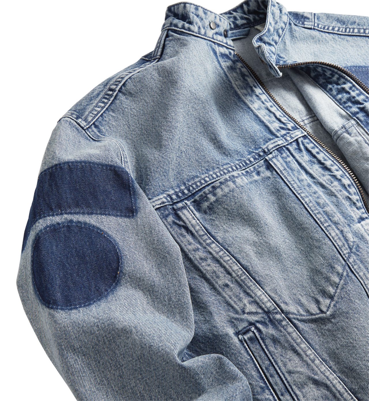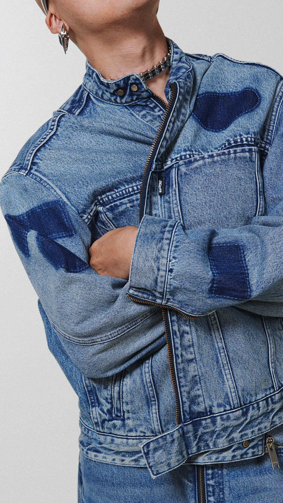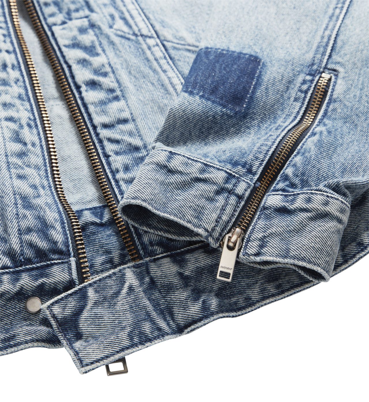 クラシックなカフェレーサー の Moto ジャケットから着想を得たバイカージャケットは、ミッドインディゴウォッシュでスナップボタンのラッチ付きスタンドカラー、チャンキーな AMBUSH® のジッパープルを備えた8番フロントが特徴。胸と袖にはシャドーパッチを施し、洗い加工後にパッチを外すことでパッチのアタリを表現している。バックスタイルにはアコーディオンディティールのウエストパネルを付属。2つの胸ポケットとサイドポケットも備え、実用性も高いアイテムになっている。