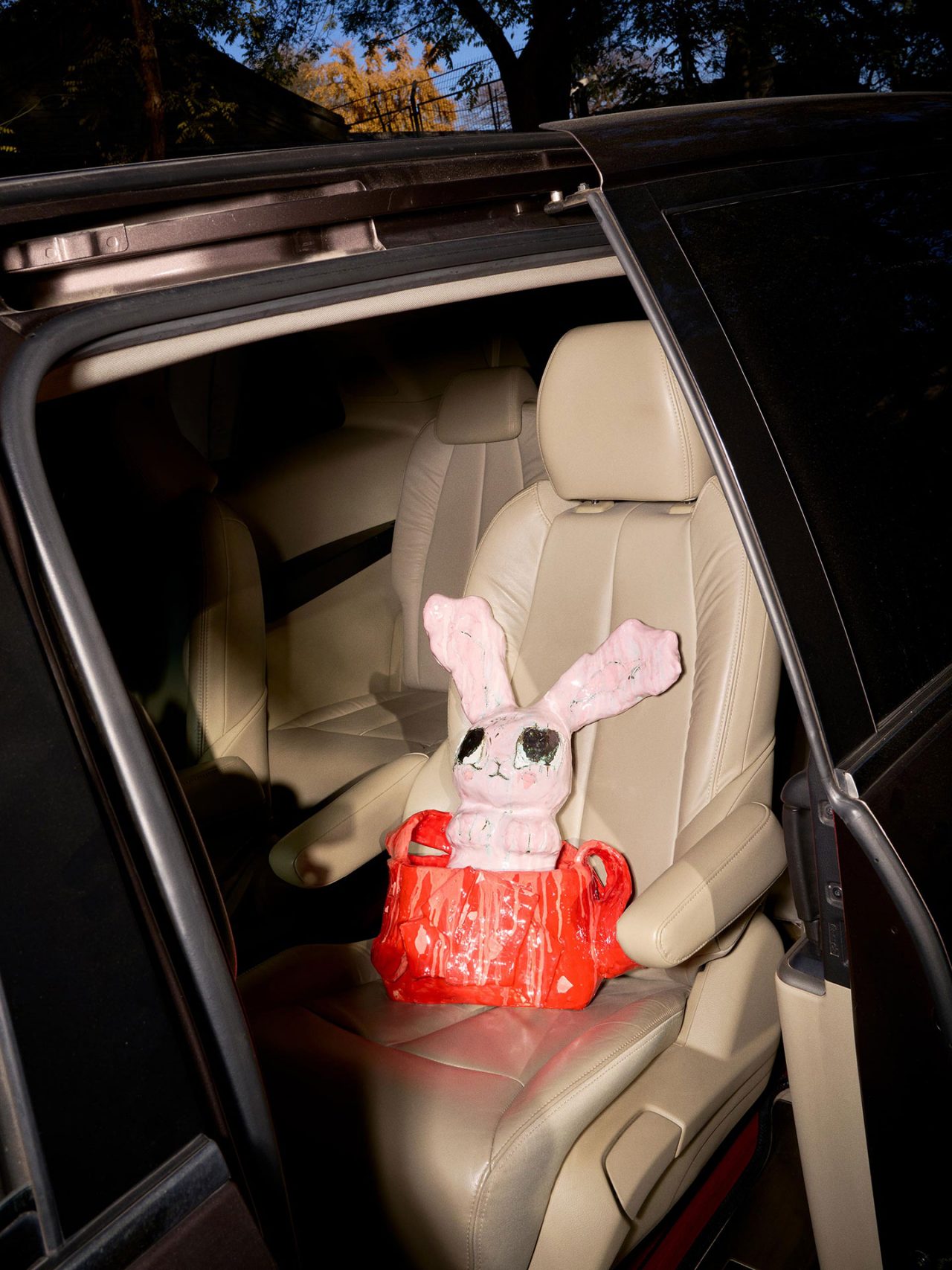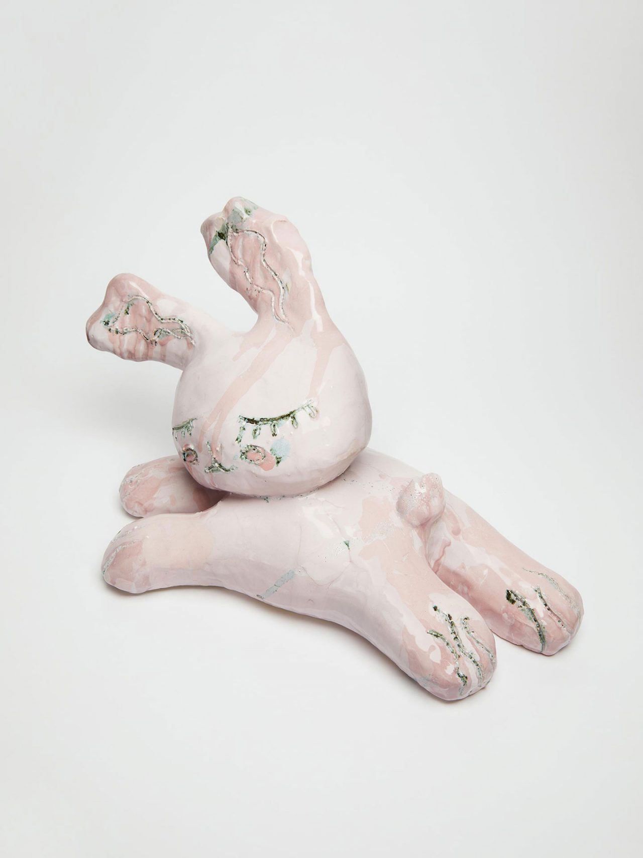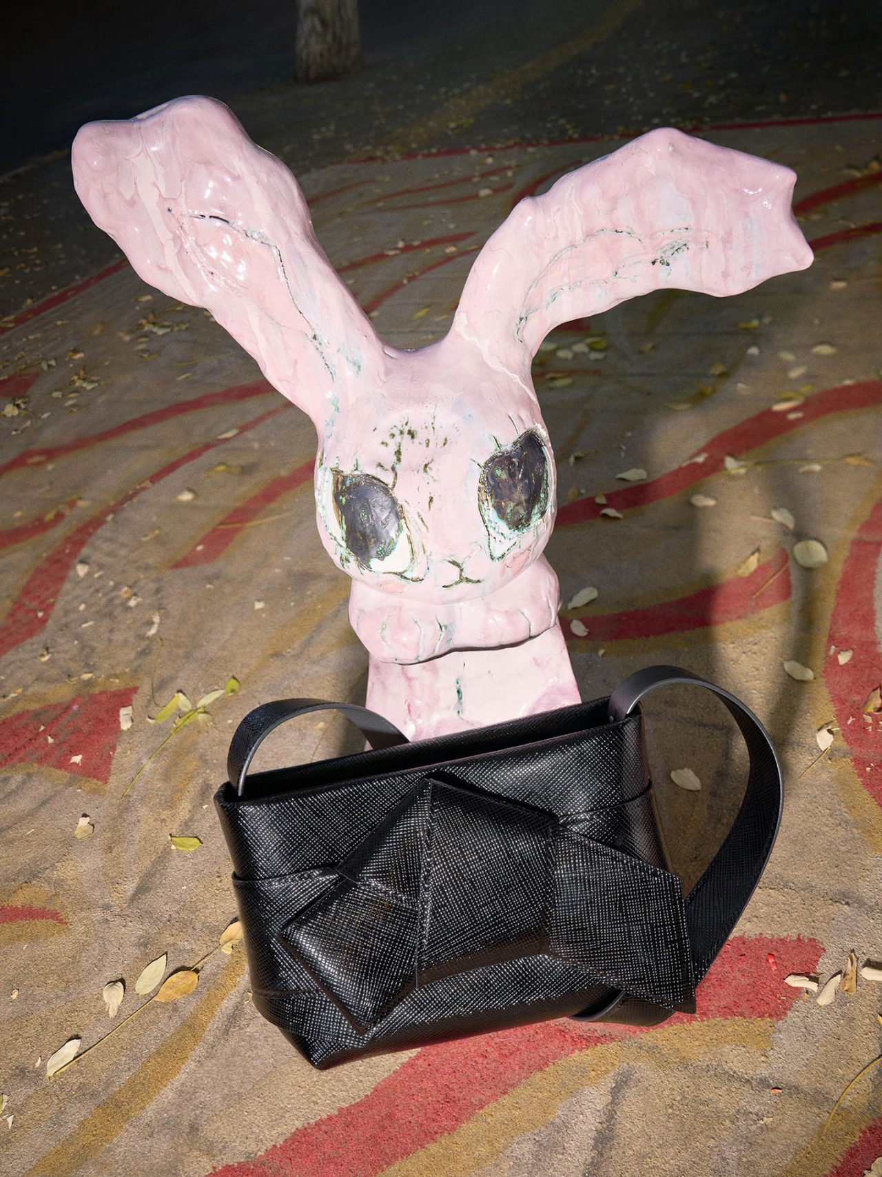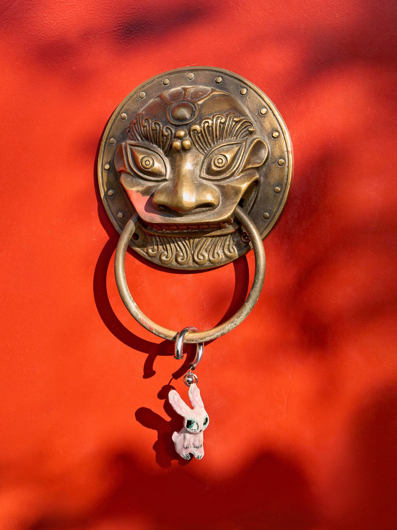 Apollinaria Broche は、遊び心のある工芸品やアンティークの置物からインスパイアされた動物モチーフの作品を制作している陶芸アーティスト。今回、新たにお目見えした「Acne Studios × Apollinaria Broche Chinese New Year」では、干支にちなんで「BUN BUN」という幸運のウサギをモチーフに、ホームウェアやジュエリー、スカルプチャーを展開。エナメルの「BUN BUN」チャームを施した、重厚なチェーンのネックレスやシルバーのフープピアス、「BUN BUN」がプリントされた、ソフトピンクのニットブランケット、さらには、愛らしいウサギを表現した限定のエナメル・スカルプチャーコレクションもお目見えした。Acne Studios のアイコニックな「Musubi (ムスビ)」バッグから「BUN BUN」が顔を覗かせているスカルプチャーなど、遊び心のあるコレクションは必見だ。