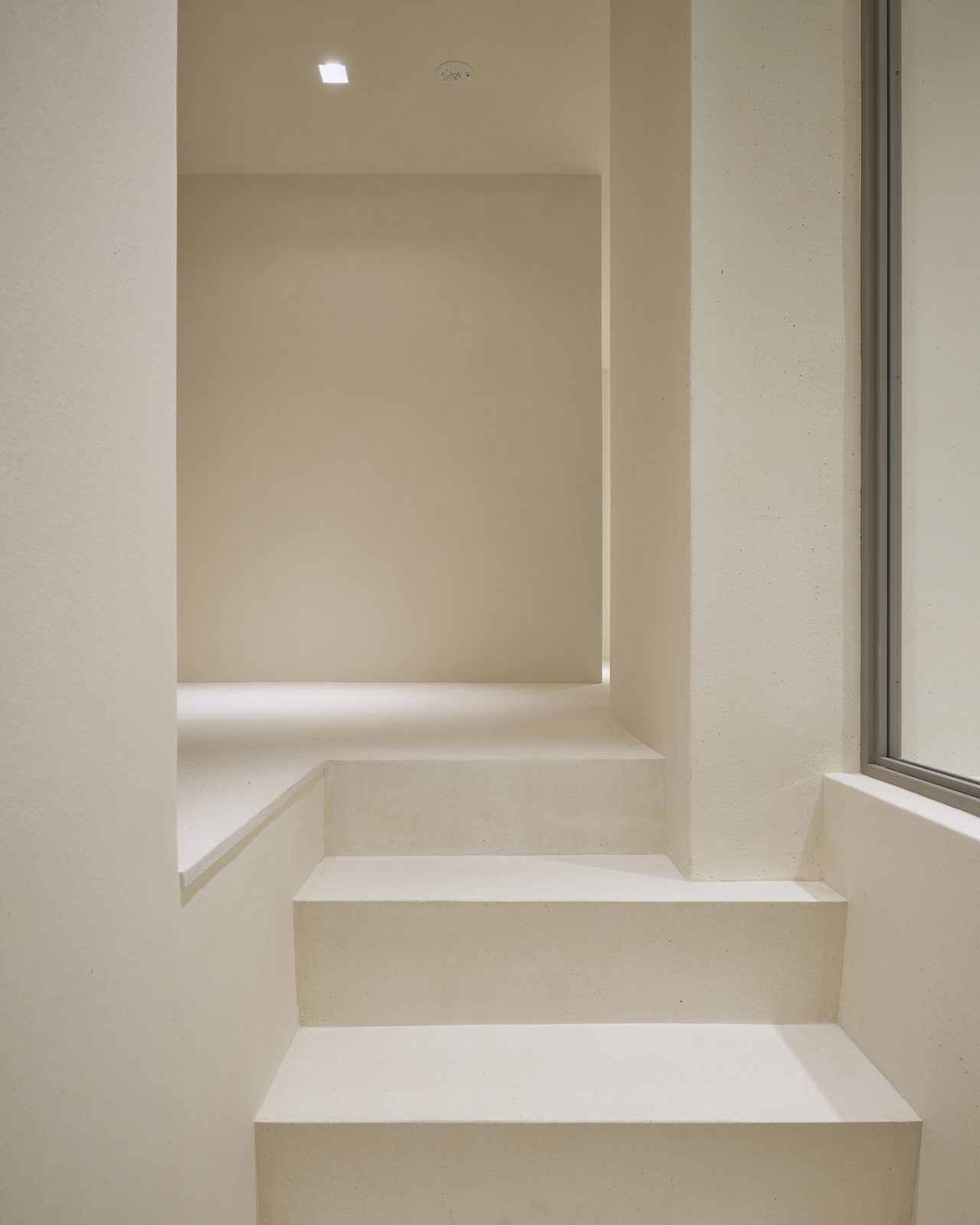 店内は壁から天井、床、什器などのゲストを包み込む空間全体が、左官による印象的な黄みを帯びた白色で表現。珊瑚などが蓄積した沖縄県産の石灰石をベースに、大分県で採取した竹を粉砕し混ぜ込むことで生まれる独特な質感と立体感が空間に柔らかさと温かみをもたらしている。着色を一切施さず、自然のまま劣化することない石灰石が作り出す凛とした静けさは、デザイナー黒河内真衣子の故郷である長野の原風景と重なり合う。
