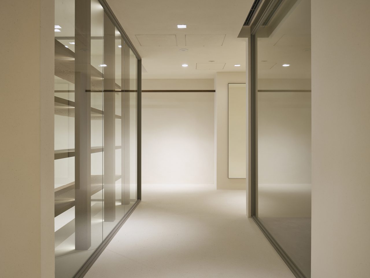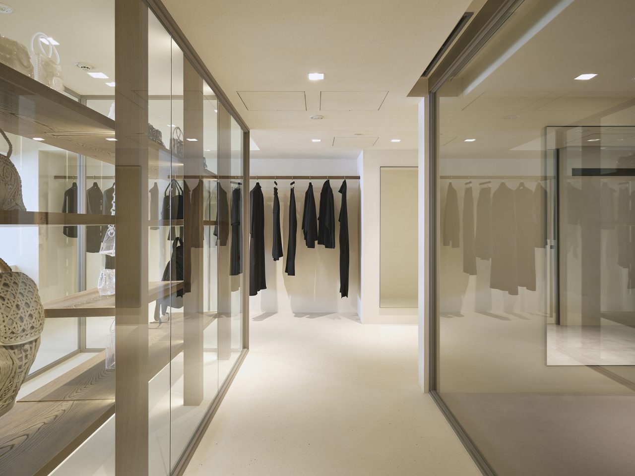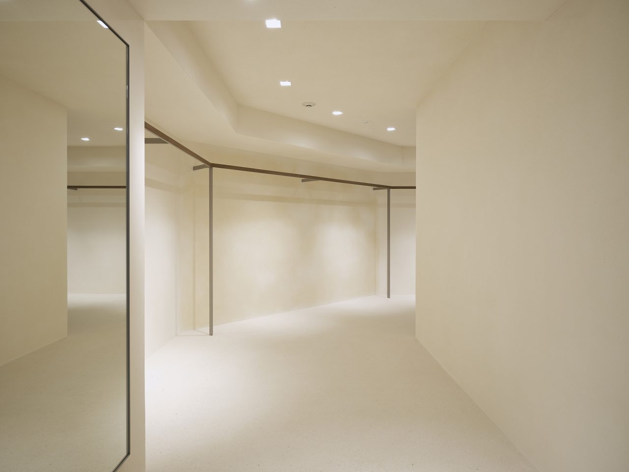 柳原氏により設計された非日常への招待は、エントランスからわずかに覗く箱庭から始まる。Mame Kurogouchi の世界観を表した小宇宙は、いくつもの季節のサイクルを経て今も残る普遍的な風景として、ゲストに自身の記憶への再訪を投げかける。階段を上った先で展開されるのは、立ち並ぶ壁により曖昧に仕切られたフロア。まるで貝殻の中を進むかのような体験は、次々と現れる洋服の「発見」していく感覚を促すだろう。青山の街から始まるユニークな空間体験は、日常と非日常を行き来しながら、静寂と騒然、自然と都市、文化と歴史といった様々な要素を優しく包み込むことで、ゲストのパーソナルメモリーとして昇華されながら、ブランドの世界をより広く、多様に、雄弁に物語るものとなる。