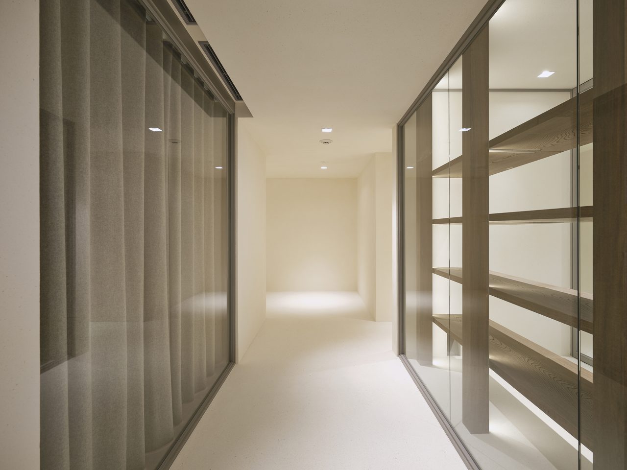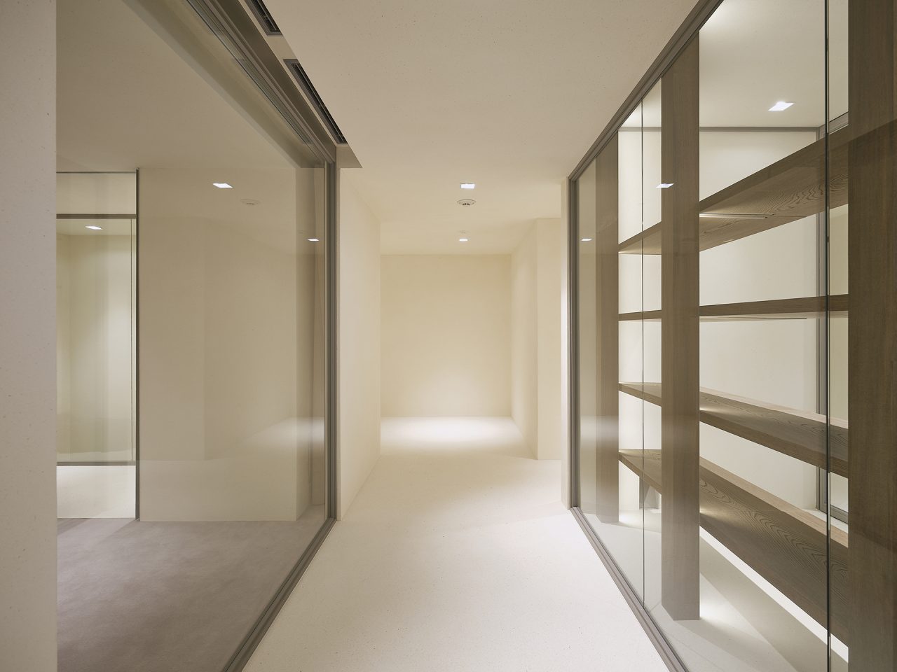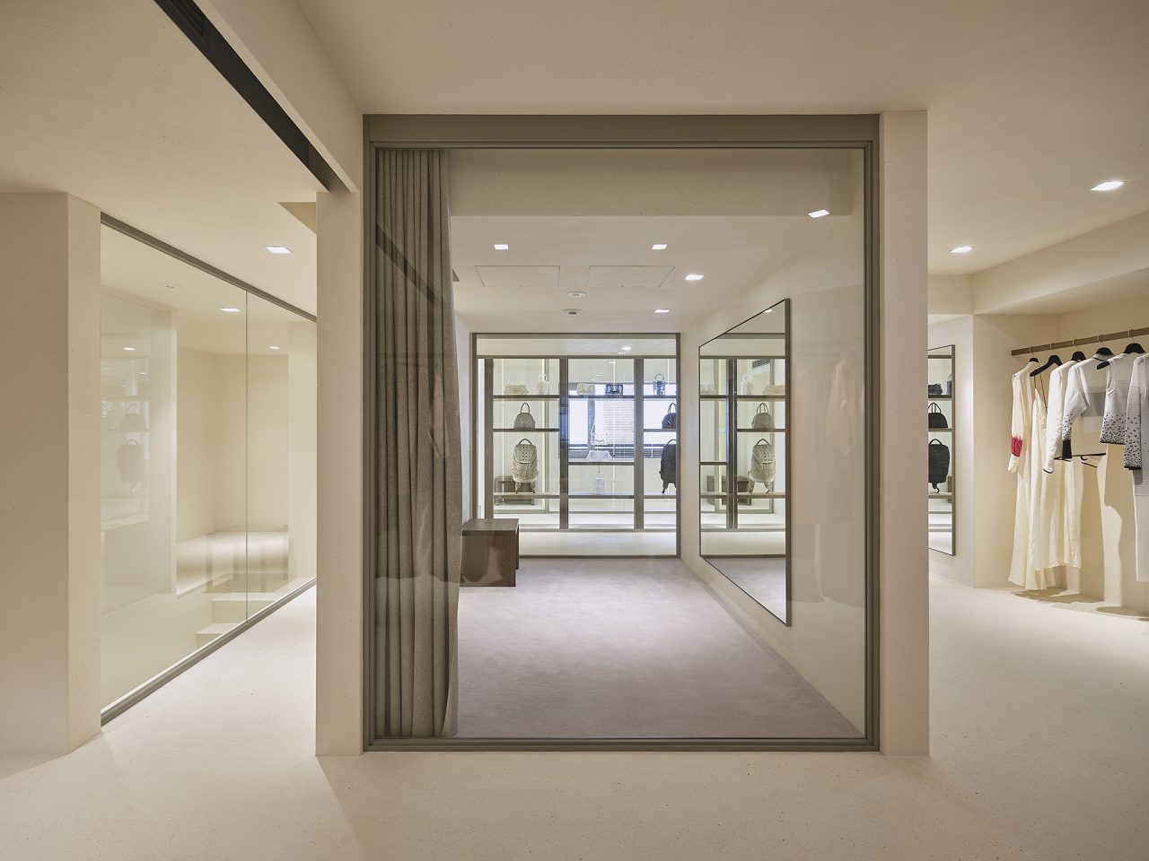 柳原氏により設計された非日常への招待は、エントランスからわずかに覗く箱庭から始まる。Mame Kurogouchi の世界観を表した小宇宙は、いくつもの季節のサイクルを経て今も残る普遍的な風景として、ゲストに自身の記憶への再訪を投げかける。階段を上った先で展開されるのは、立ち並ぶ壁により曖昧に仕切られたフロア。まるで貝殻の中を進むかのような体験は、次々と現れる洋服の「発見」していく感覚を促すだろう。青山の街から始まるユニークな空間体験は、日常と非日常を行き来しながら、静寂と騒然、自然と都市、文化と歴史といった様々な要素を優しく包み込むことで、ゲストのパーソナルメモリーとして昇華されながら、ブランドの世界をより広く、多様に、雄弁に物語るものとなる。