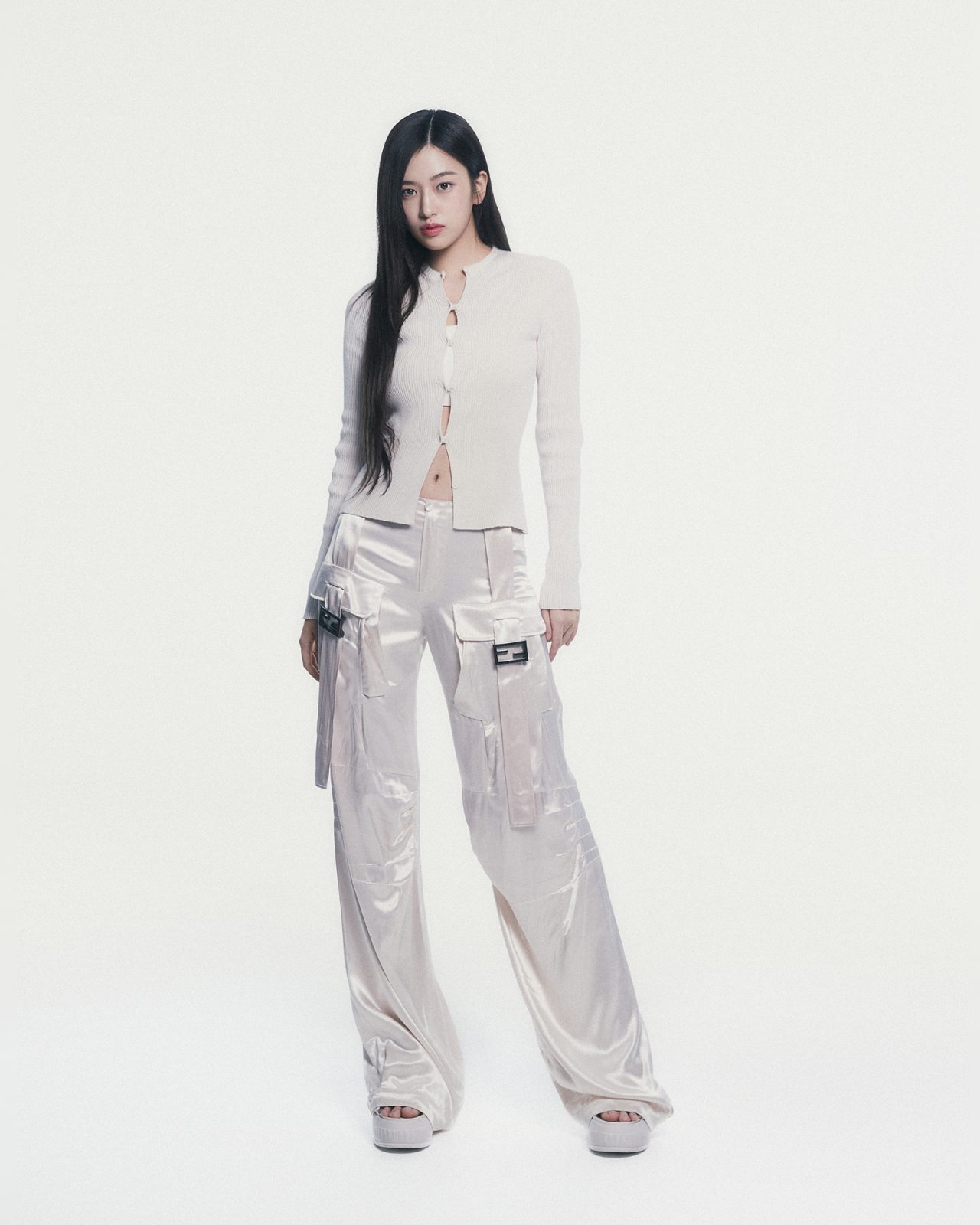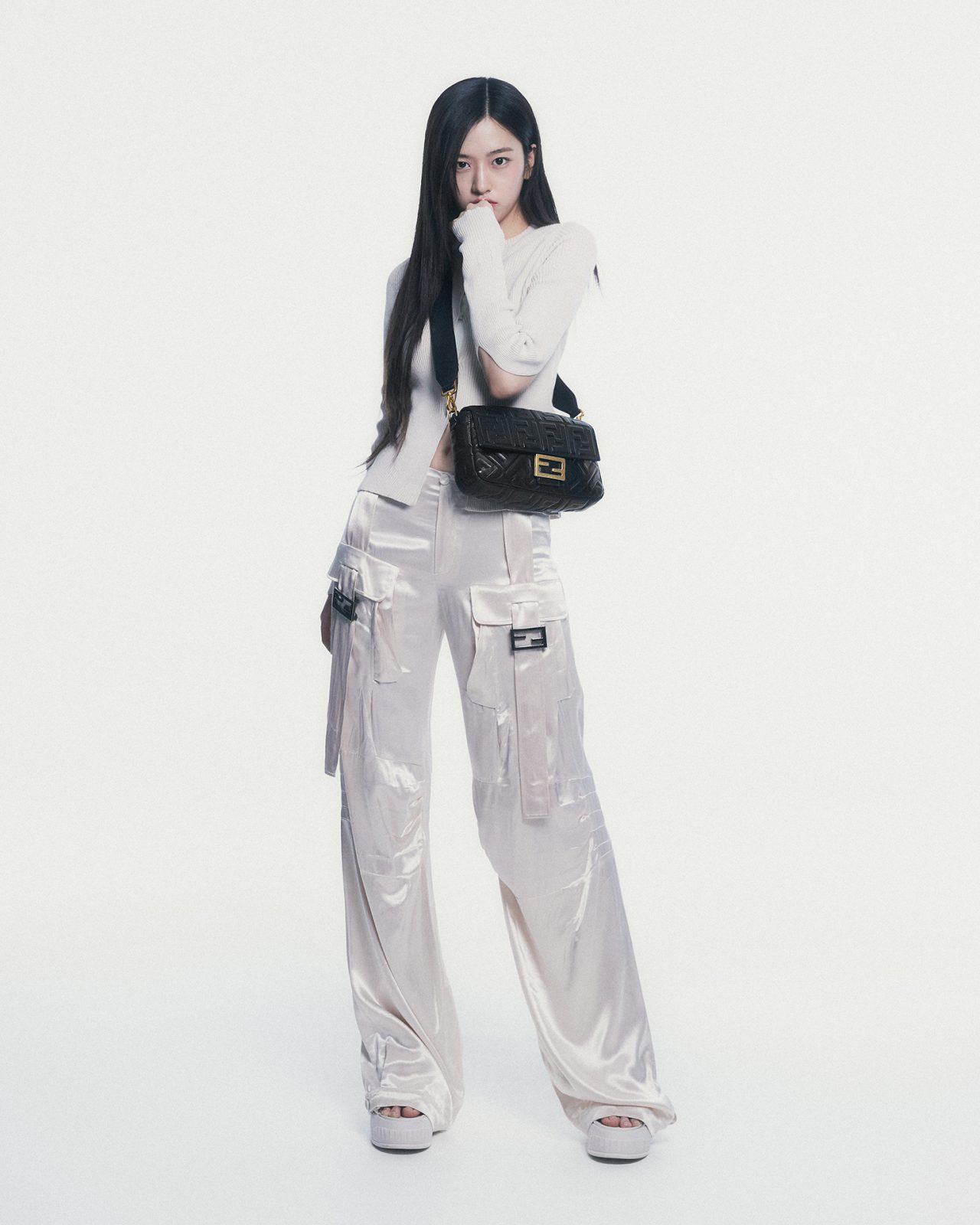 今回公開されたビジュアルでは、FENDI 2023年春夏 ウィメンズコレクションよりアイボリーのカーディガンと「BAGUETTE (バゲット)」ディテールのポケットをあしらったカーゴパンツを着用。ブランドのアイコンバッグである「PEEKABOO ISEEU SMALL (ピーカブー アイシーユー スモール)」や「BAGUETTE」を合わせ、フレッシュで Z 世代らしいスタイルを披露した。