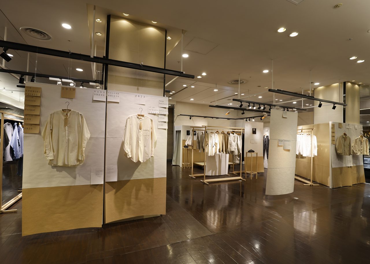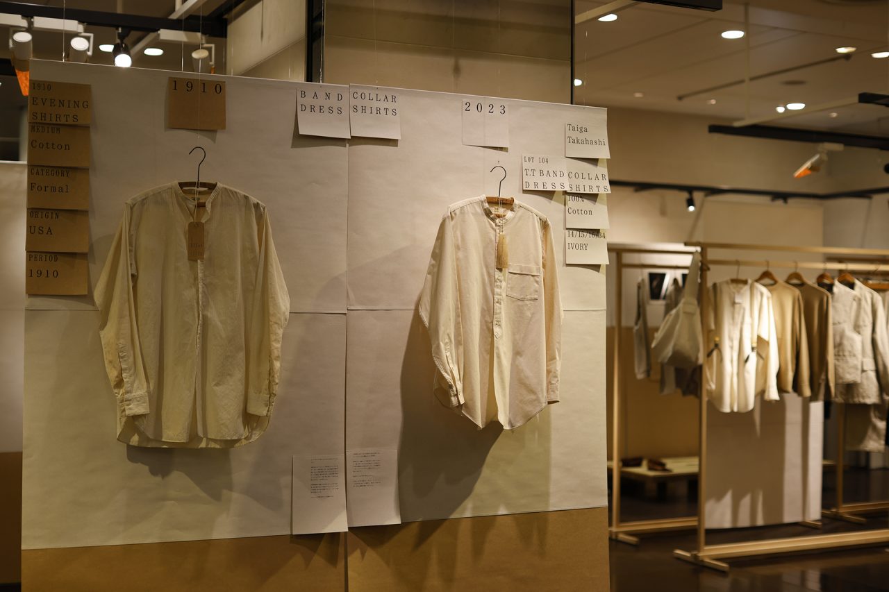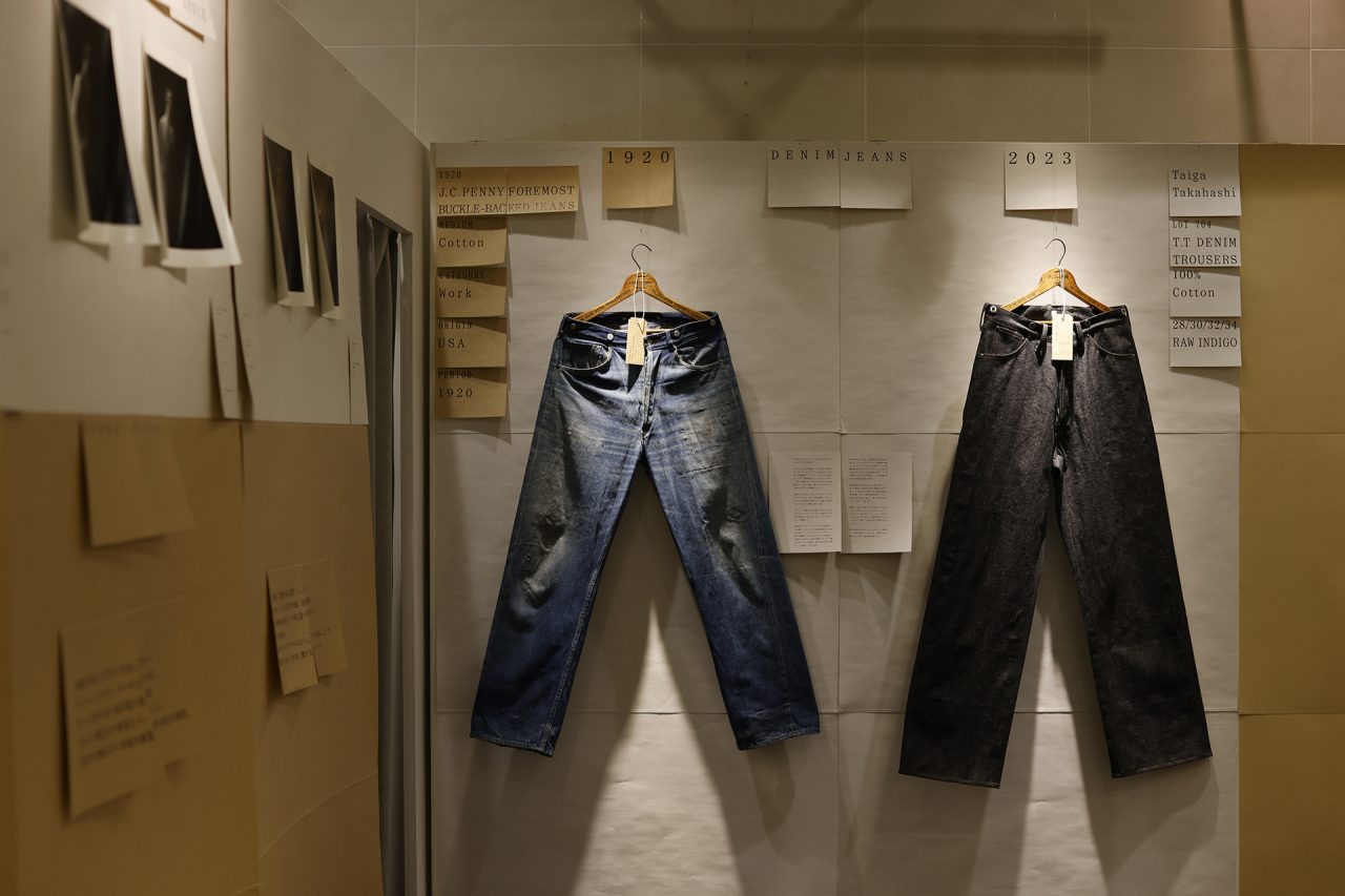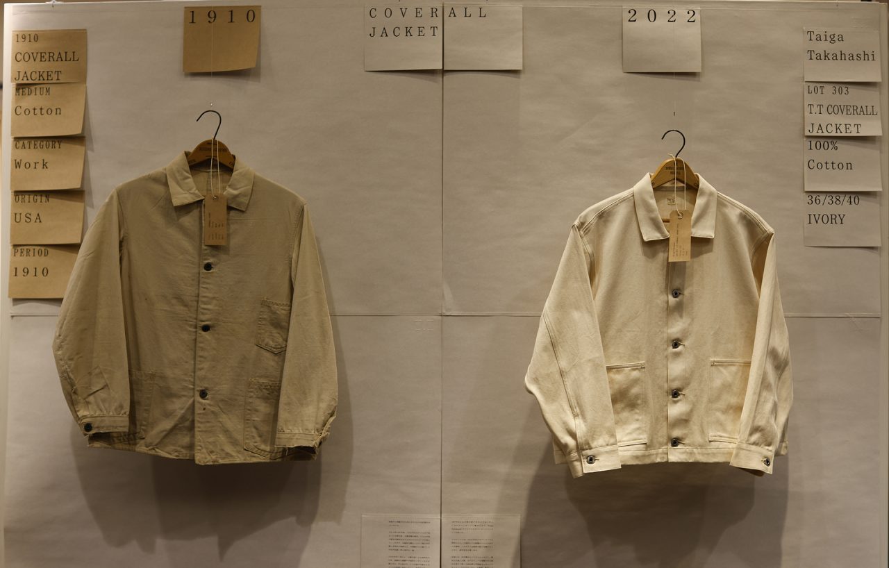 手作りの懸垂幕を背景に、Taiga Takahashi のシグネチャーアイテムであるカバーオールジャケット、デニムトラウザー、バンドカラードレスシャツと、その着想源となったヴィンテージピースを並べて展示。ヴィンテージから復元した Taiga Takahashi のオリジナル素材であるセルビッジ生地やオリジナルのベークライトボタン、丸胴カットソー、泥染め皮パッチなど、プロダクトの裏側にあるストーリーやデザイン、開発に込めた想いなども知ることができる。
