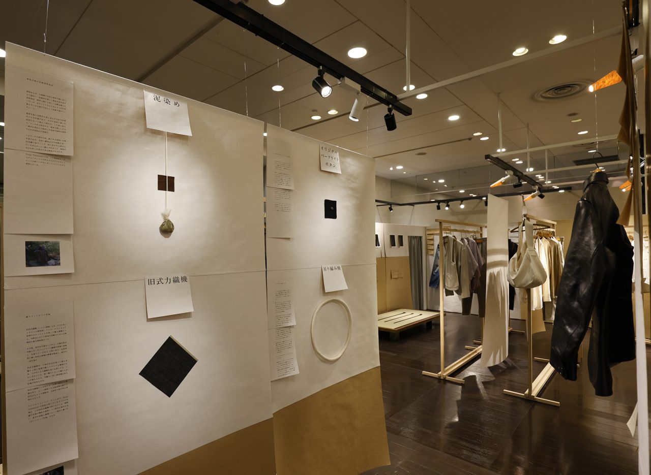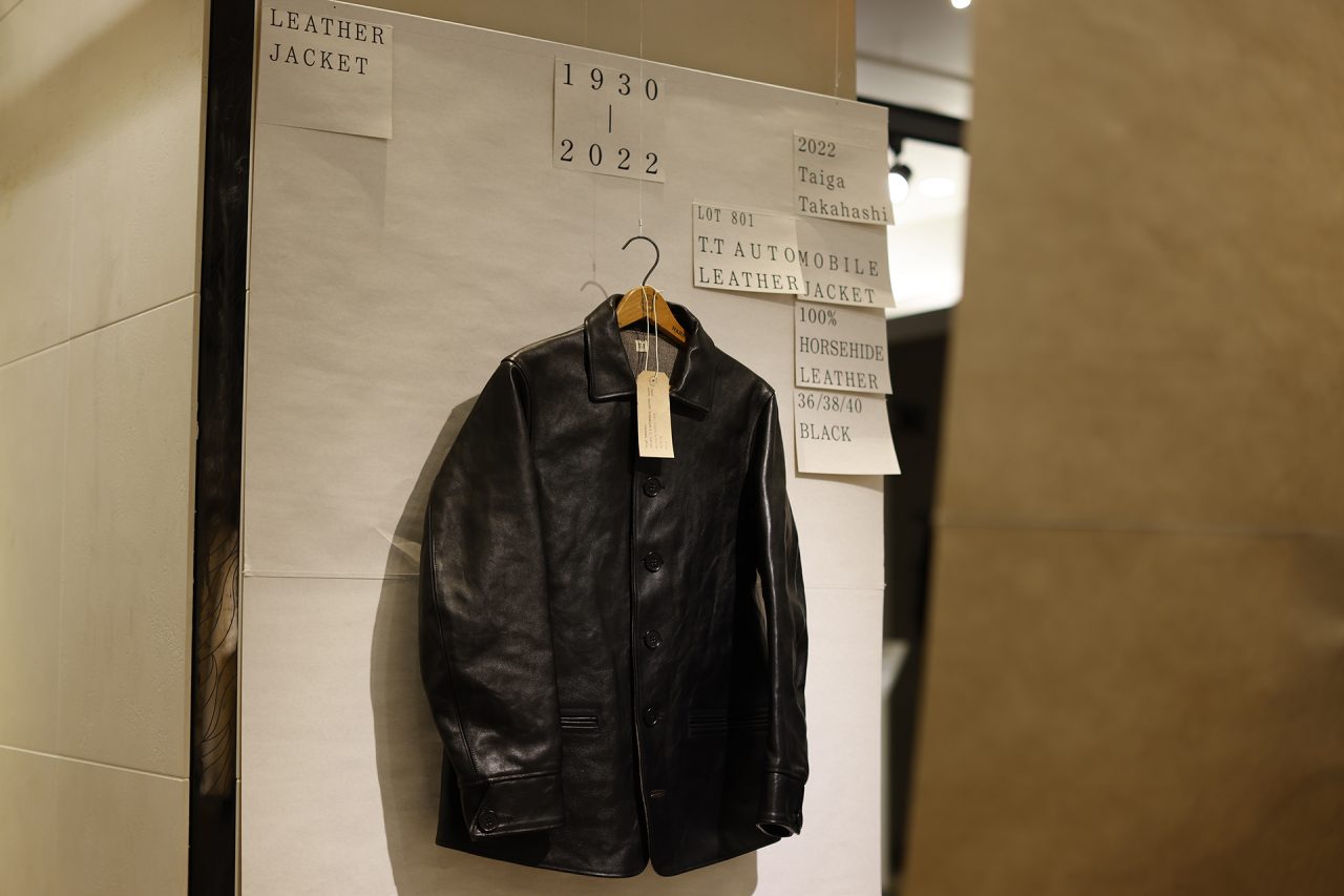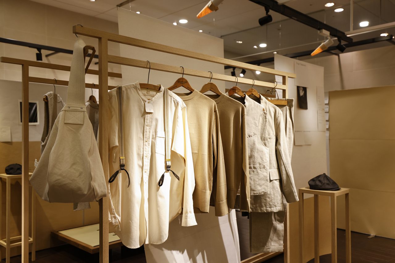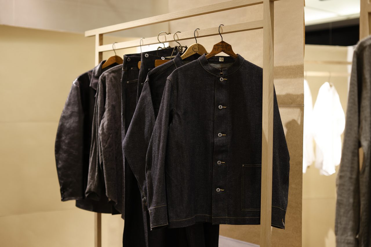 手作りの懸垂幕を背景に、Taiga Takahashi のシグネチャーアイテムであるカバーオールジャケット、デニムトラウザー、バンドカラードレスシャツと、その着想源となったヴィンテージピースを並べて展示。ヴィンテージから復元した Taiga Takahashi のオリジナル素材であるセルビッジ生地やオリジナルのベークライトボタン、丸胴カットソー、泥染め皮パッチなど、プロダクトの裏側にあるストーリーやデザイン、開発に込めた想いなども知ることができる。