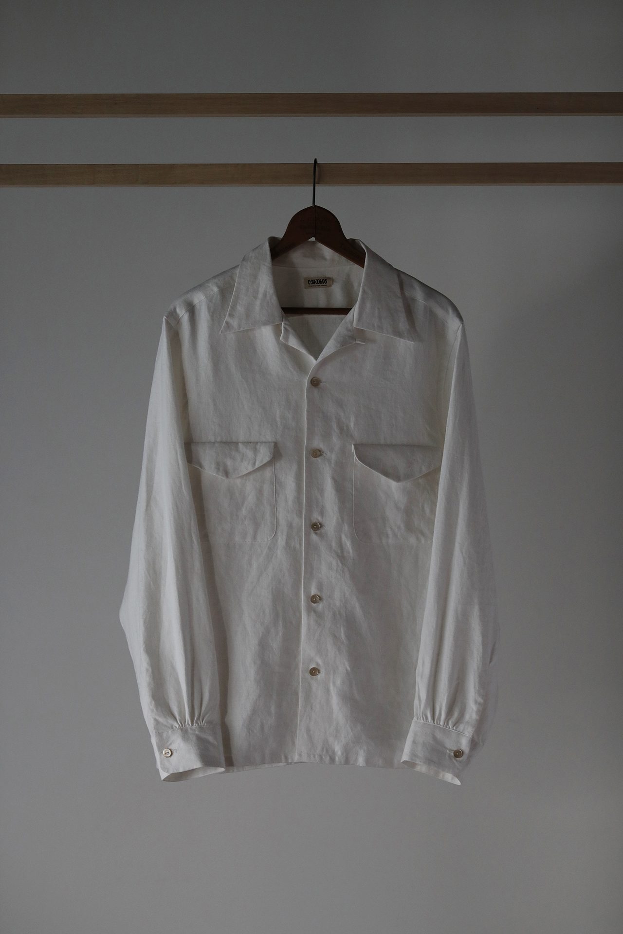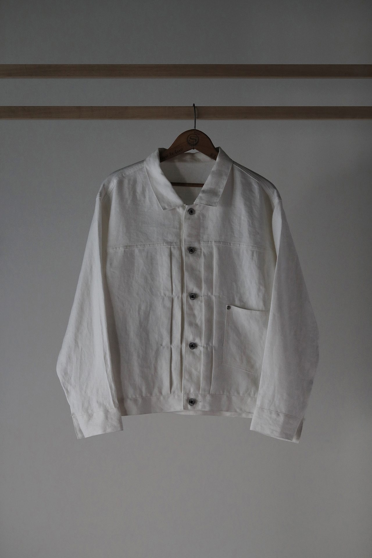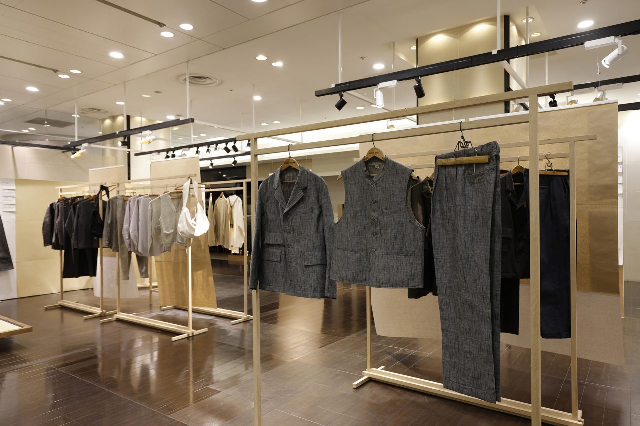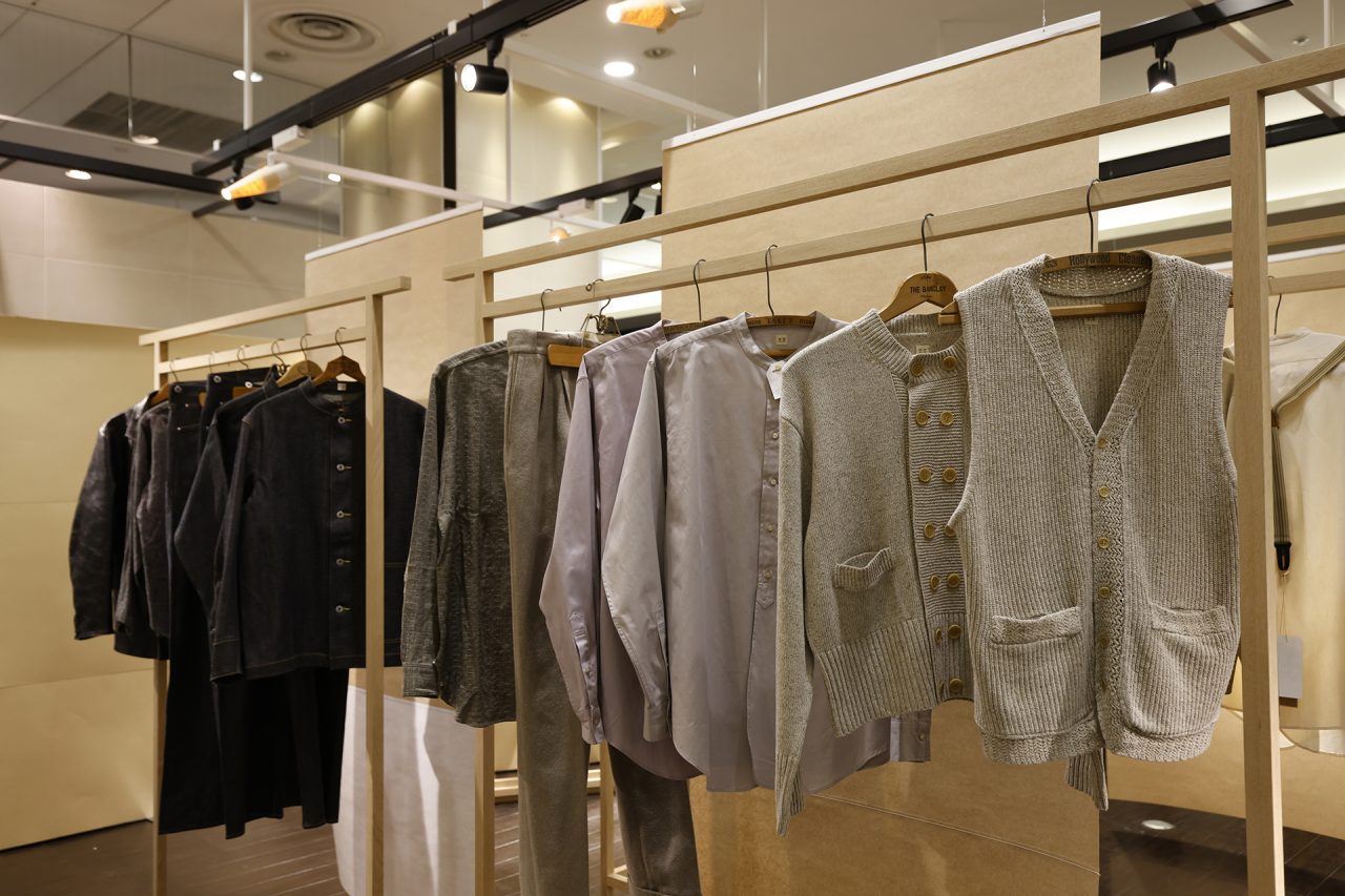 手作りの懸垂幕を背景に、Taiga Takahashi のシグネチャーアイテムであるカバーオールジャケット、デニムトラウザー、バンドカラードレスシャツと、その着想源となったヴィンテージピースを並べて展示。ヴィンテージから復元した Taiga Takahashi のオリジナル素材であるセルビッジ生地やオリジナルのベークライトボタン、丸胴カットソー、泥染め皮パッチなど、プロダクトの裏側にあるストーリーやデザイン、開発に込めた想いなども知ることができる。