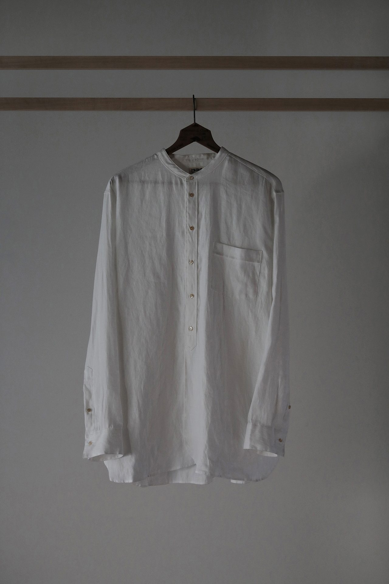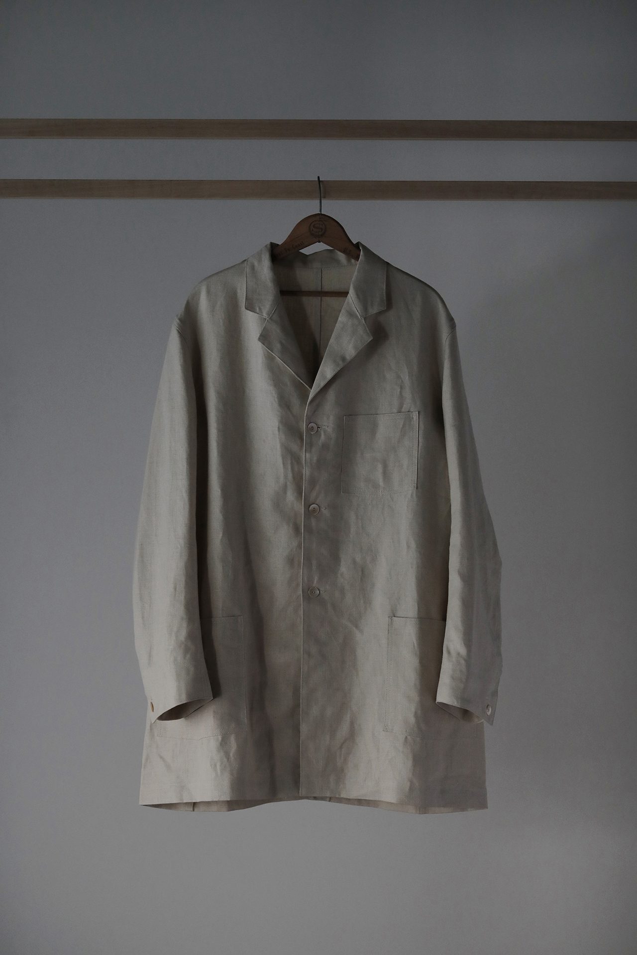 懸垂幕は、Taiga Takahashi のショッパーや封筒など、ブランドを象徴する1899年創業の竹尾ペーパーの「クラフトデュプレN(晒クラフトと未晒クラフトの抄き合わせ)」を使用し、糸と針で縫い合わせるなど全て手作業で仕上げられている。インスタレーションに使用するハンガーは全て、アメリカの家具デザイナーであるジョージ・ナカシマの椅子を手掛ける桜製作所が、髙橋大雅のデザインをベースに制作したオリジナルだ。