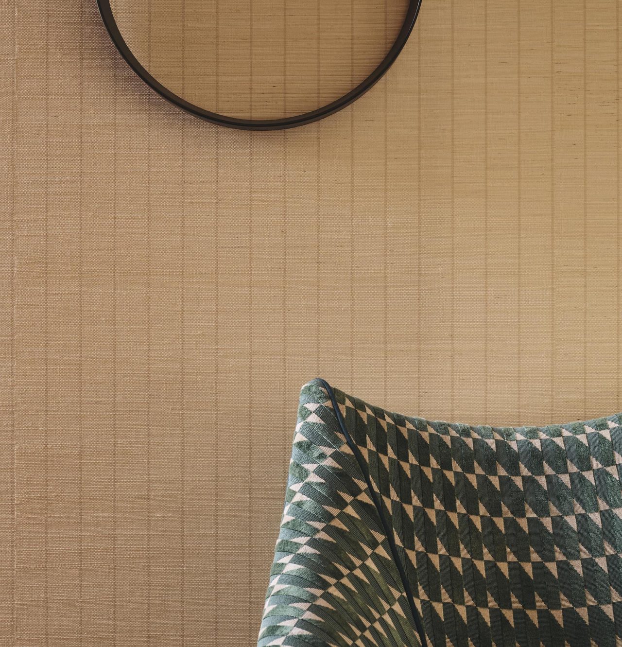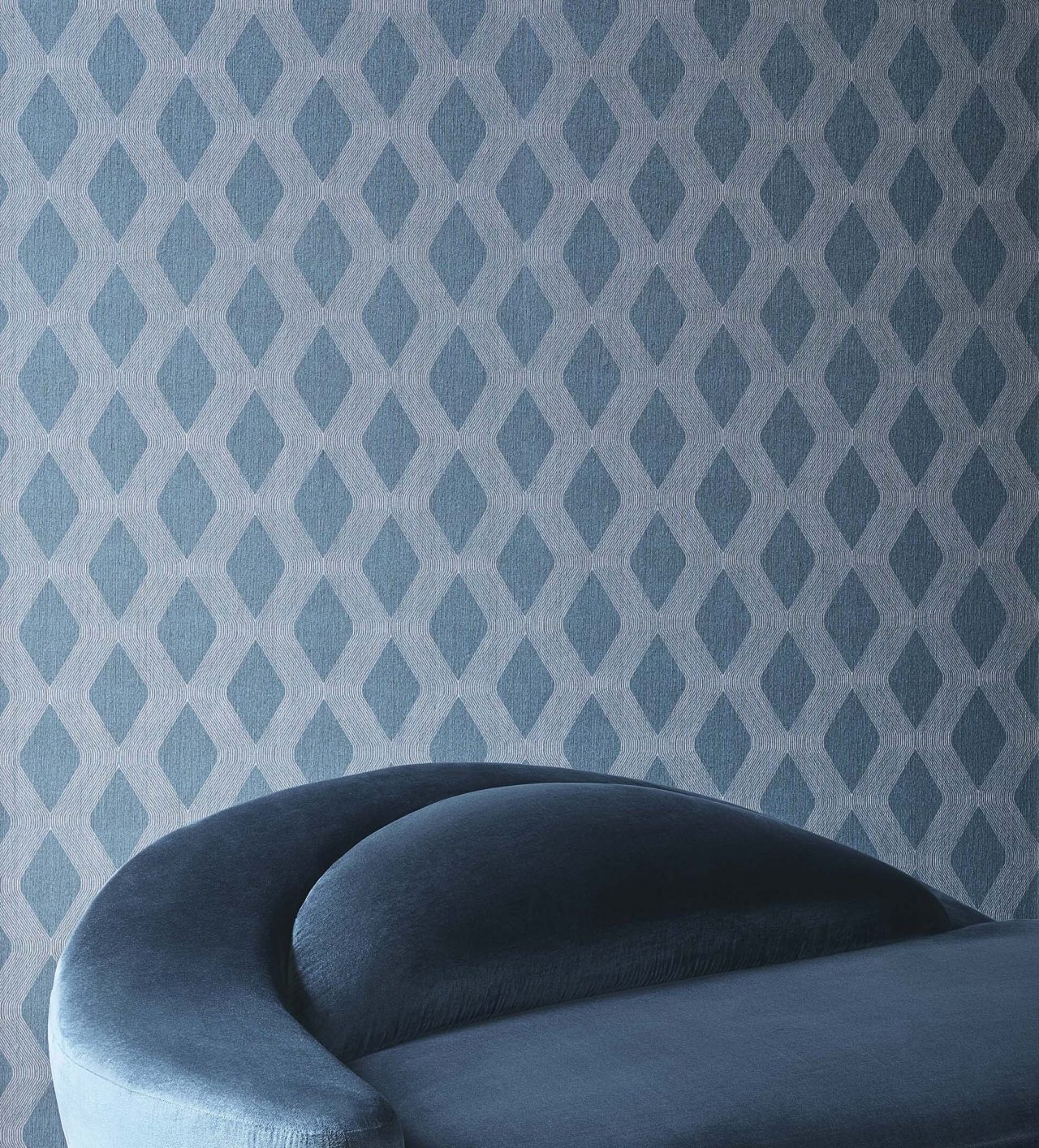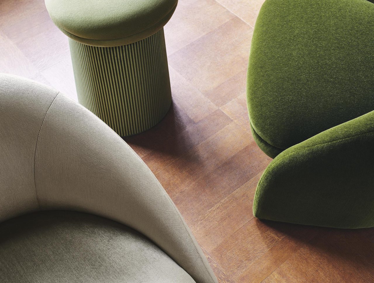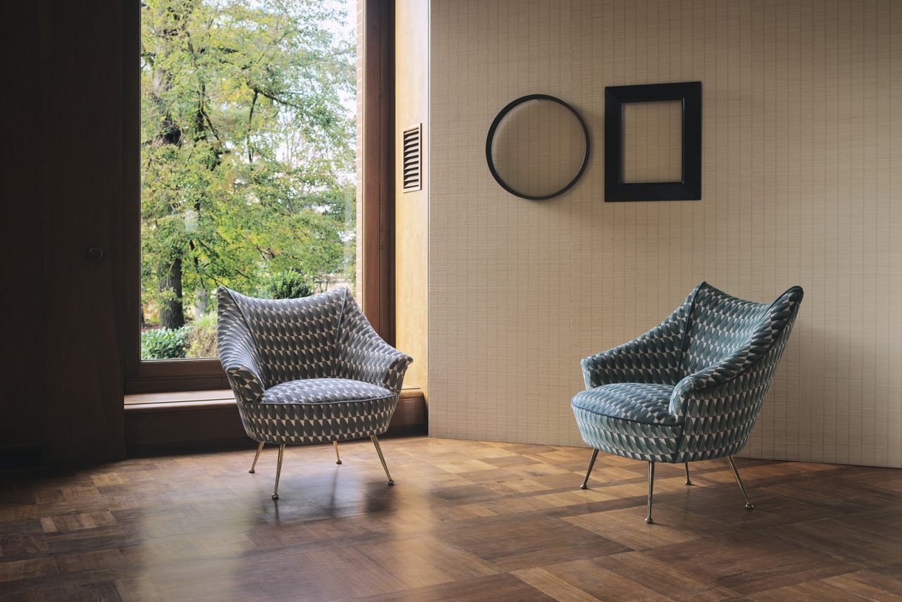 コレクションの主役となったのは、カシミヤの柔らかさと暖かさ、シルクの繊細な輝きをあわせもつ、独自の糸で作られたベルベット生地「グラン・サロン」。他にも、光沢のある鮮やかな色合いのシルクや無地、柄物のベルベットなど豊富な生地が揃っている。さらに注目したいのは、20世紀半ばのファッションをモチーフにした幾何学的デザイン。イグサを用いて形と色合いで遊び心ある幾何学模様を作り出した壁紙は、デザイン性だけでなく、消臭効果やメンテナンスのしやすさなどの機能性も兼ね備える。
