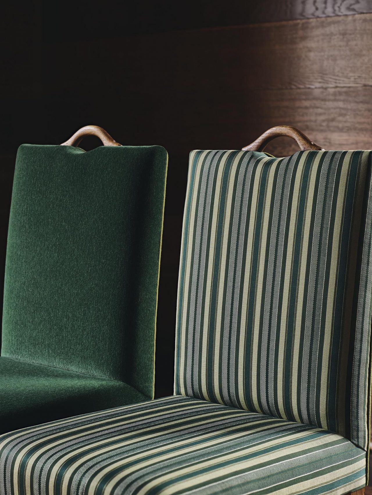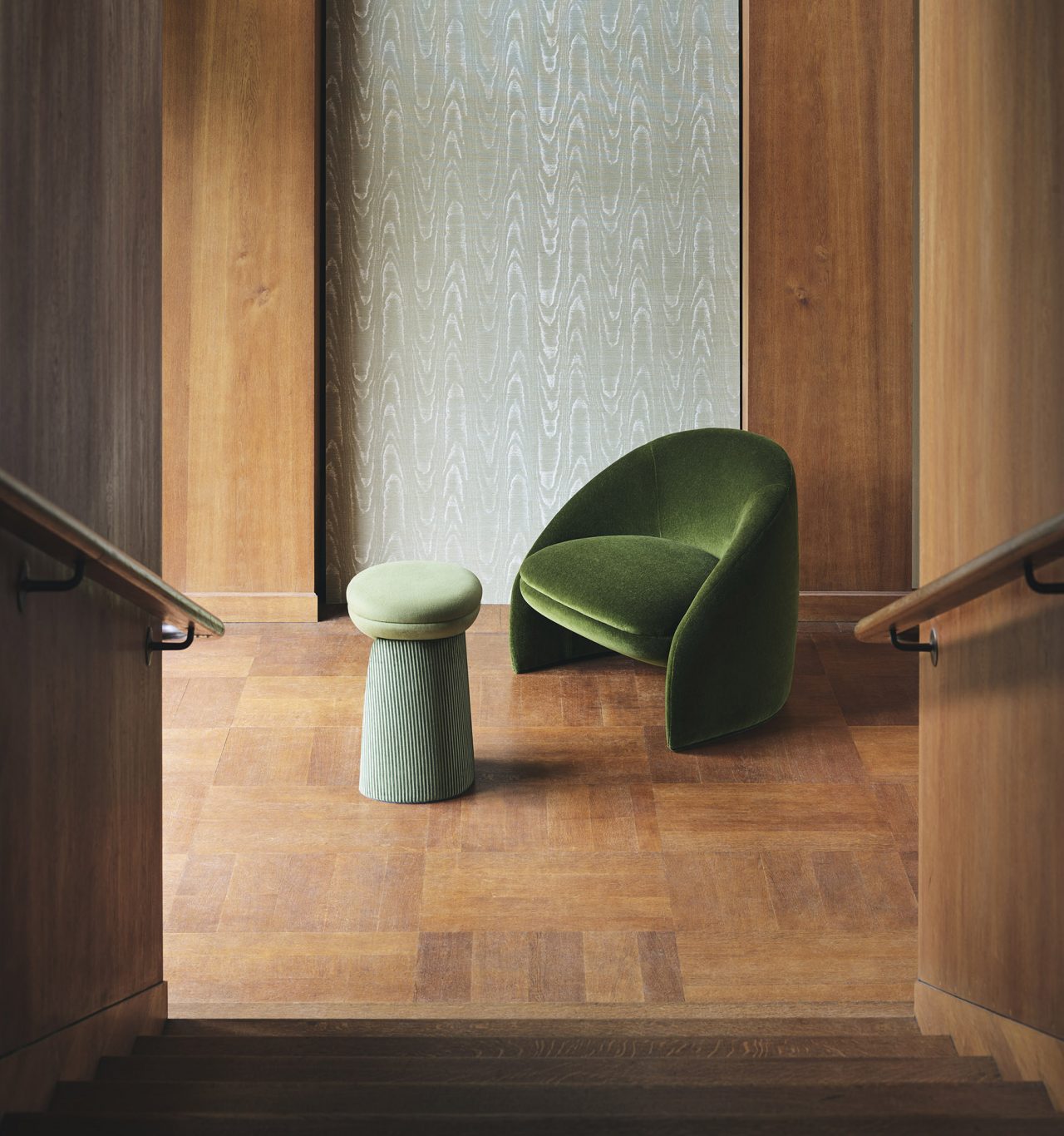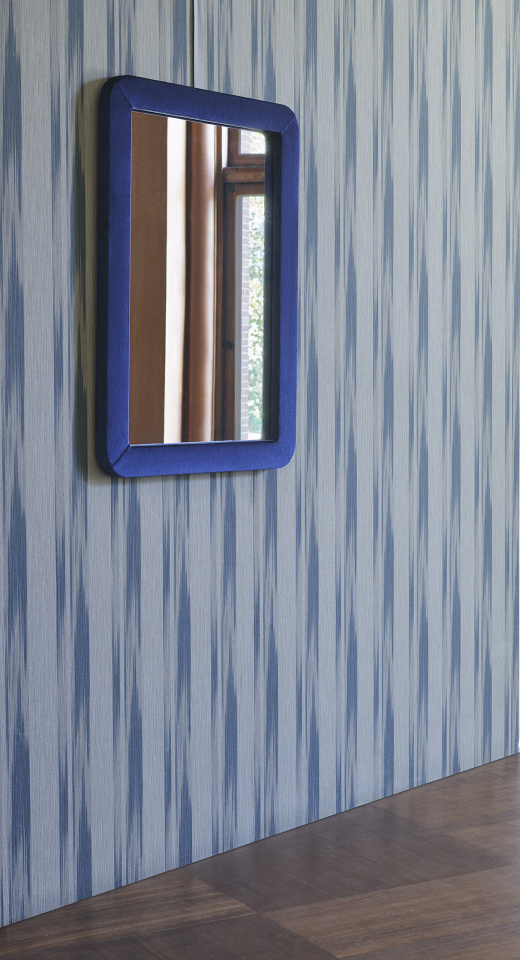 コレクションの主役となったのは、カシミヤの柔らかさと暖かさ、シルクの繊細な輝きをあわせもつ、独自の糸で作られたベルベット生地「グラン・サロン」。他にも、光沢のある鮮やかな色合いのシルクや無地、柄物のベルベットなど豊富な生地が揃っている。さらに注目したいのは、20世紀半ばのファッションをモチーフにした幾何学的デザイン。イグサを用いて形と色合いで遊び心ある幾何学模様を作り出した壁紙は、デザイン性だけでなく、消臭効果やメンテナンスのしやすさなどの機能性も兼ね備える。