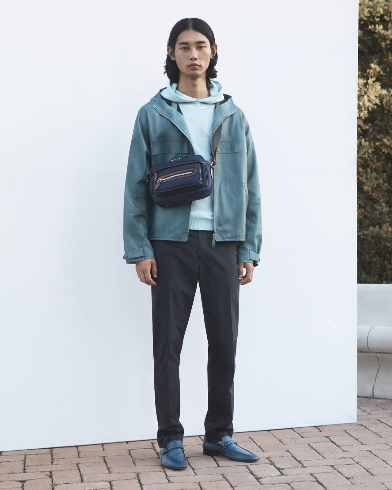 シューメーカーとしてメゾンの歴史を踏まえつつ、さりげなくウェアやシューズ、レザーグッズのアイコンに光を当てた本コレクション。エレガントかつコンテンポラリーなルックが揃った。BERLUTI の追及し続ける、優雅な素材とディテールへの最大限のこだわりは変わらず、確かなシルエットと機能性をあわせもったアイテムが並ぶ。
