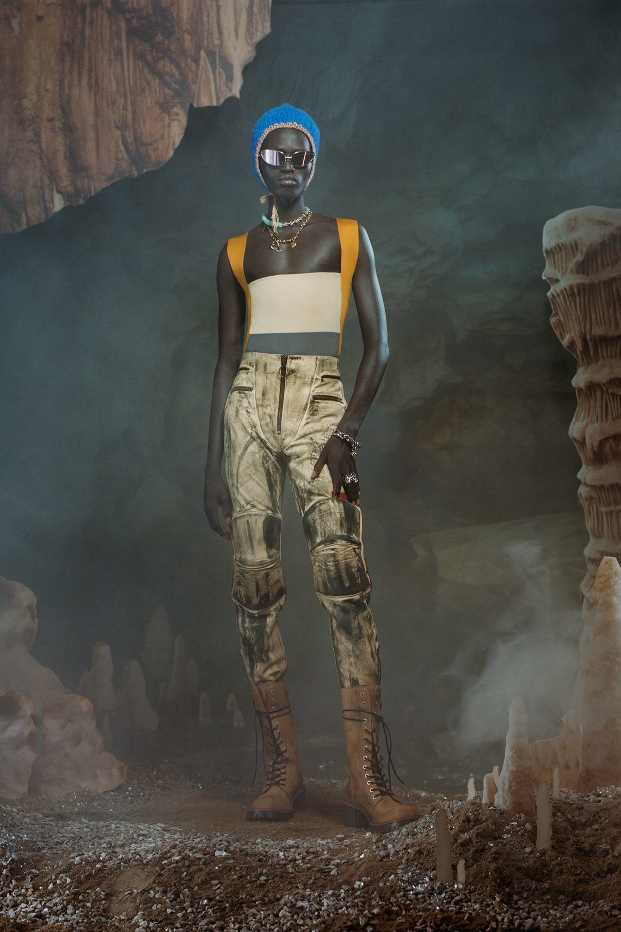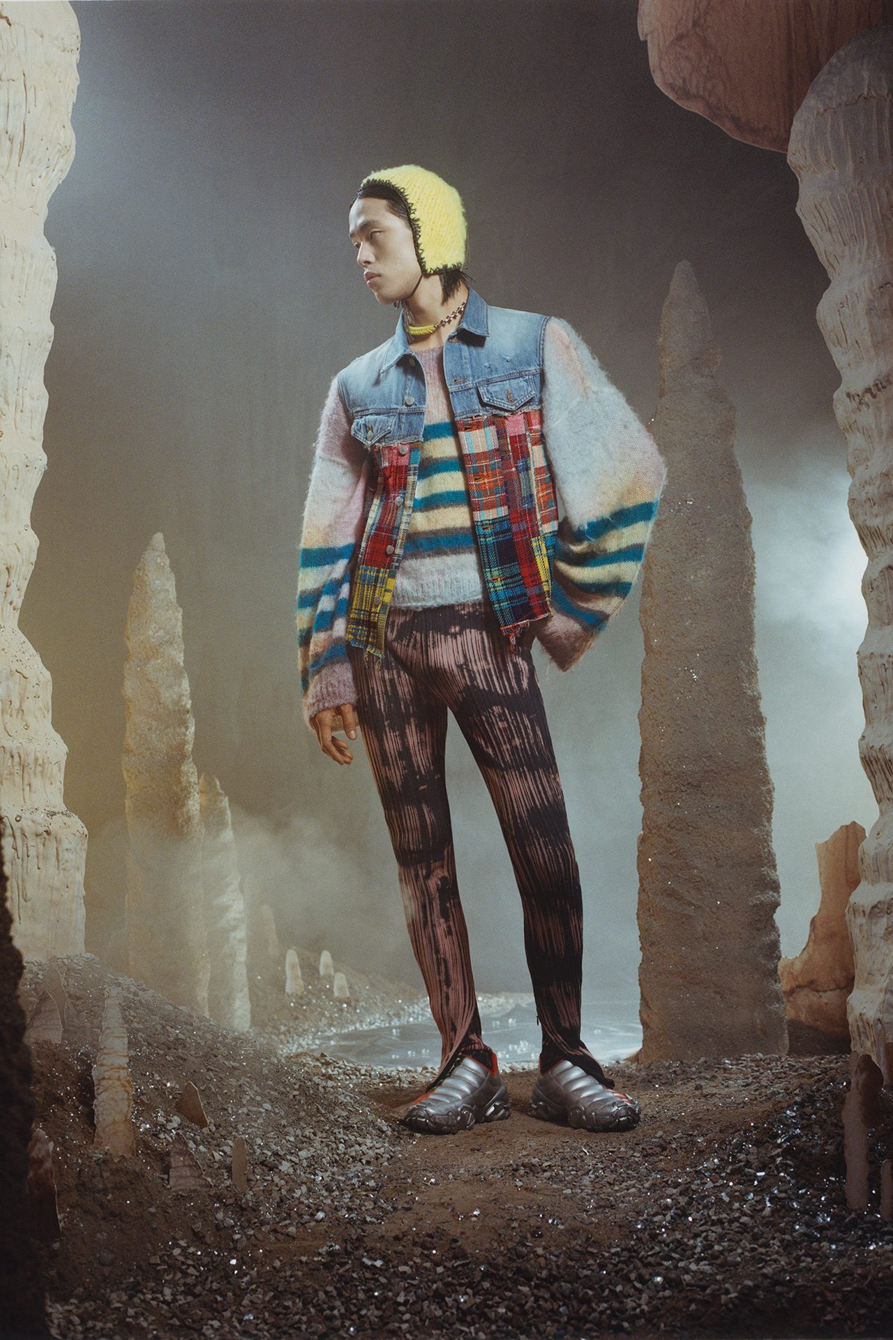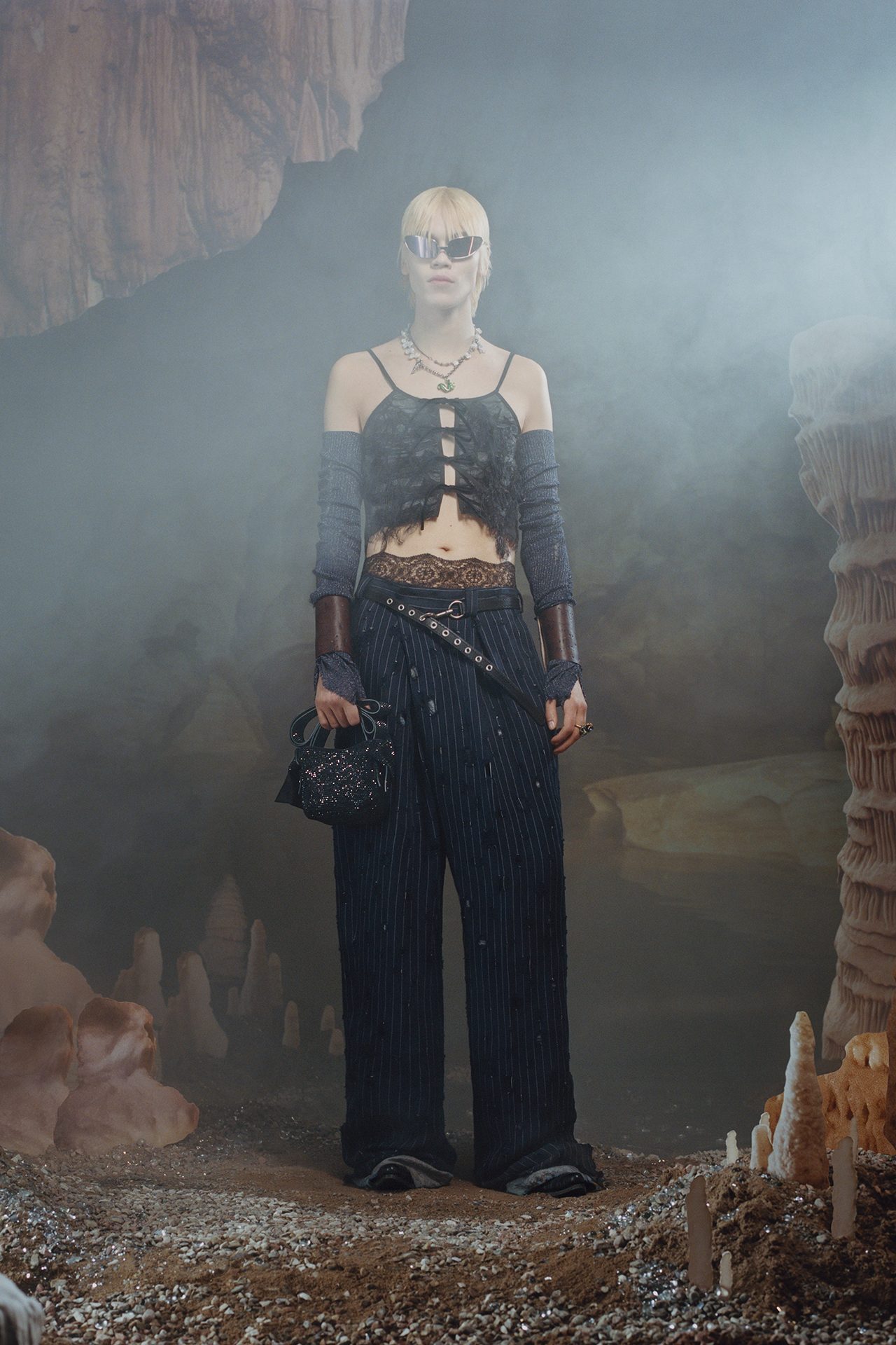 今回登場したルックには、ネオンで彩られたアースカラーのブラウンやくすんだグリーン、ダスティピンクなど原始人を思わせるカラーが使われており、チェックやタータン、ストライプ、タイダイ、天然石や鉱物のモチーフがプリントされている。シルエットは、スキンタイトとスーパーサイズの組み合わせで、ノンシャランな着こなしに新しい風を吹き込んだ。セカンドスキンのクロップド T シャツやニットにワンサイズ上のデニムジーンズ、スリムなレザーバイカーパンツと肉厚なストレッチ素材のトップスの組み合わせ、ボクシーなタキシードジャケットとフィットしたパンツのコントラストが、夜のレディな雰囲気を演出する。