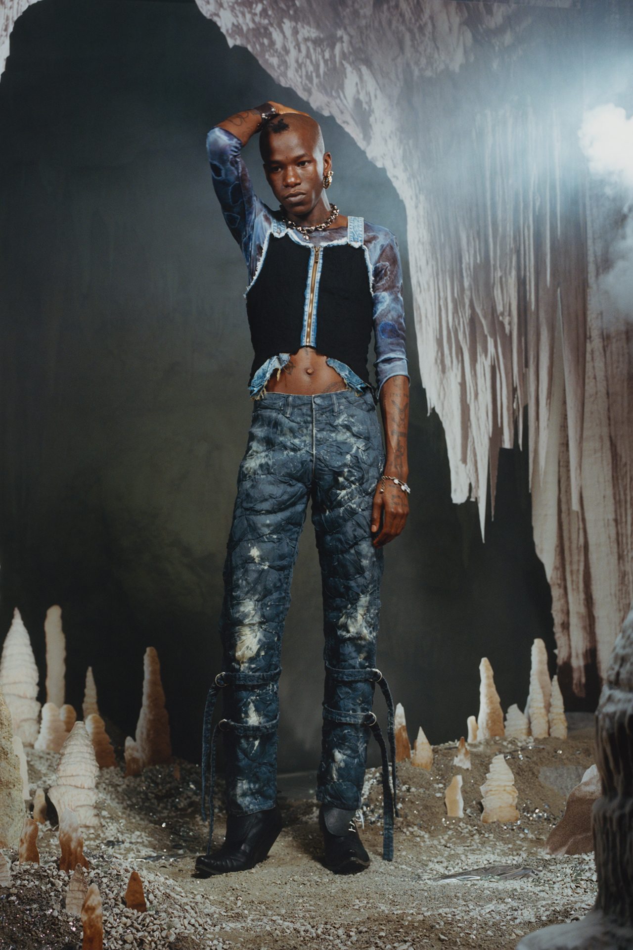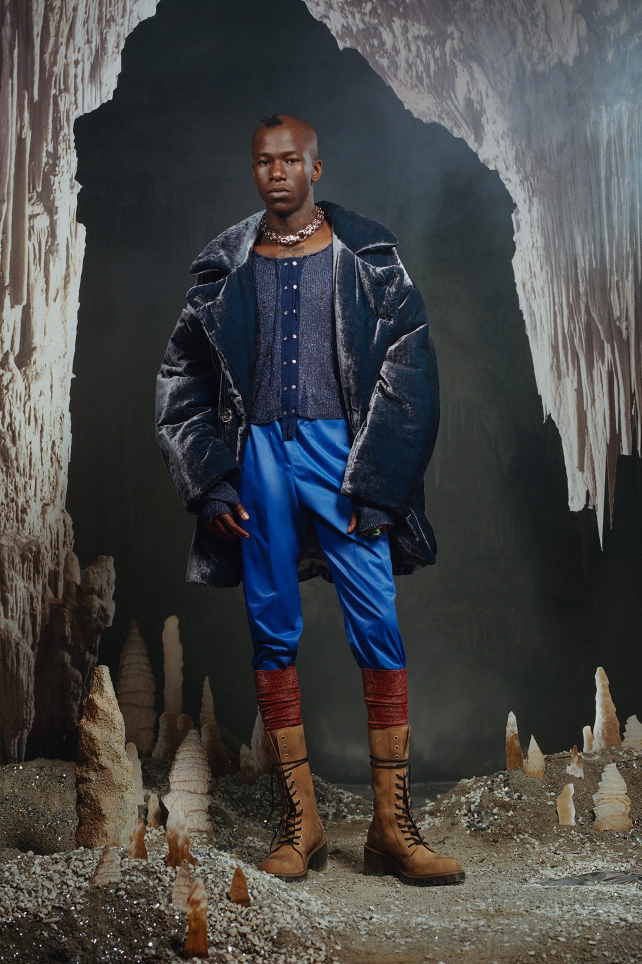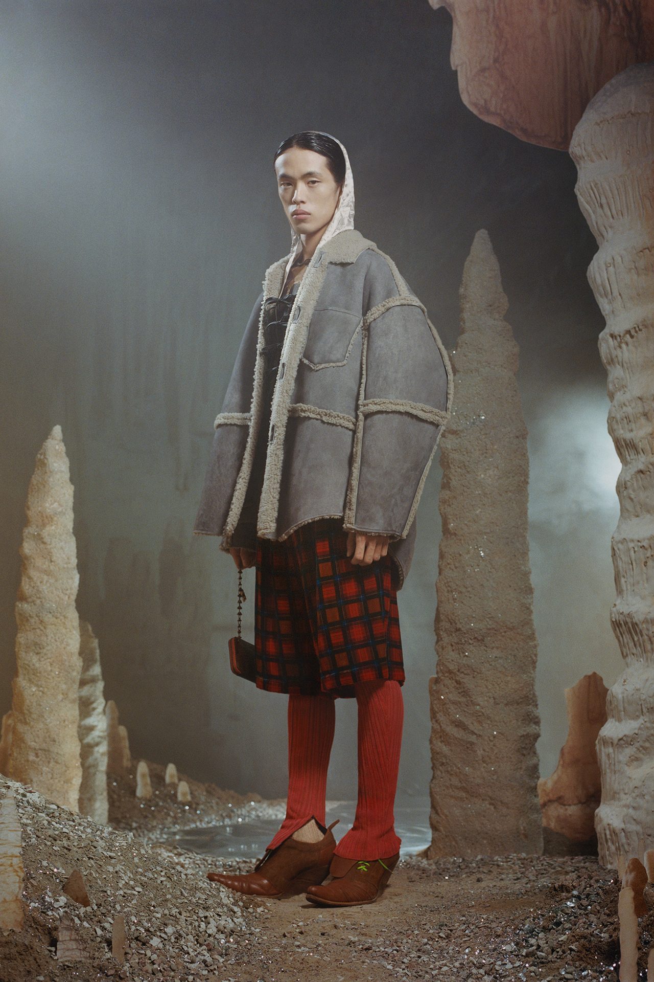 今回登場したルックには、ネオンで彩られたアースカラーのブラウンやくすんだグリーン、ダスティピンクなど原始人を思わせるカラーが使われており、チェックやタータン、ストライプ、タイダイ、天然石や鉱物のモチーフがプリントされている。シルエットは、スキンタイトとスーパーサイズの組み合わせで、ノンシャランな着こなしに新しい風を吹き込んだ。セカンドスキンのクロップド T シャツやニットにワンサイズ上のデニムジーンズ、スリムなレザーバイカーパンツと肉厚なストレッチ素材のトップスの組み合わせ、ボクシーなタキシードジャケットとフィットしたパンツのコントラストが、夜のレディな雰囲気を演出する。