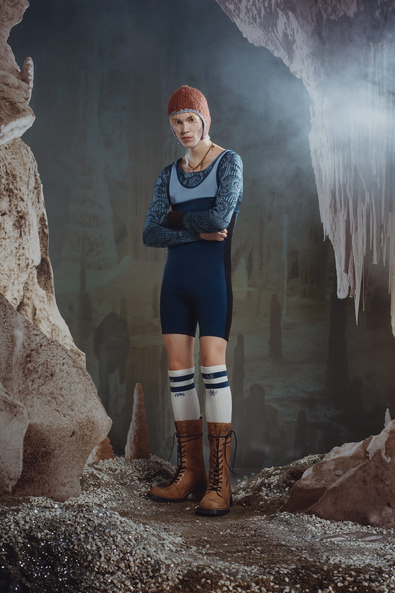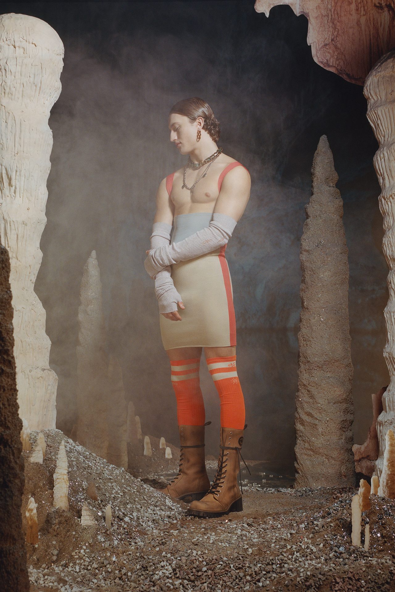レースの下着を覗かせたローウェストのバギーパンツやシルクのシャツを組み合わせたオーバーサイズのジャケット、ボリュームのあるアウターと体型にフィットするレイヤリングなど、コントラストの効いたファブリックの組み合わせは既成概念に捕らわれない大胆さを表現。また、色褪せたスポーツウェアにサテンのシャツとリブ編みのショーツ、ストライプのフィールドソックスにチューブドレスを合わせたりと、サッカー選手のステレオタイプを覆すルックも登場した。