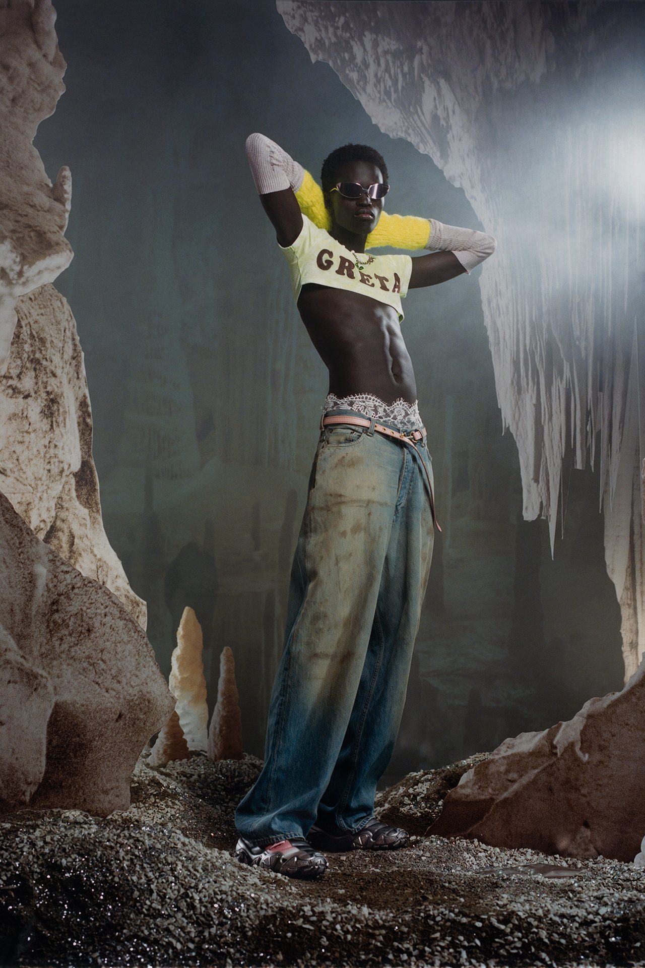 スウェーデン系アメリカ人のアイコンである女優 Greta Garbo (グレタ・ガルボ) にちなんだ「GRETA」のスローガンが入ったクロップド T シャツはシンプルながらも Acne Studios らしいプレイフルなアイテムだ。また、洞窟画のような Acne Studios の落書き風ロゴは、ブランドロゴのレザーパッチとSS23で初めて登場したグラフィックラベル「Acne Studios Floragatan 13 (アクネ ストゥディオズ フロラガタン 13)」と共にコレクション全体にあしらわれた。