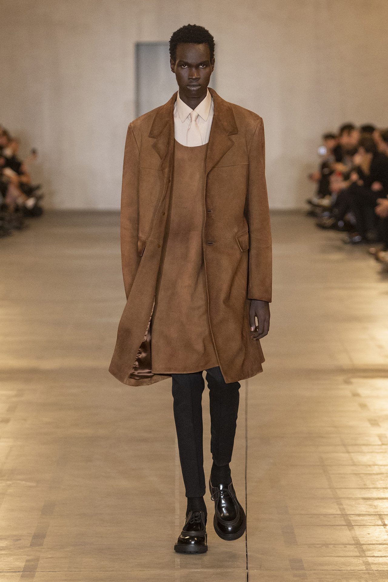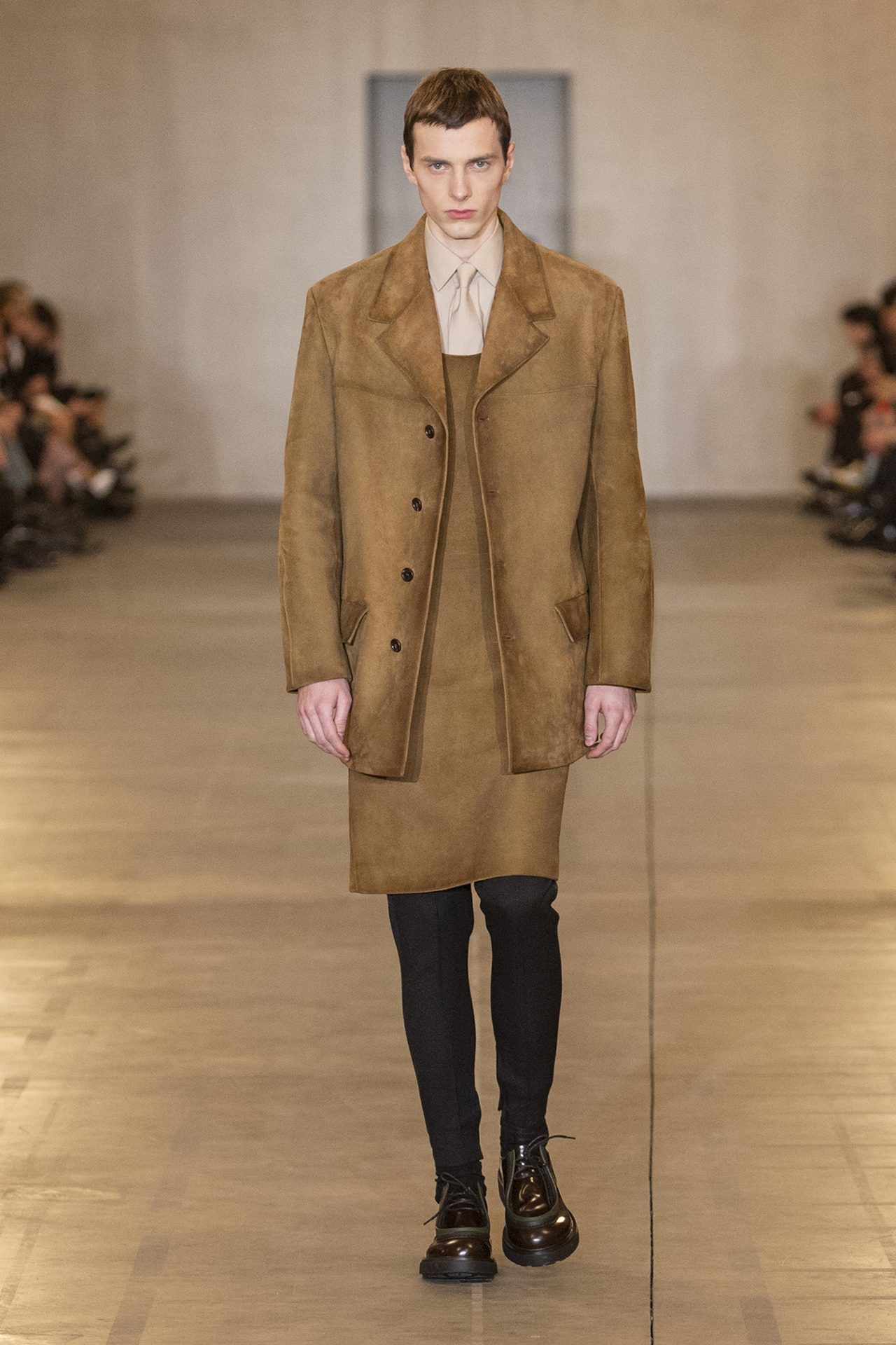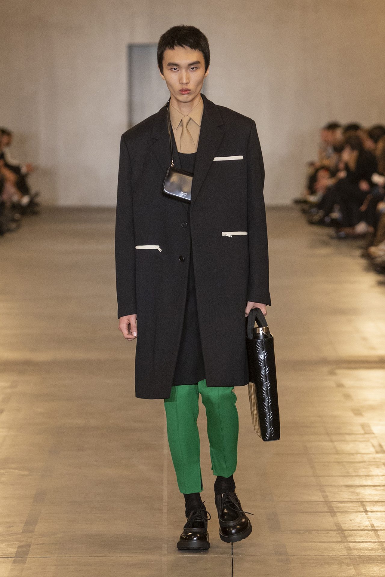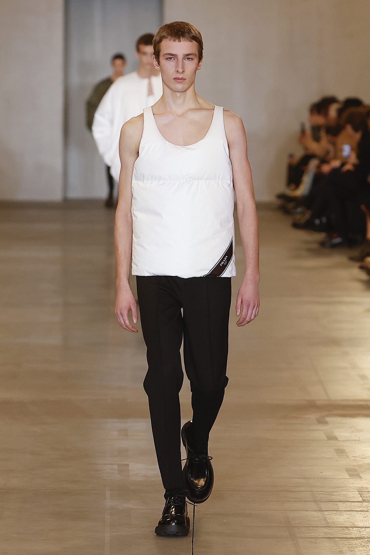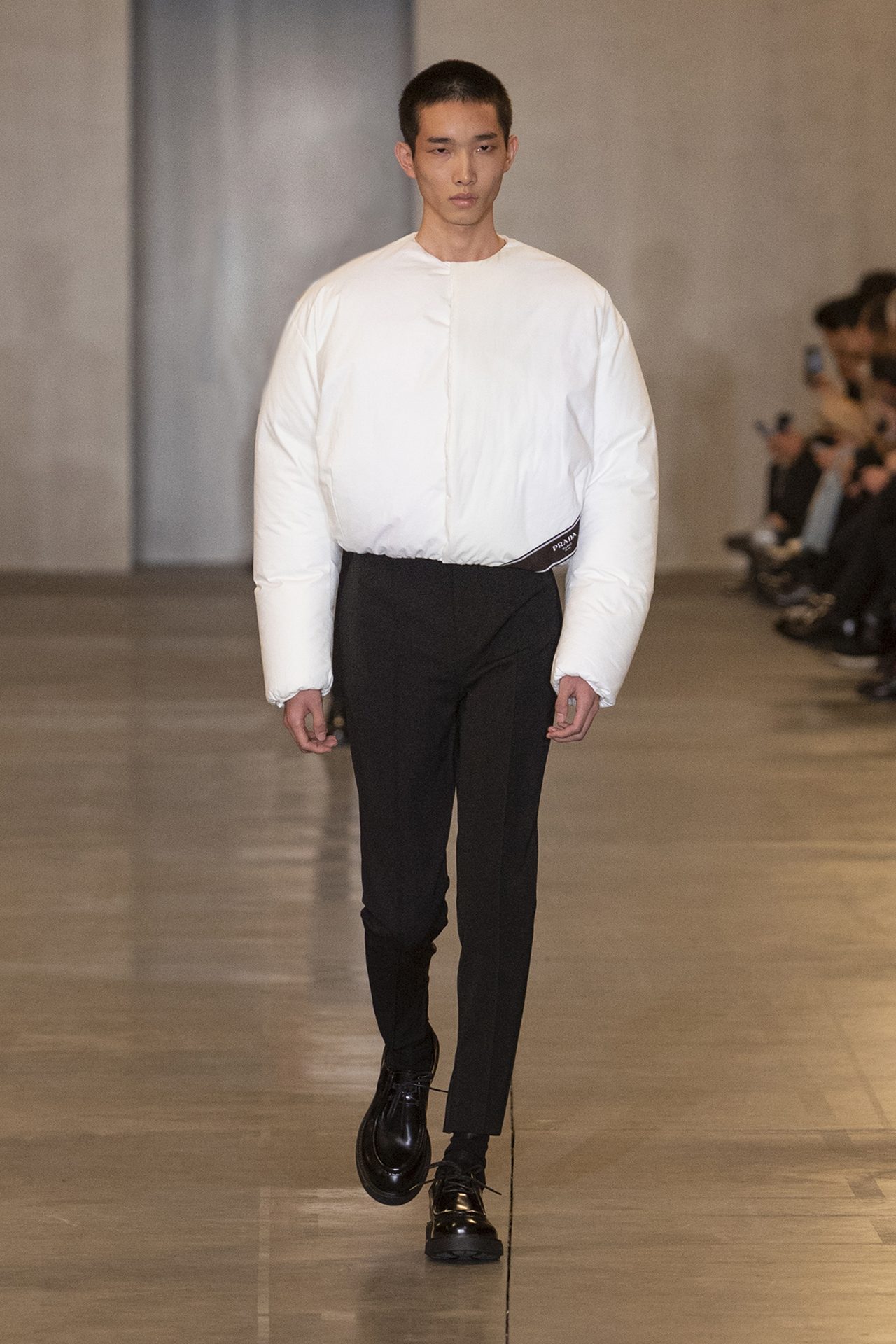 会場は、建築家の Rem Koolhaas (レム・コールハース) 率いる AMO が手掛けたプラダ財団の Deposito ショースペース。ショーでは、天井がゆっくりと上昇し、親密な空間が壮大な空間へと変化した。スケールが変わることでウェアに対しての視点も変化させるこの演出は、長く伸びていたり、短く切り詰められたウェアそのものと呼応する。