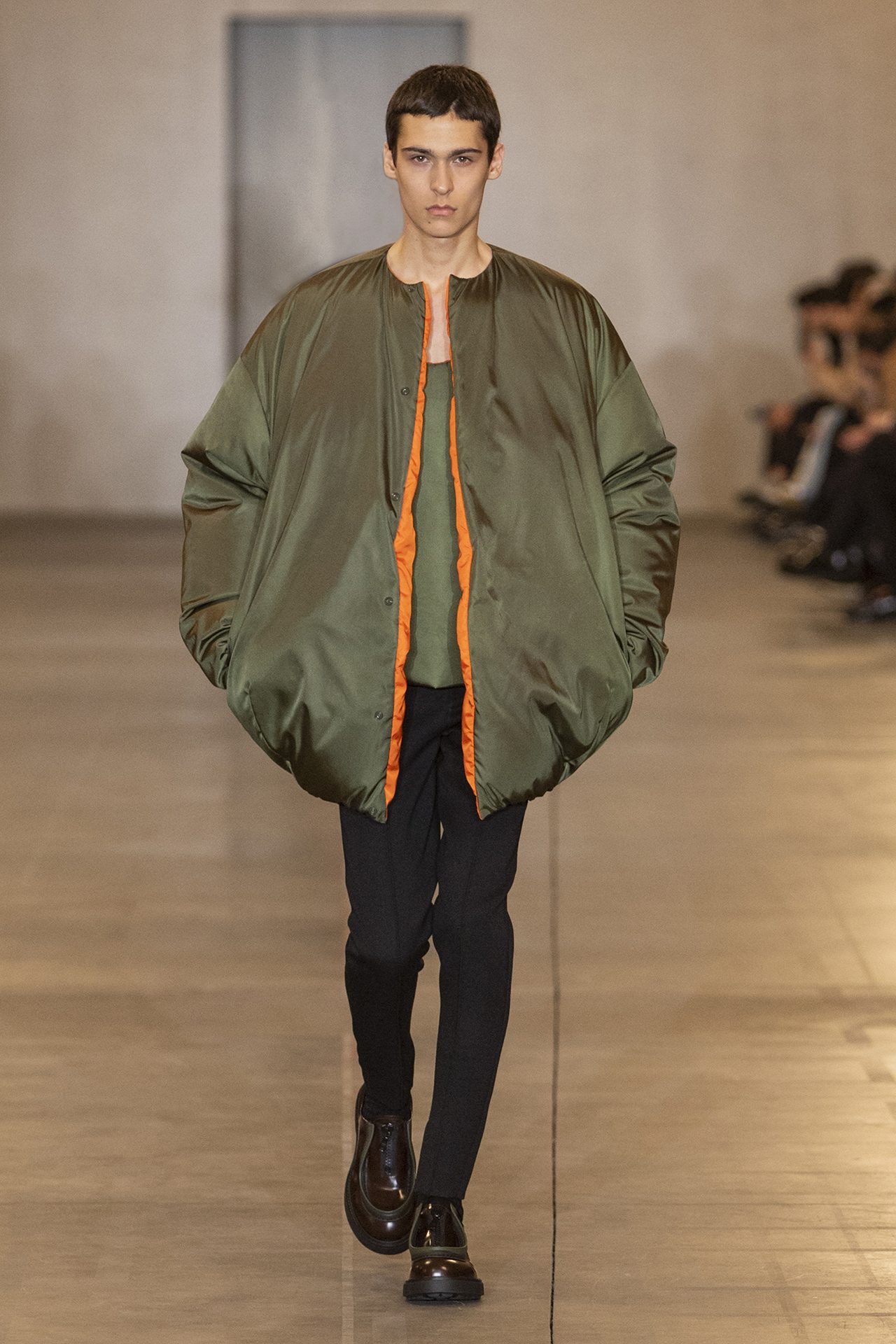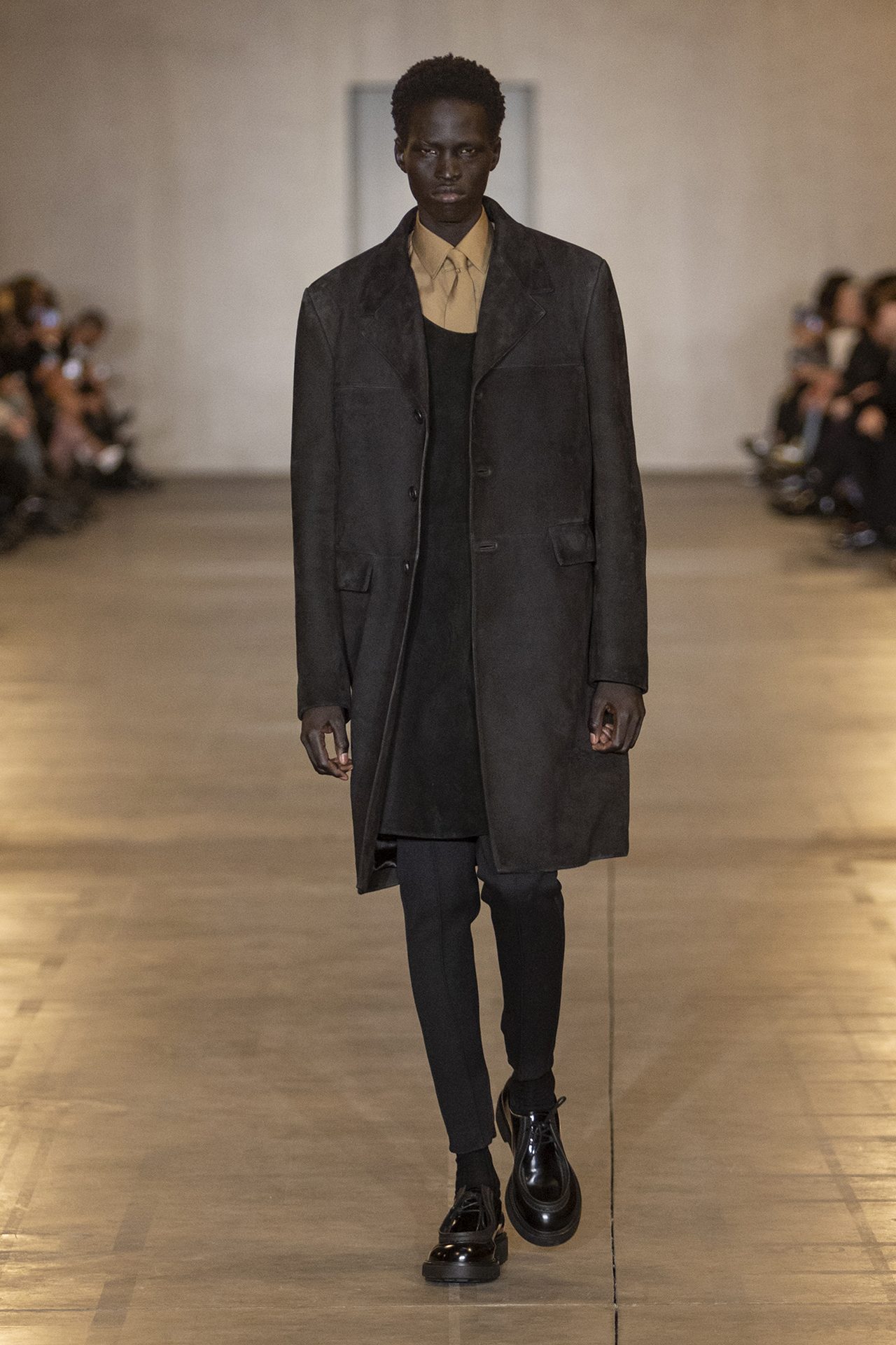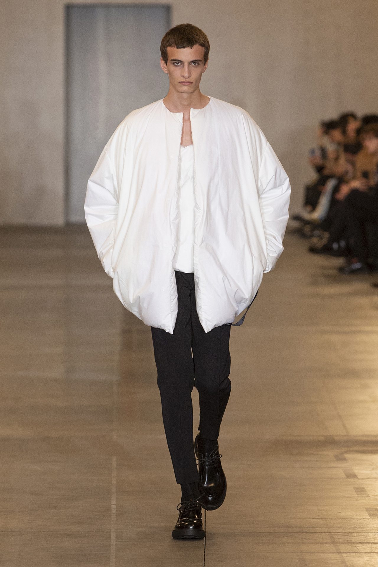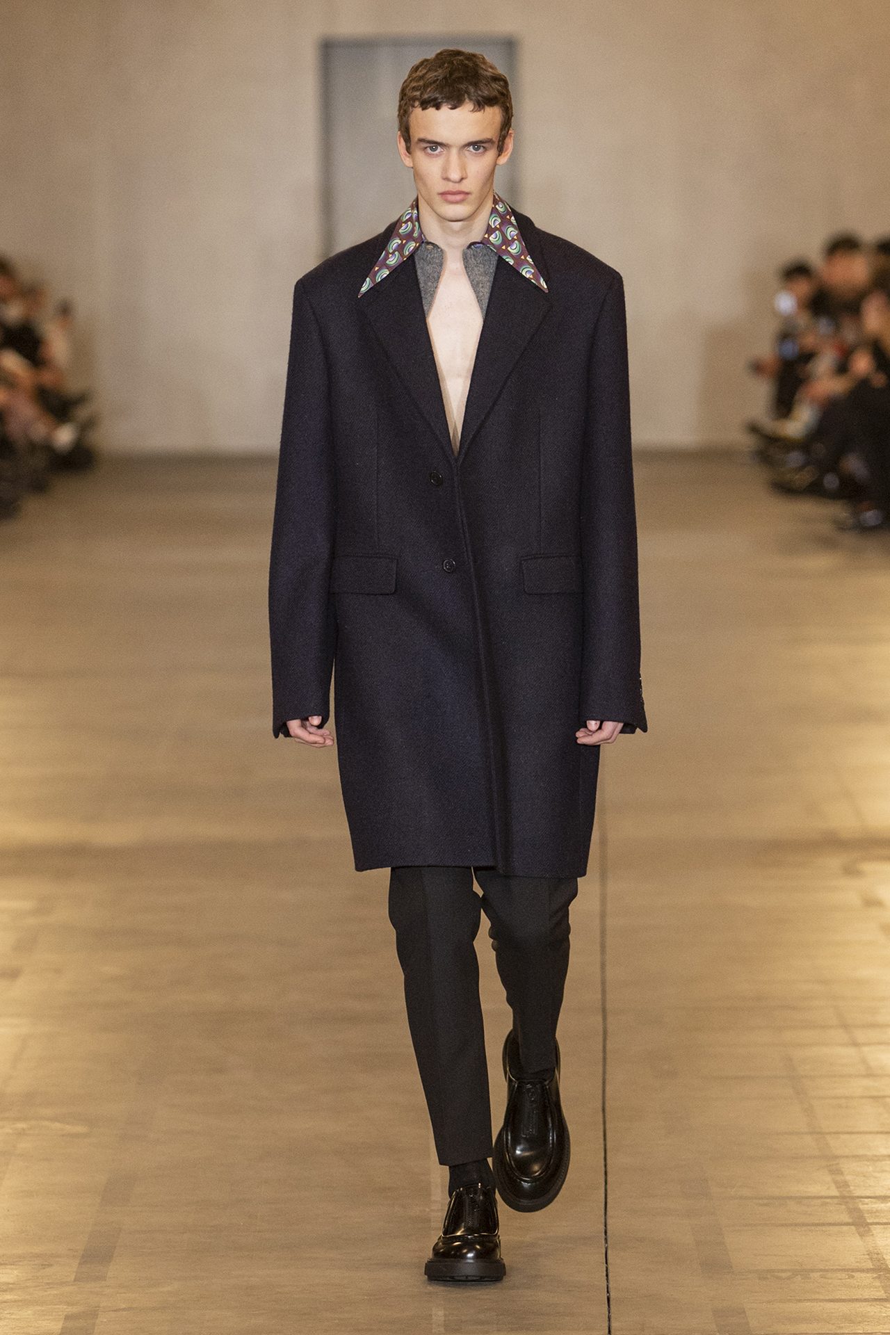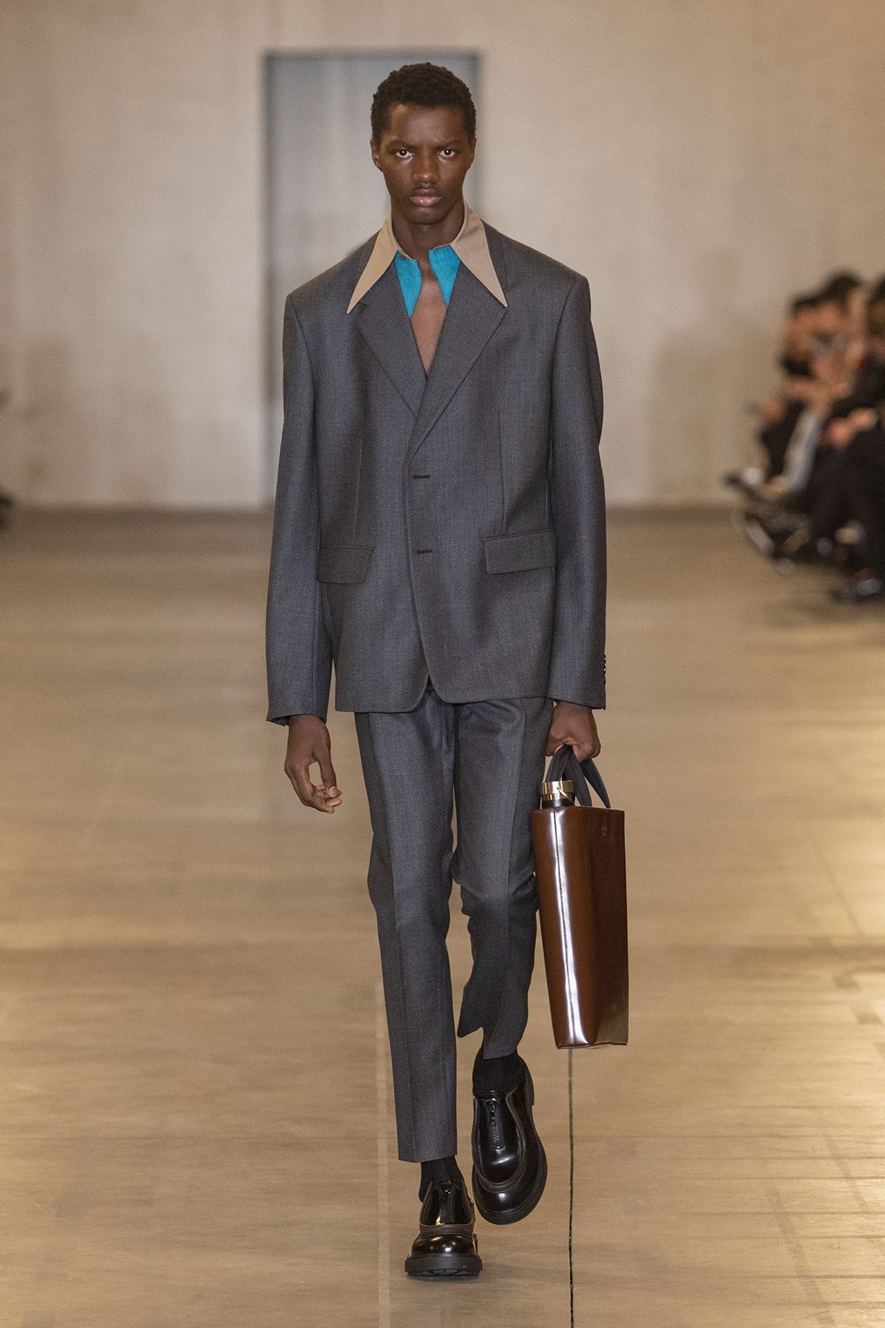 会場は、建築家の Rem Koolhaas (レム・コールハース) 率いる AMO が手掛けたプラダ財団の Deposito ショースペース。ショーでは、天井がゆっくりと上昇し、親密な空間が壮大な空間へと変化した。スケールが変わることでウェアに対しての視点も変化させるこの演出は、長く伸びていたり、短く切り詰められたウェアそのものと呼応する。