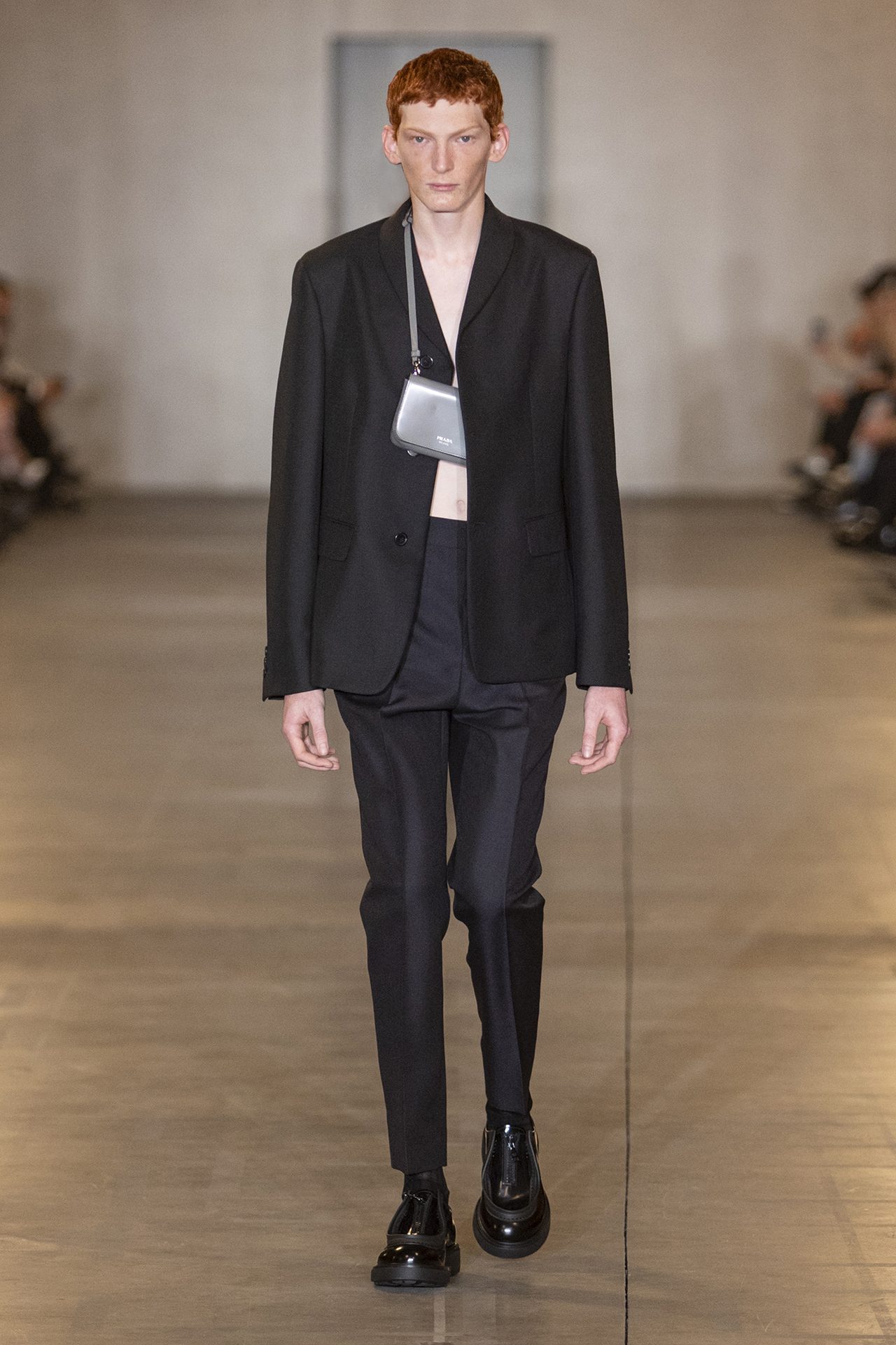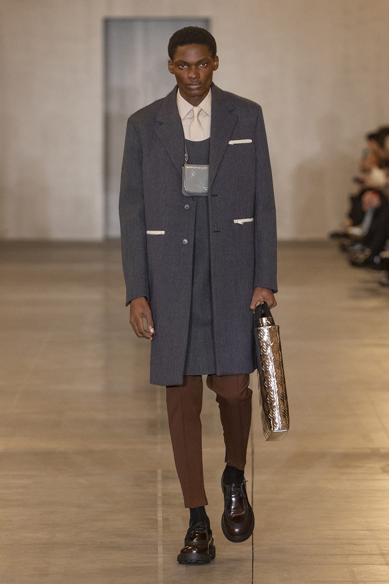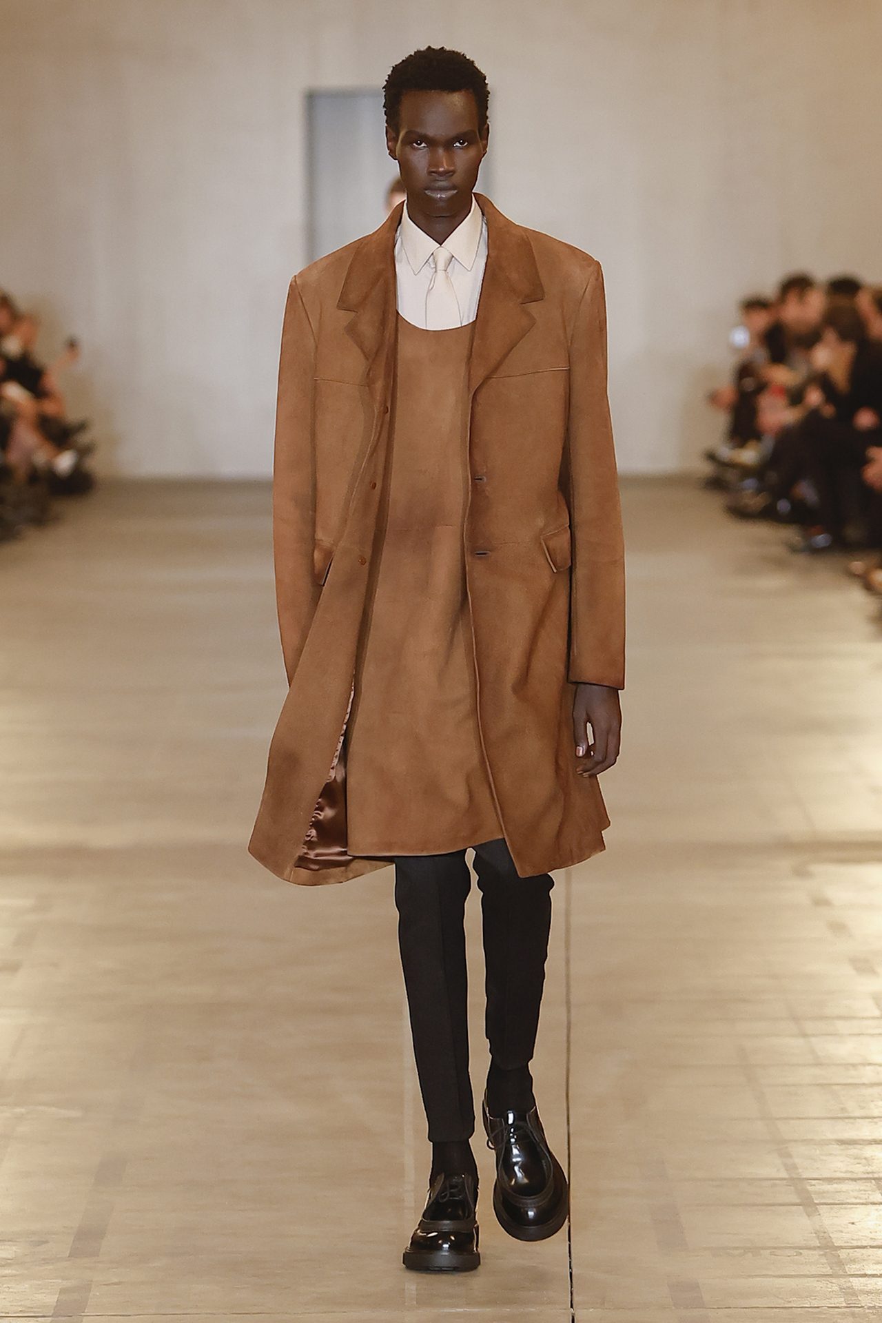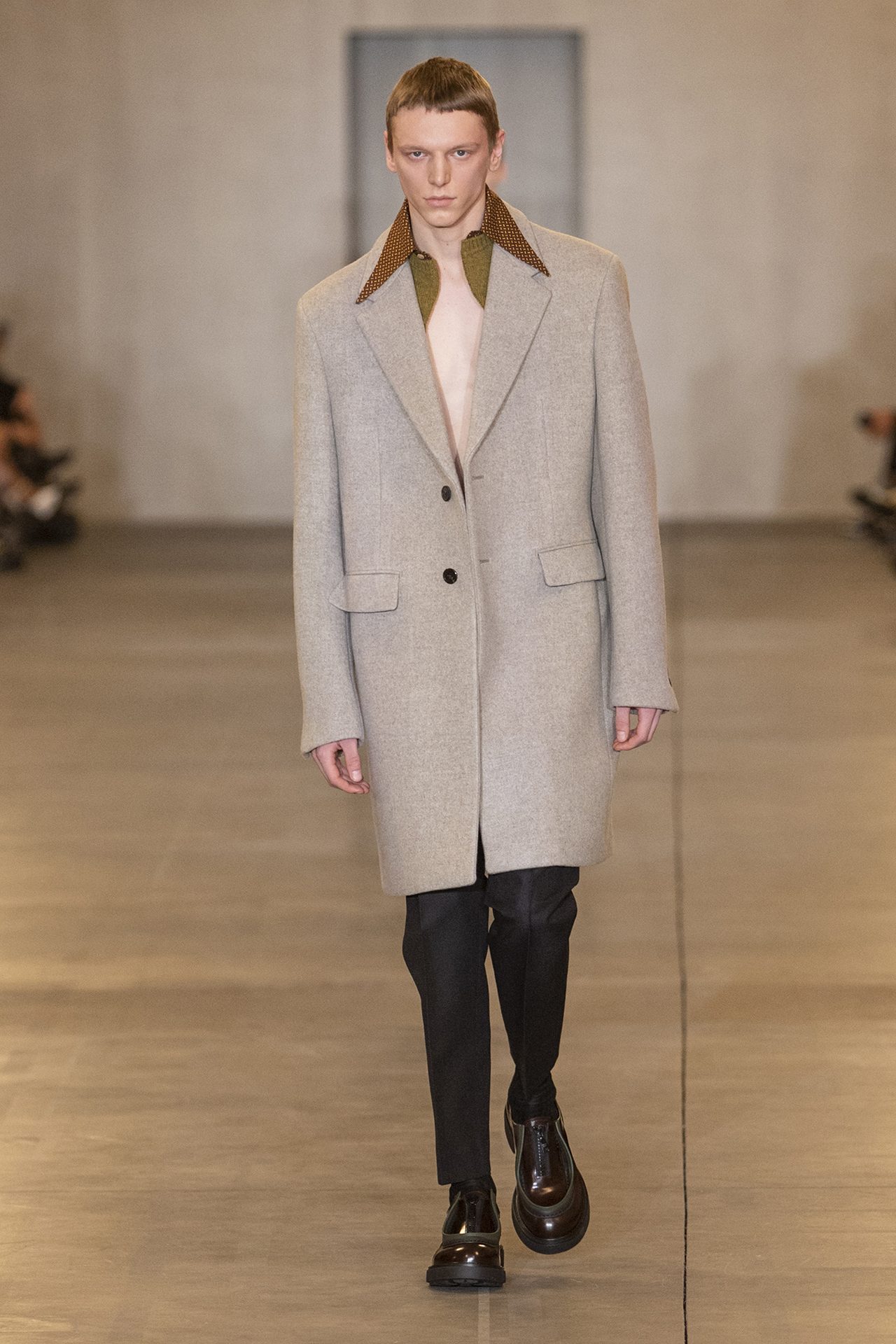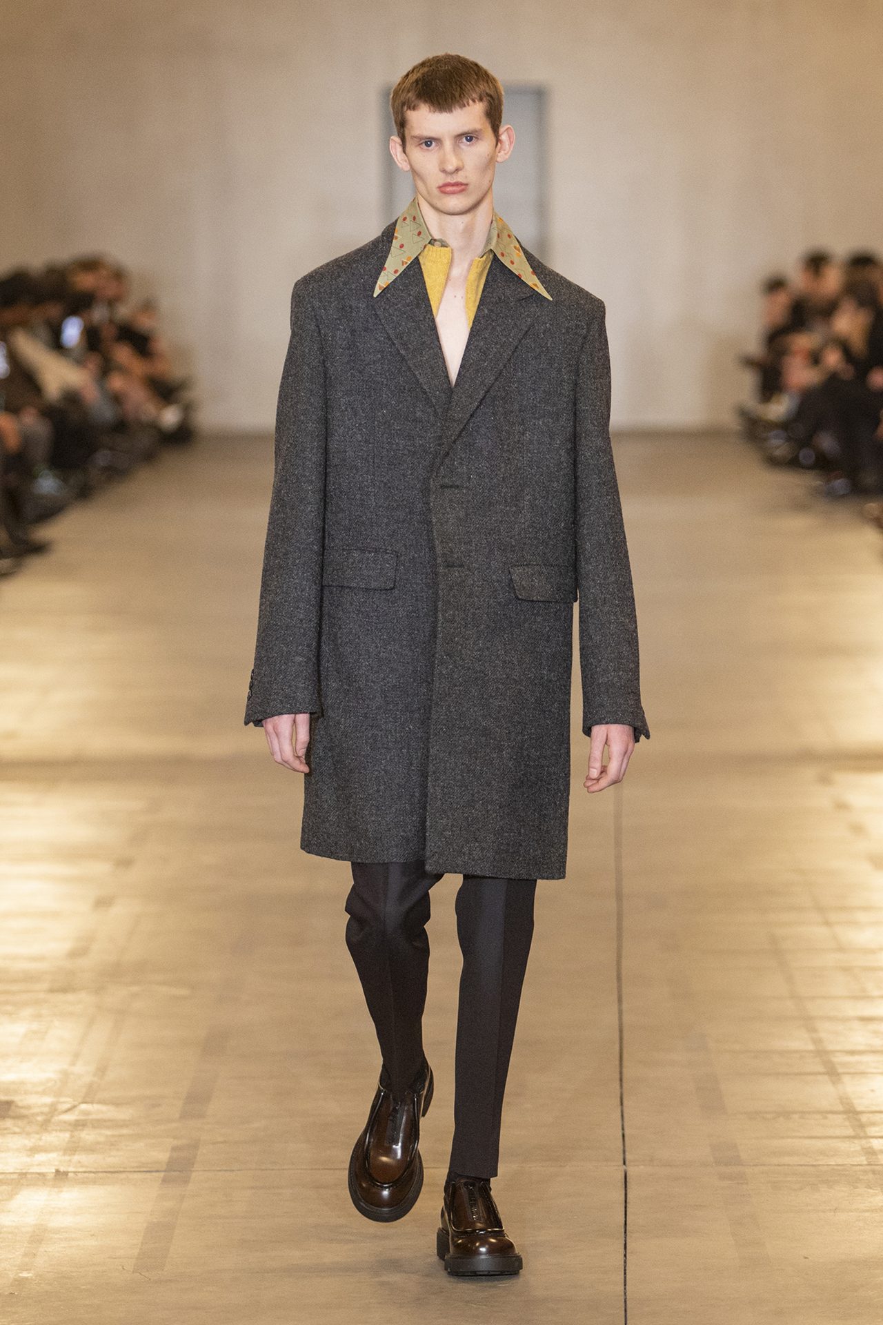 会場は、建築家の Rem Koolhaas (レム・コールハース) 率いる AMO が手掛けたプラダ財団の Deposito ショースペース。ショーでは、天井がゆっくりと上昇し、親密な空間が壮大な空間へと変化した。スケールが変わることでウェアに対しての視点も変化させるこの演出は、長く伸びていたり、短く切り詰められたウェアそのものと呼応する。