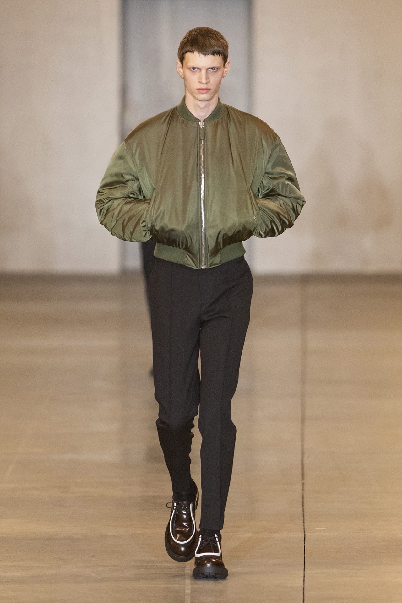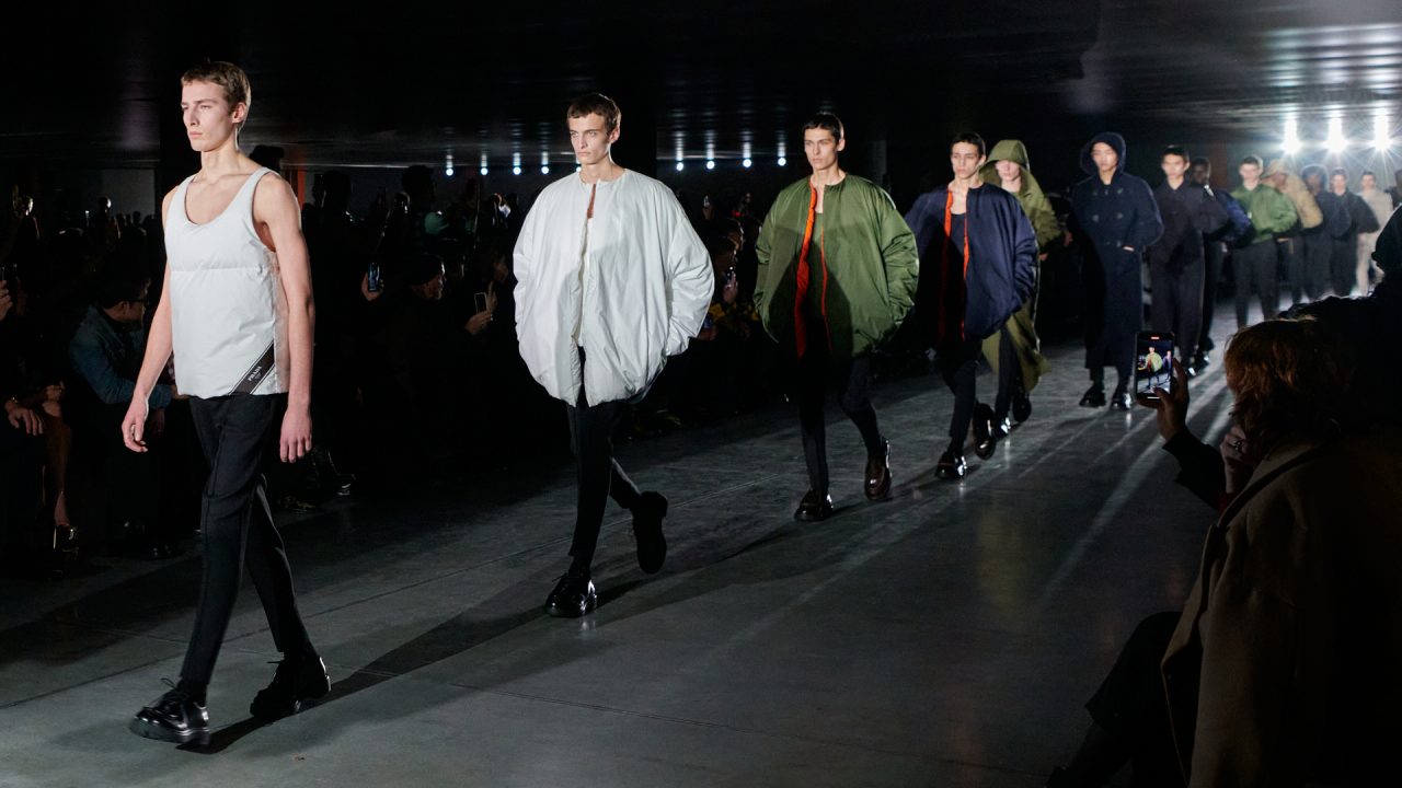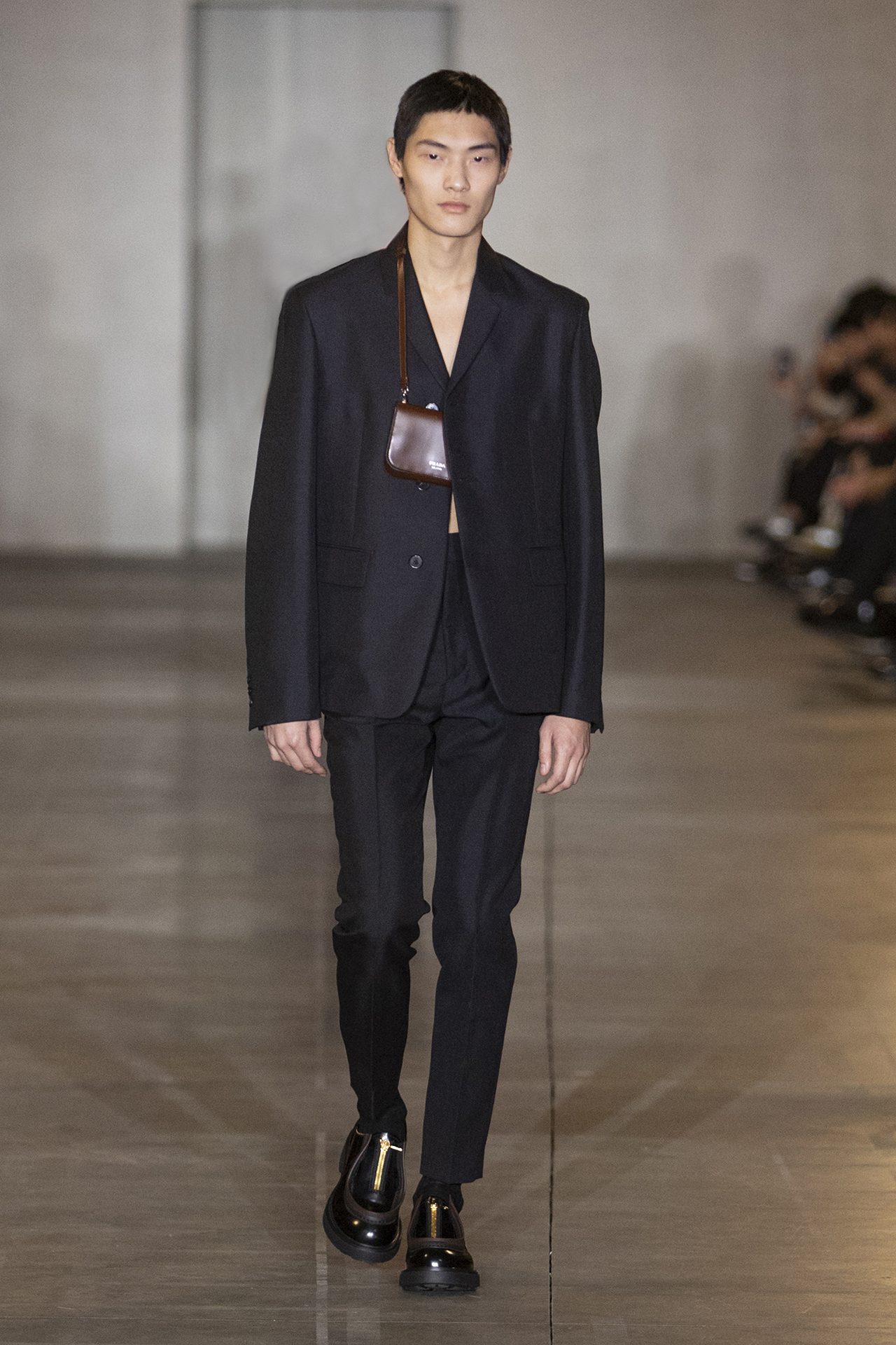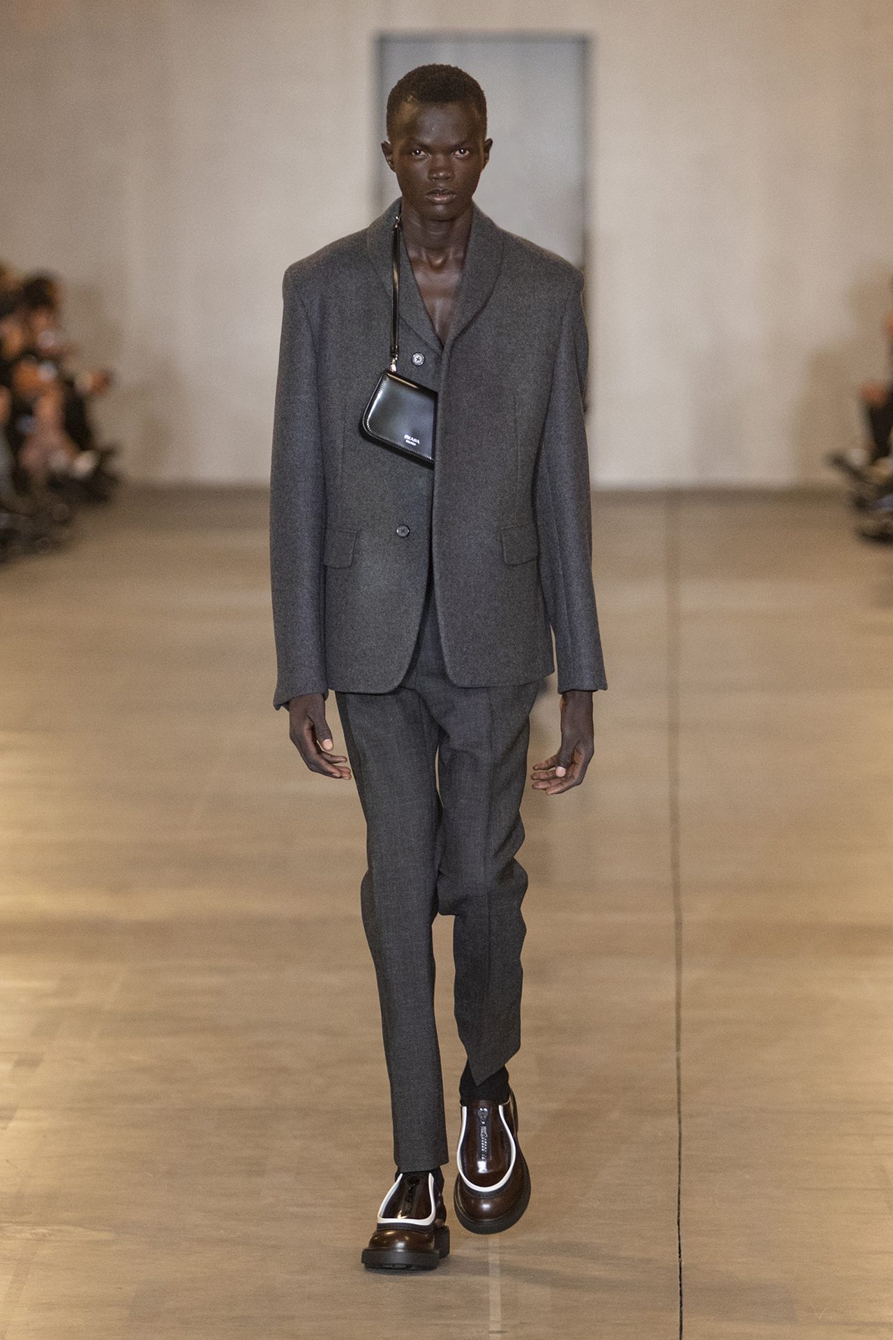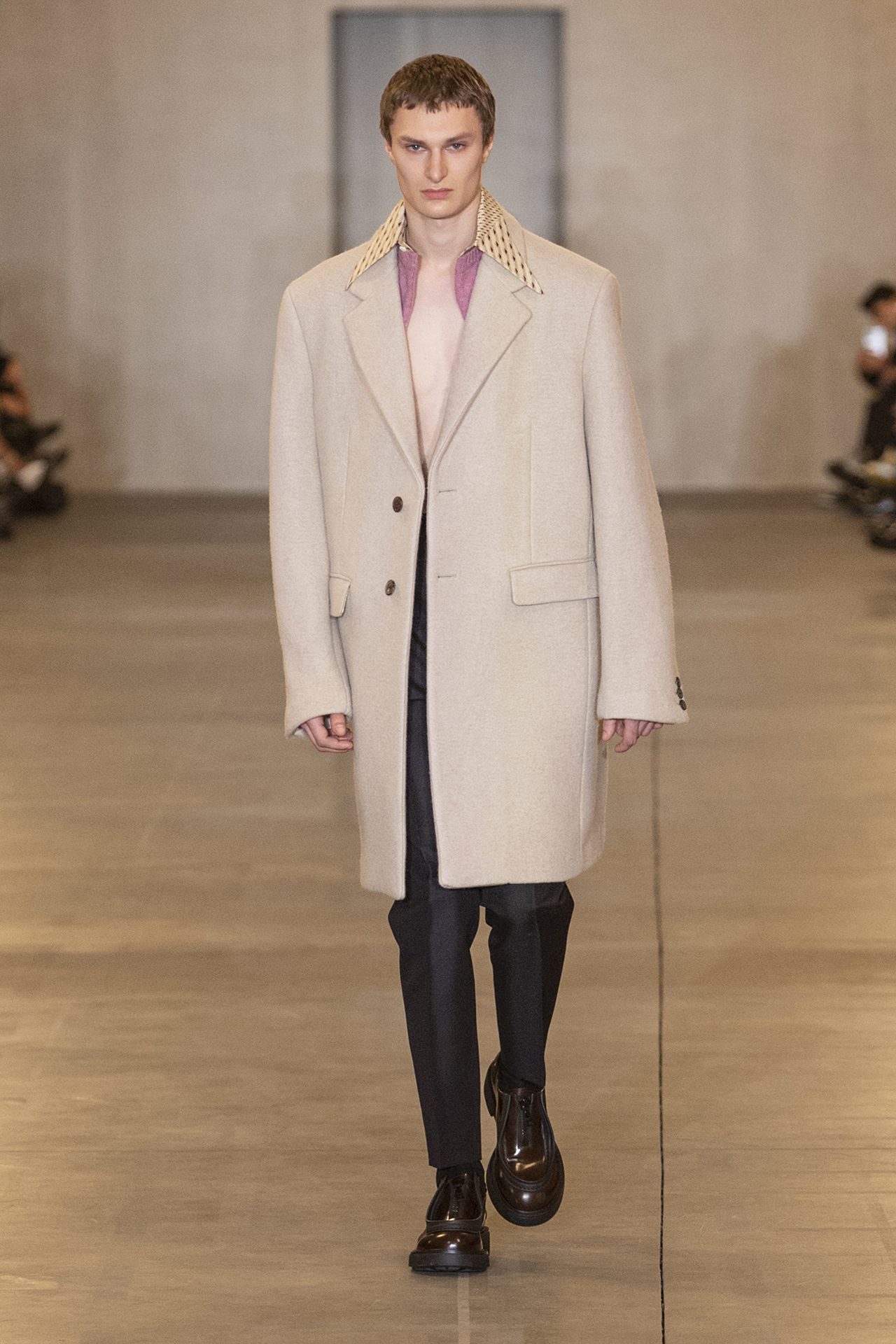 会場は、建築家の Rem Koolhaas (レム・コールハース) 率いる AMO が手掛けたプラダ財団の Deposito ショースペース。ショーでは、天井がゆっくりと上昇し、親密な空間が壮大な空間へと変化した。スケールが変わることでウェアに対しての視点も変化させるこの演出は、長く伸びていたり、短く切り詰められたウェアそのものと呼応する。