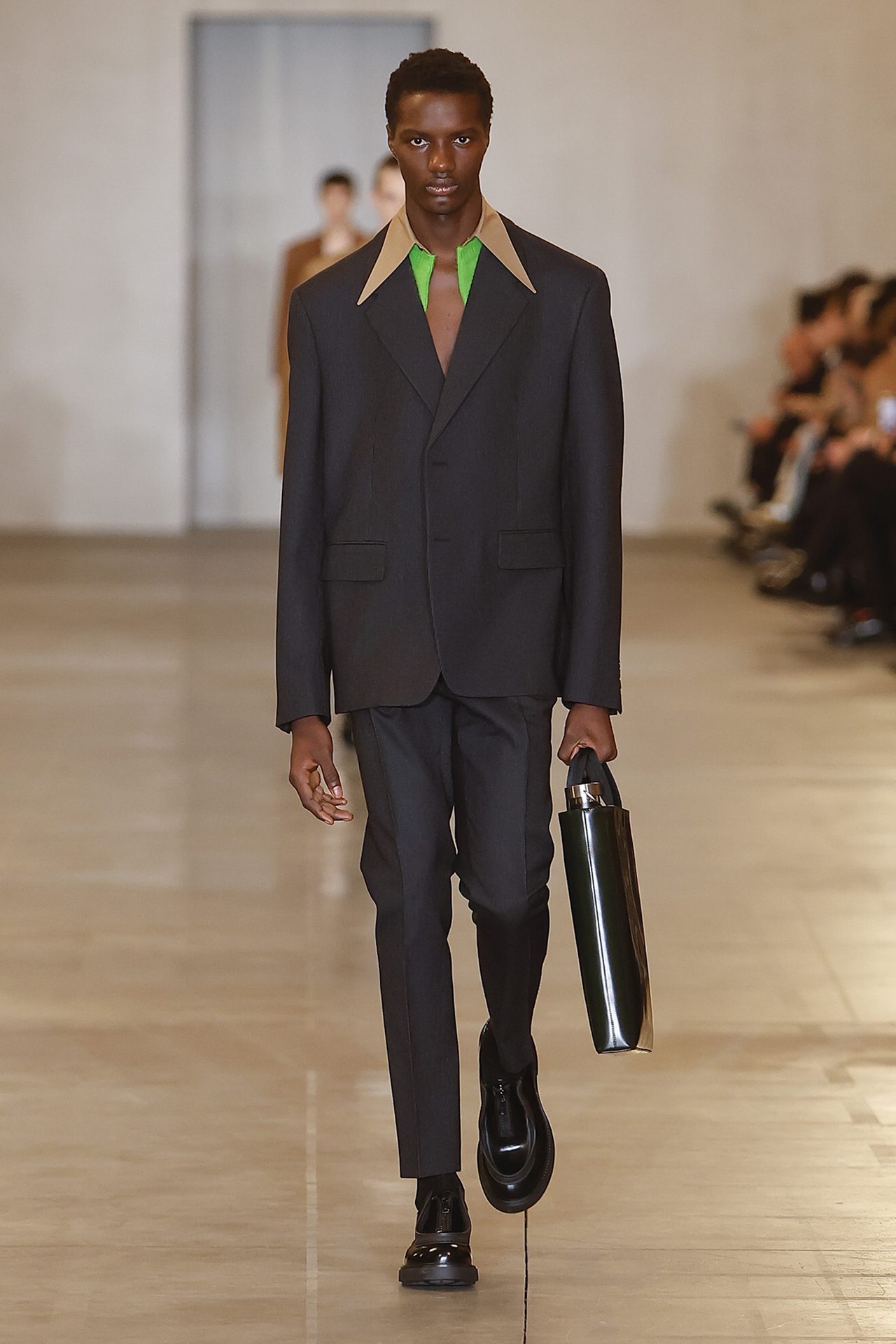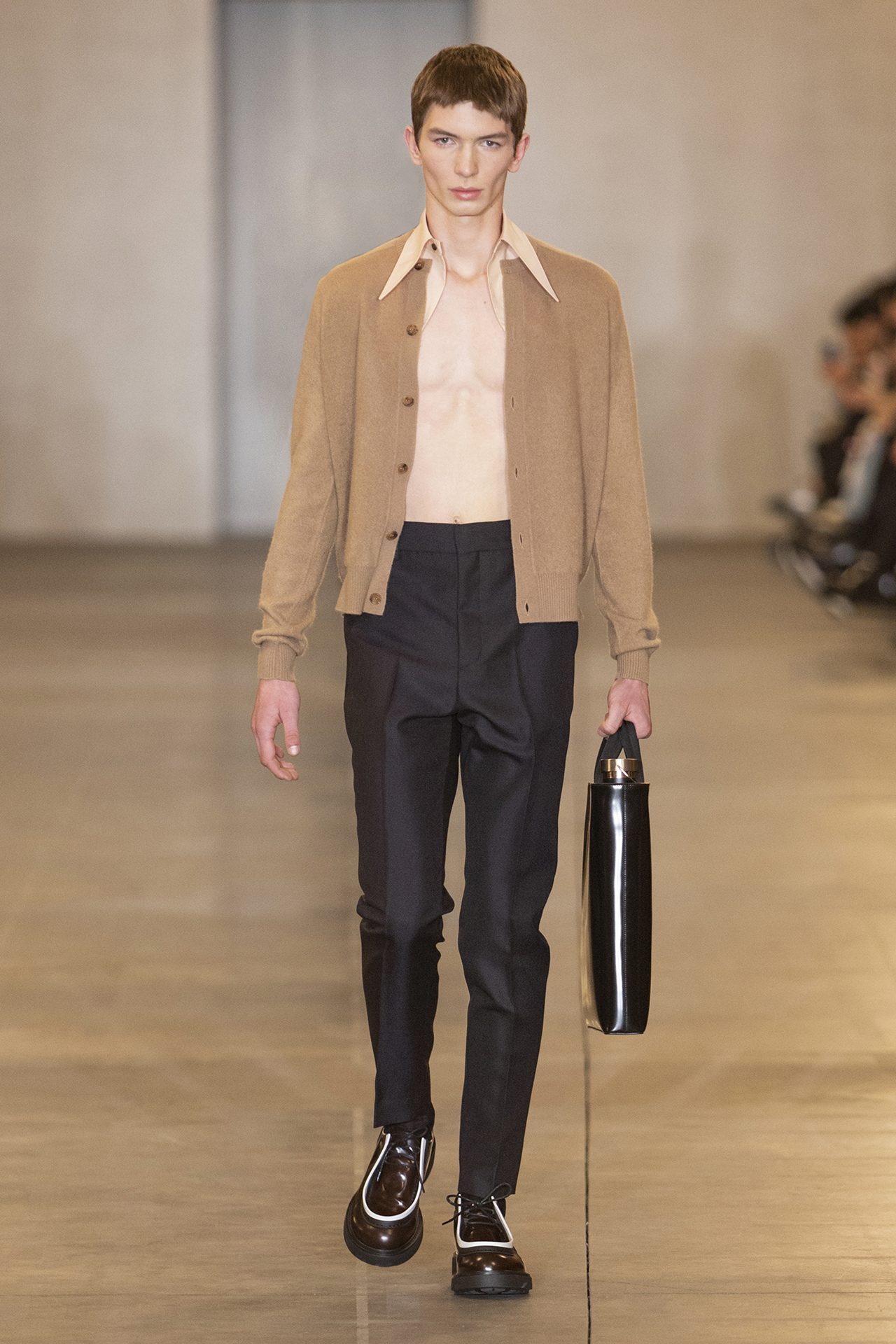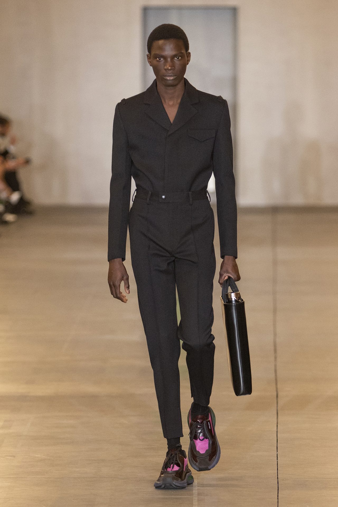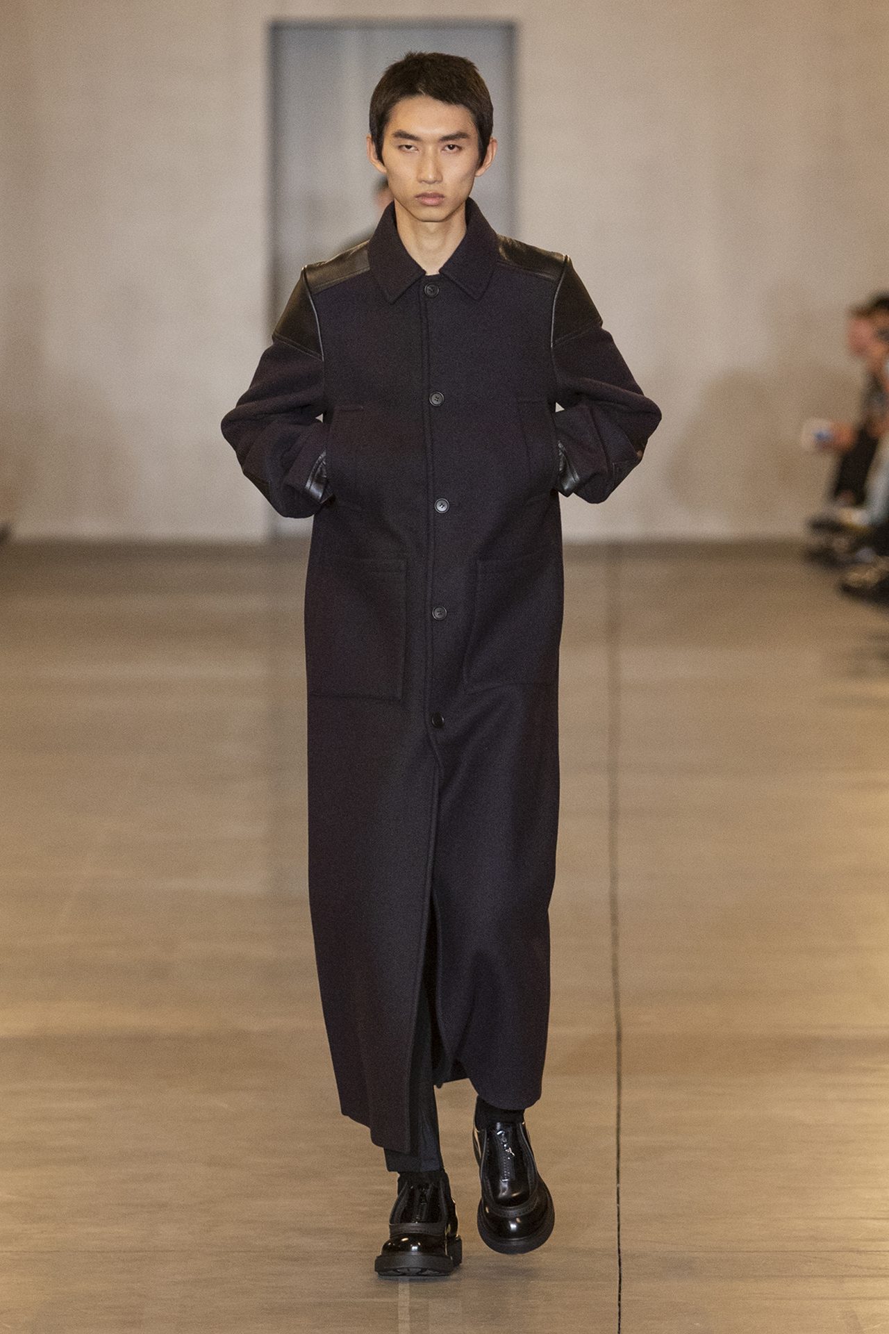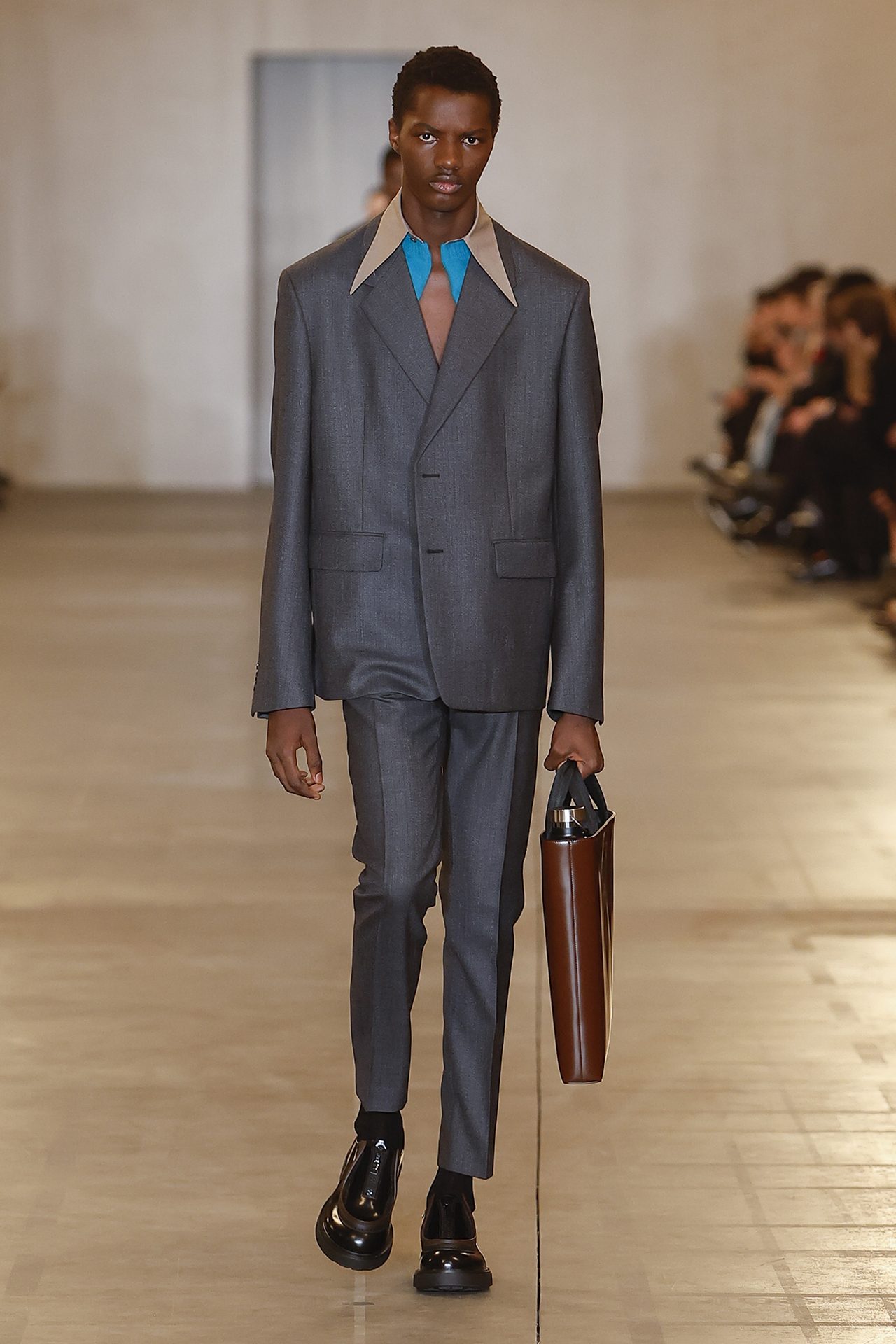 会場は、建築家の Rem Koolhaas (レム・コールハース) 率いる AMO が手掛けたプラダ財団の Deposito ショースペース。ショーでは、天井がゆっくりと上昇し、親密な空間が壮大な空間へと変化した。スケールが変わることでウェアに対しての視点も変化させるこの演出は、長く伸びていたり、短く切り詰められたウェアそのものと呼応する。