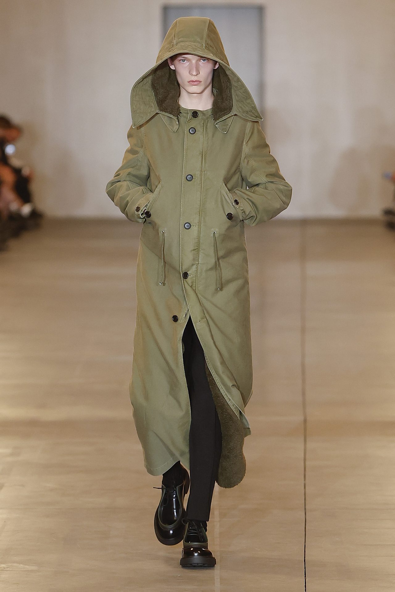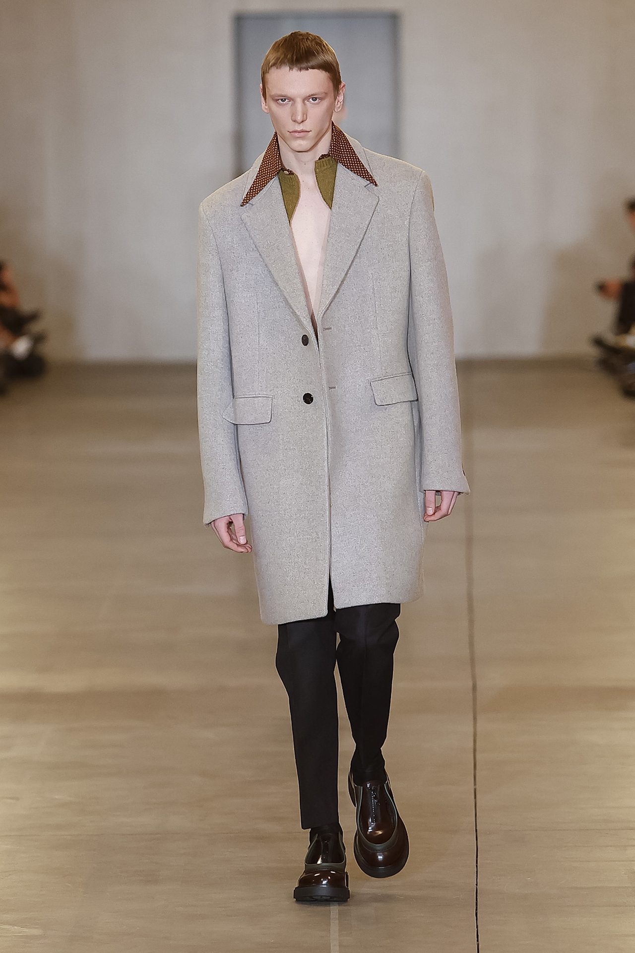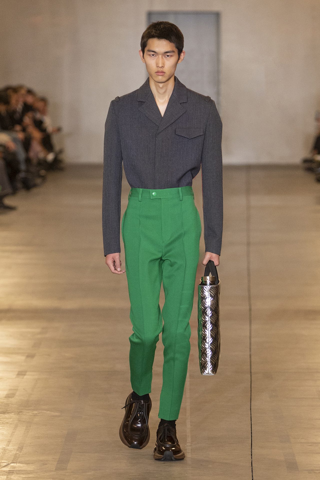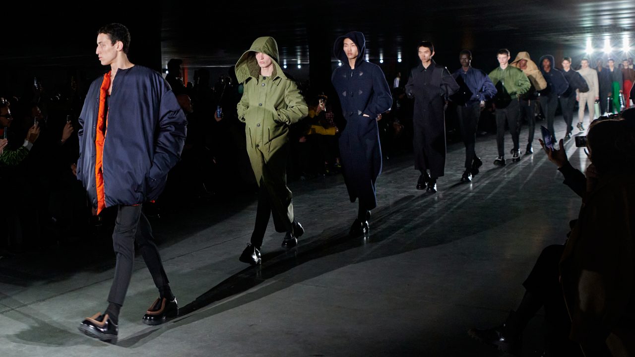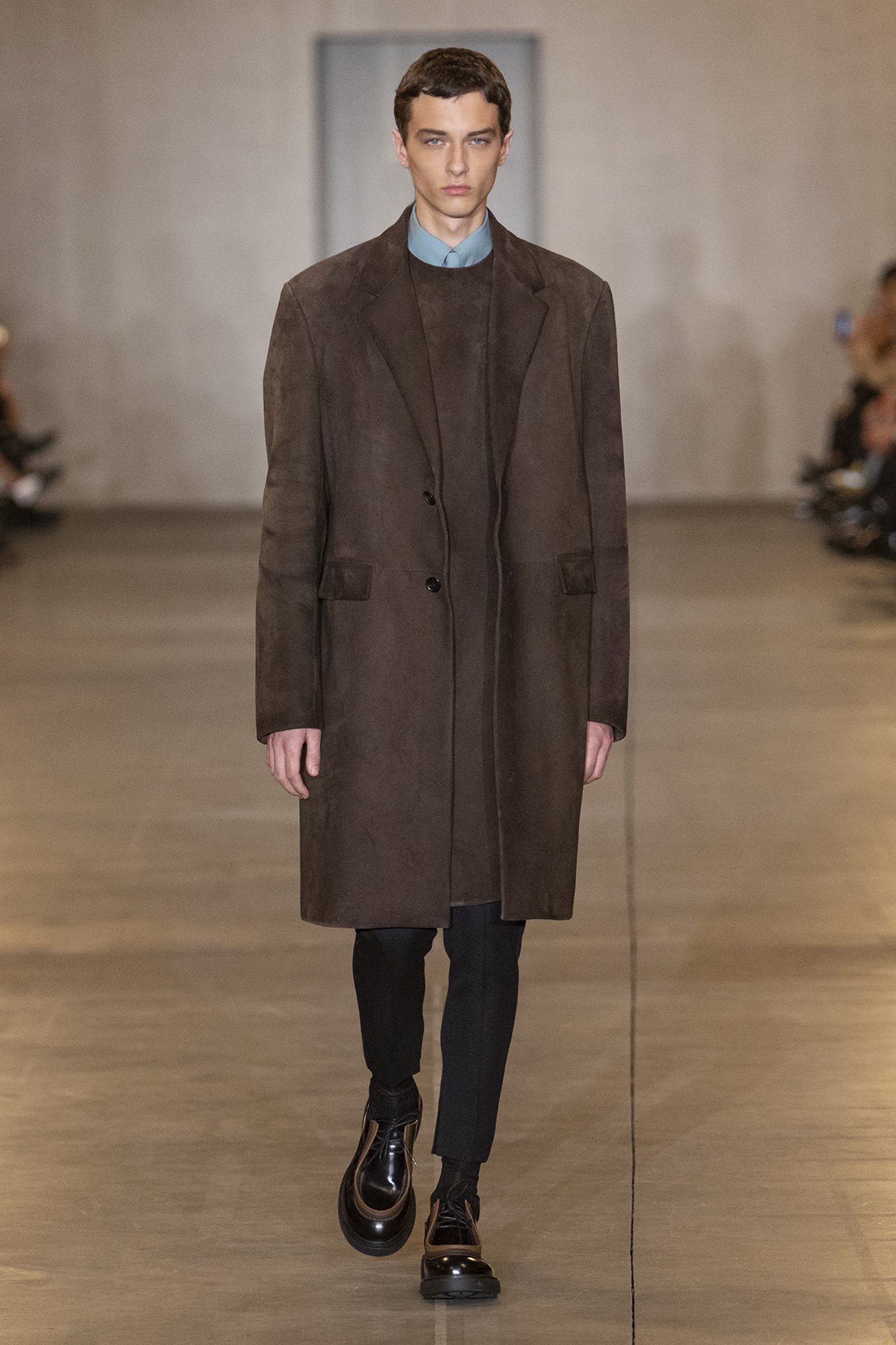 会場は、建築家の Rem Koolhaas (レム・コールハース) 率いる AMO が手掛けたプラダ財団の Deposito ショースペース。ショーでは、天井がゆっくりと上昇し、親密な空間が壮大な空間へと変化した。スケールが変わることでウェアに対しての視点も変化させるこの演出は、長く伸びていたり、短く切り詰められたウェアそのものと呼応する。
