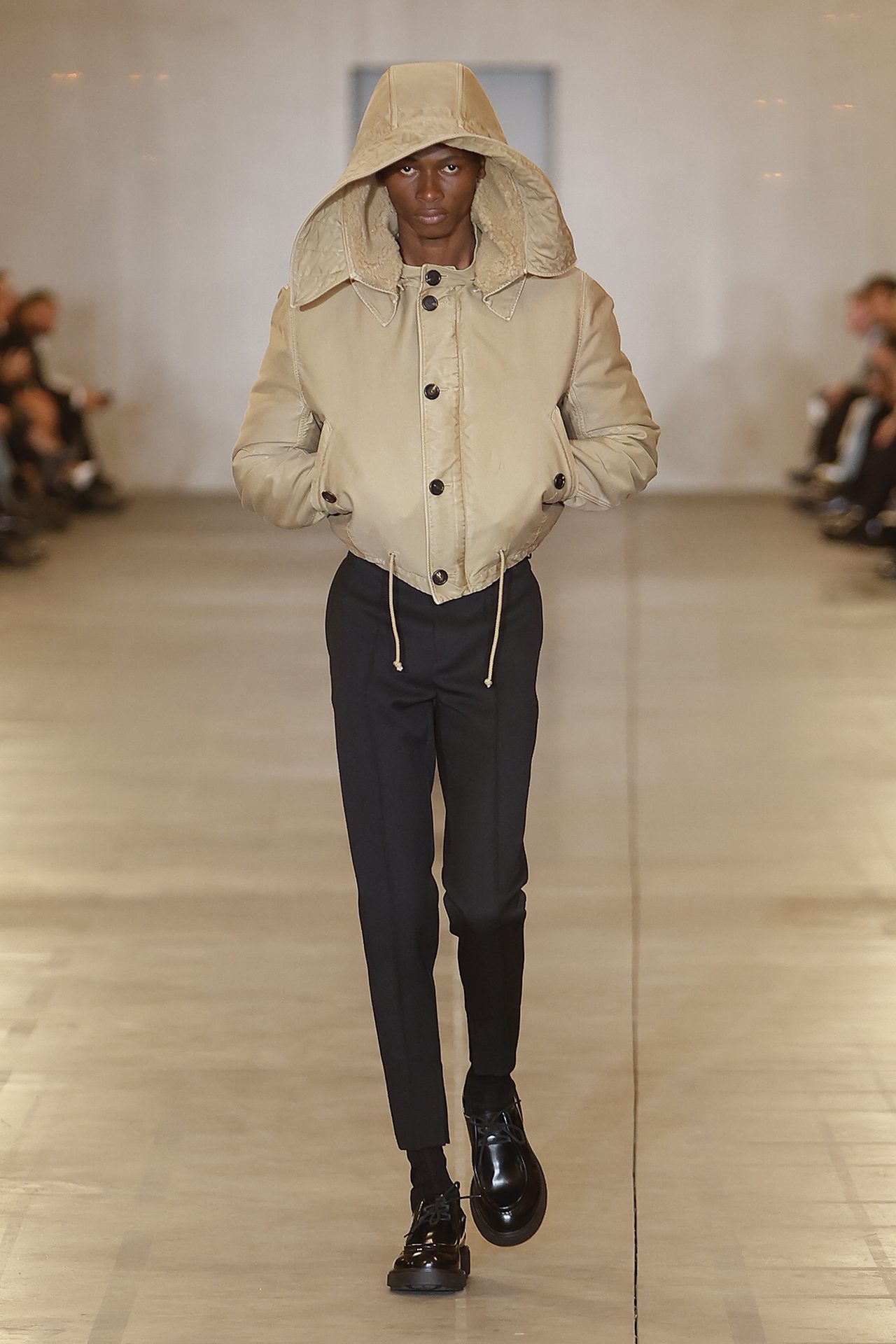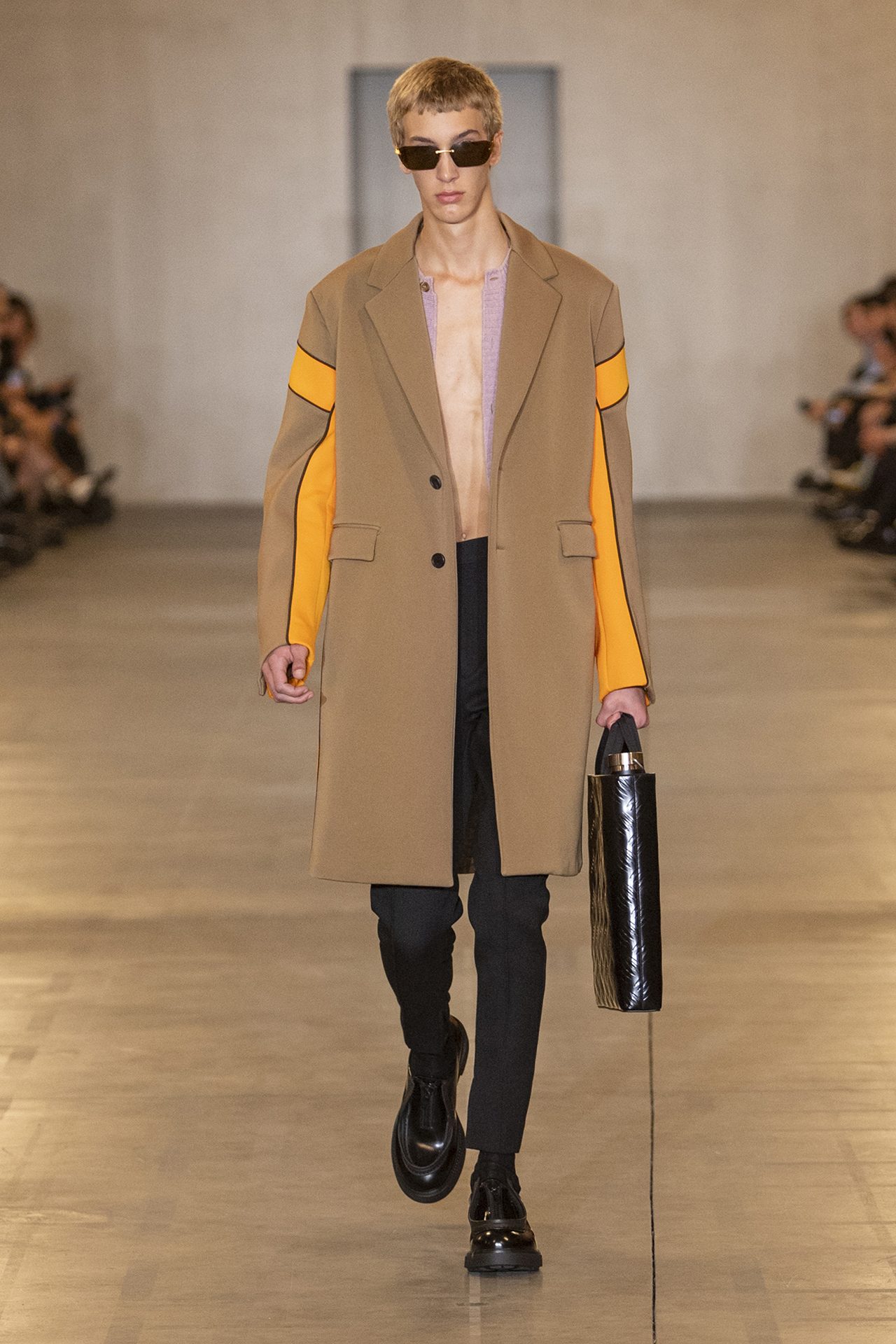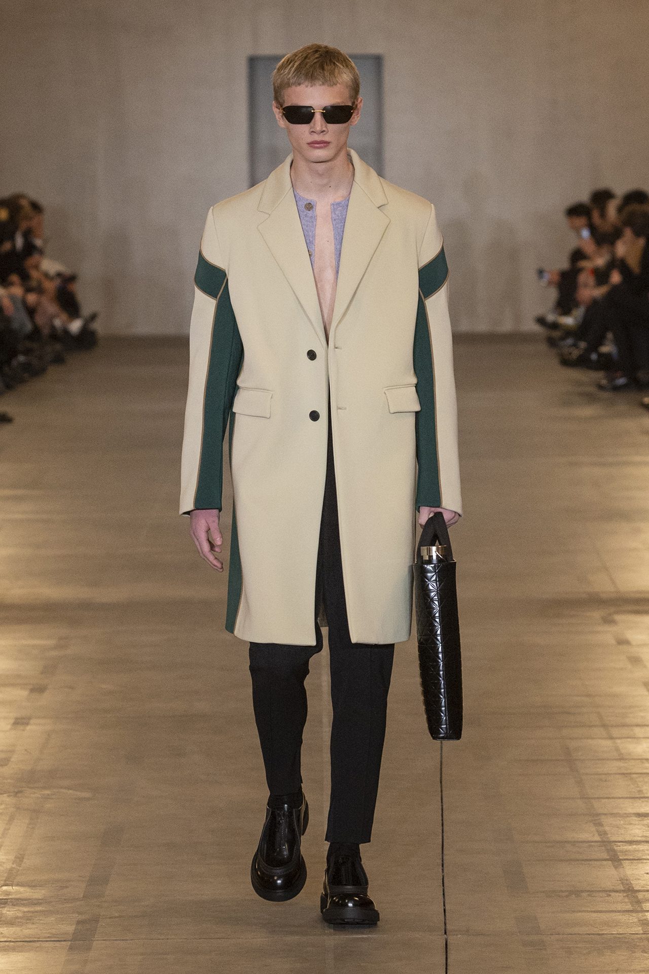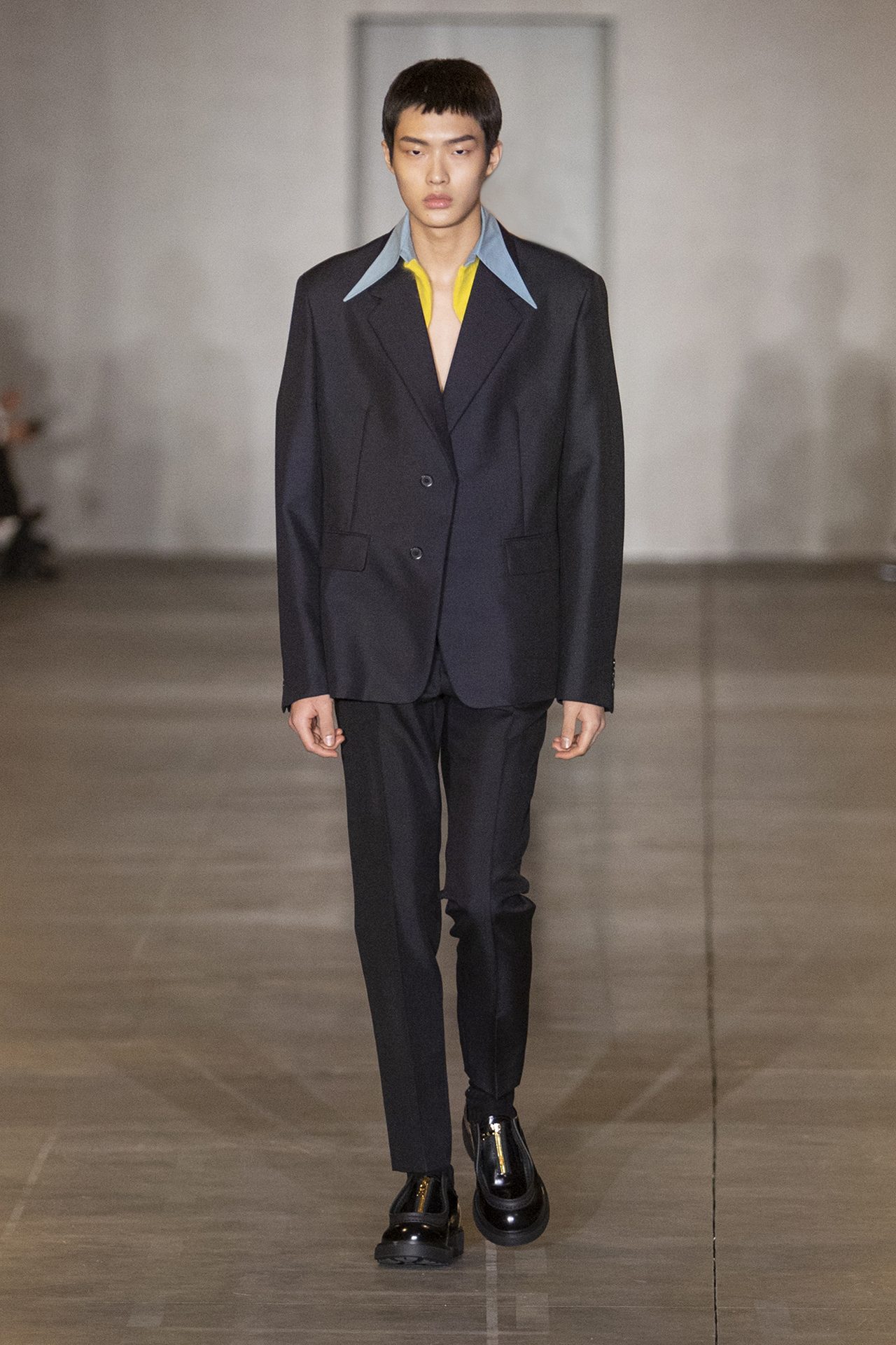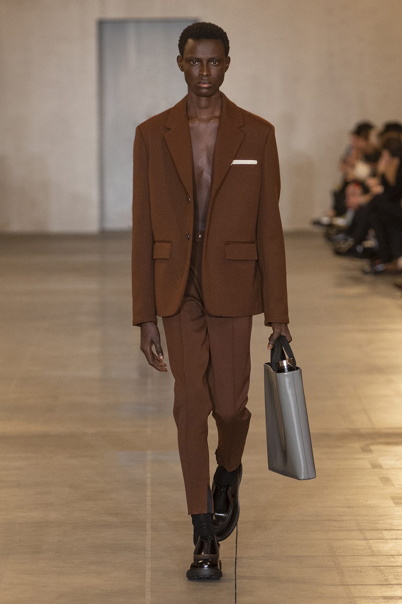 会場は、建築家の Rem Koolhaas (レム・コールハース) 率いる AMO が手掛けたプラダ財団の Deposito ショースペース。ショーでは、天井がゆっくりと上昇し、親密な空間が壮大な空間へと変化した。スケールが変わることでウェアに対しての視点も変化させるこの演出は、長く伸びていたり、短く切り詰められたウェアそのものと呼応する。